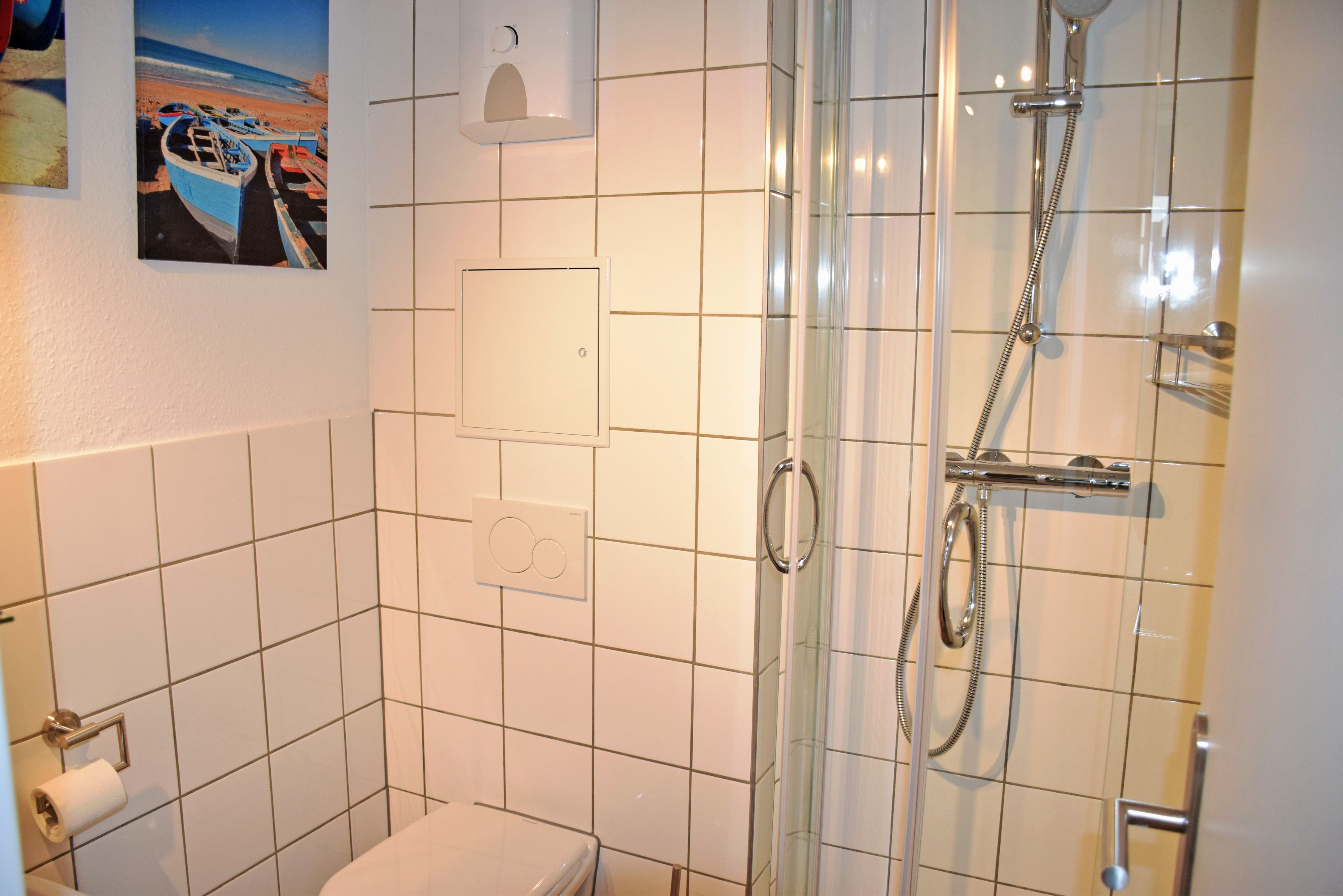 Das moderne Bad ist mit Dusche, WC, Waschbecken, Spiegel und Föhn ausgestattet.