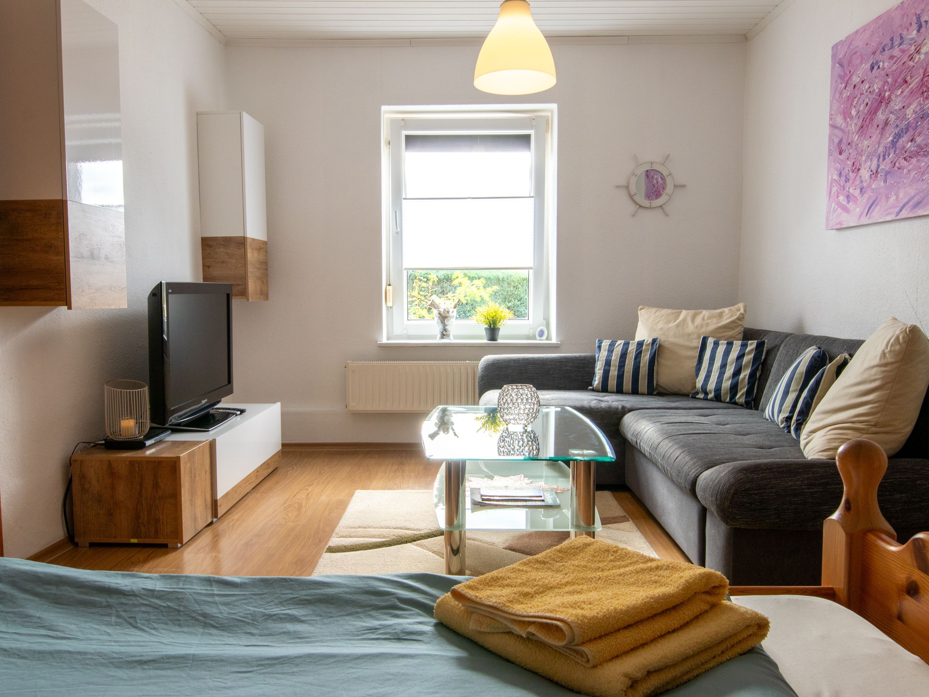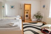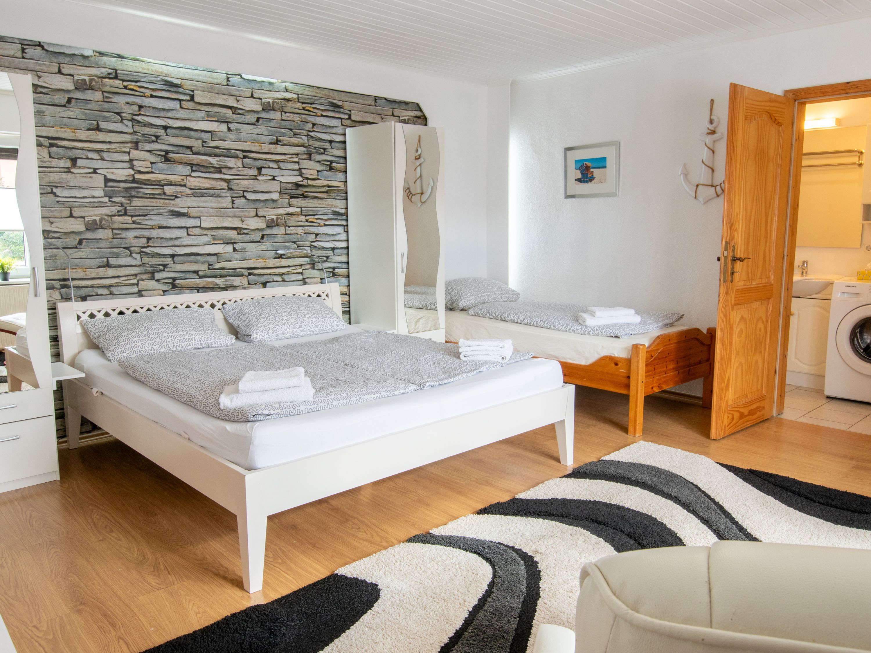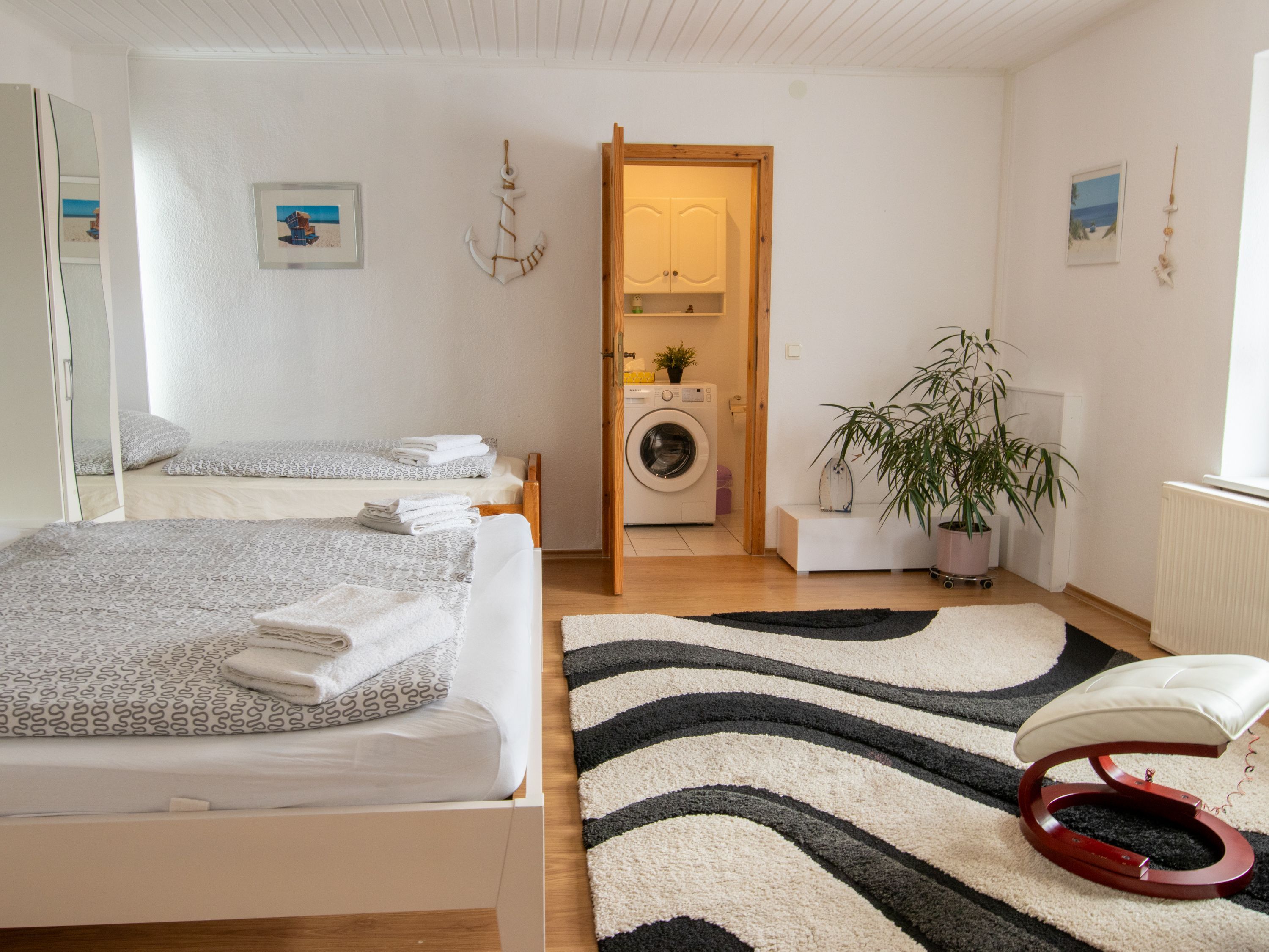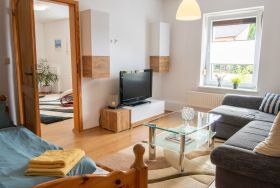Die 60m² Ferienwohnung für 4 Personen hat ein Wohnzimmer, welches mit einem französischen Bett (140x200), Couchtisch, Anbauwand mit Flachbildfernseher ausgestattet ist. Im Schlafzimmer befindet sich ein Doppelbett (180x200, getrennte Matratzen), Sideboard und zwei Einzelbetten (90x200). Die Küche ist komplett ausgestattet mit Backofen, Kühlschrank mit Gefrierfach, Mikrowelle mit Grillfunktion, Geschirr und Besteck, Kaffeemaschine, automatisierte Kaffeemaschine mit Kapselsystem, Wasserkocher, Geschirrspülmaschine. Das Bad verfügt über eine Dusche, WC, Waschtisch und eine Waschmaschine.