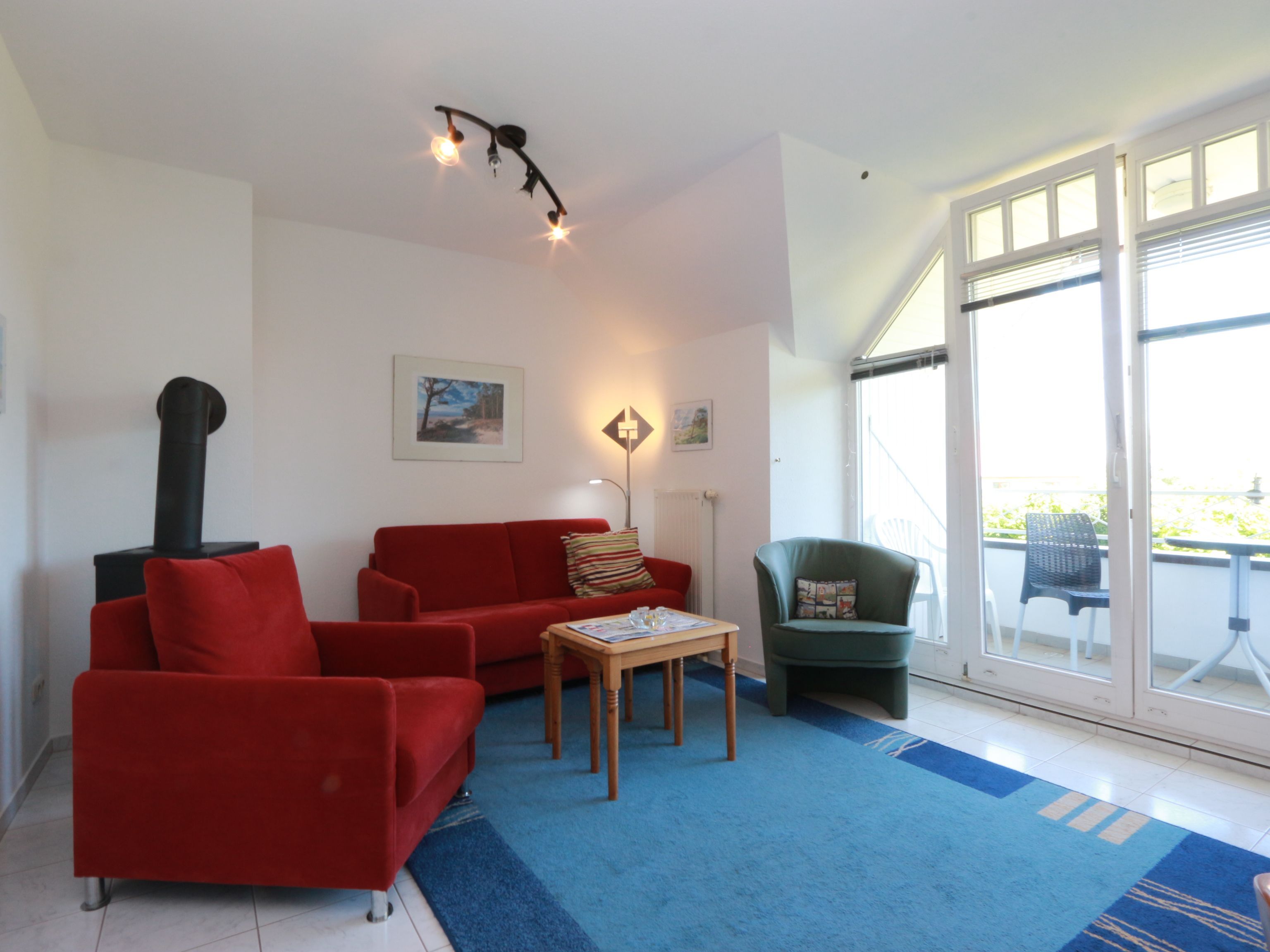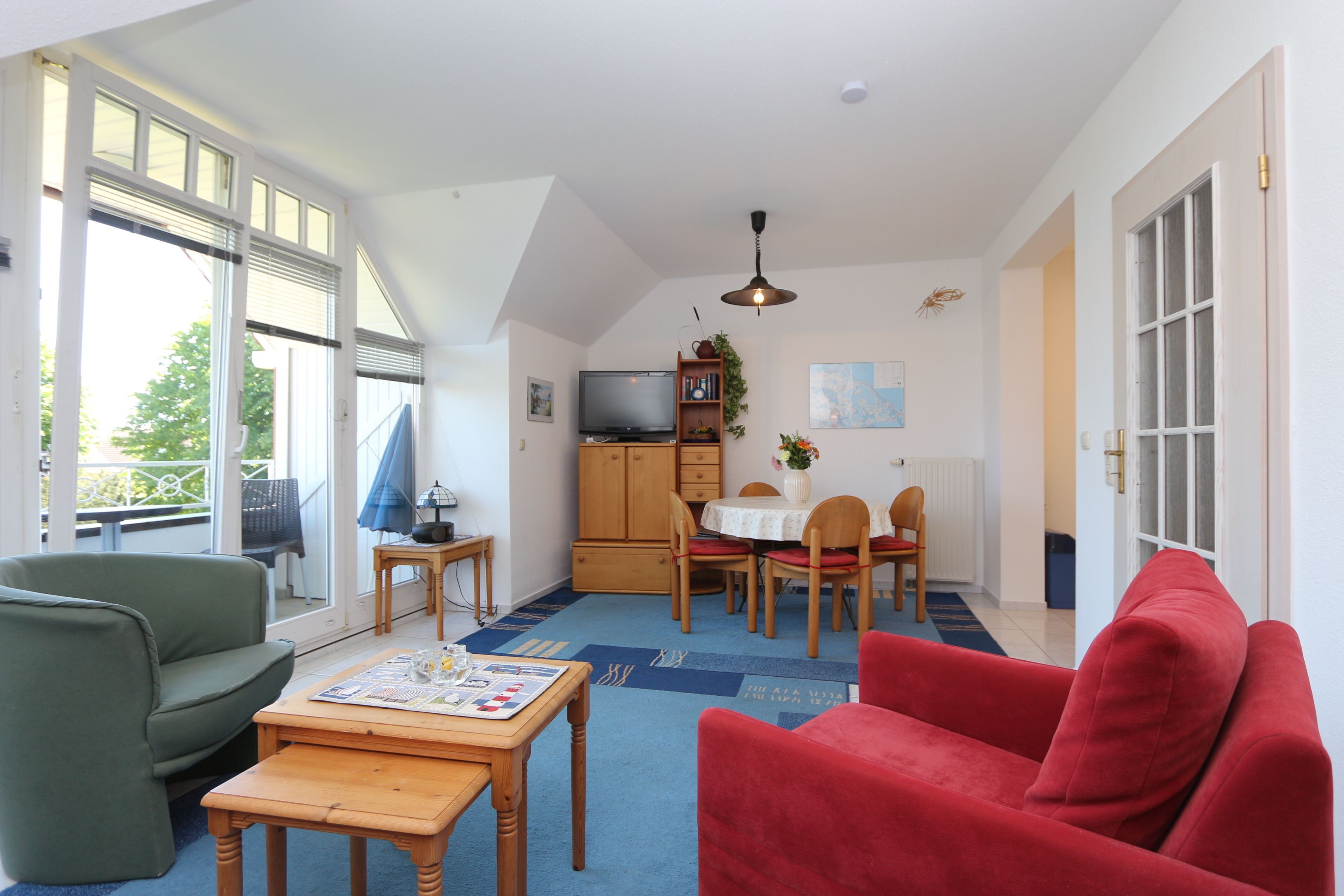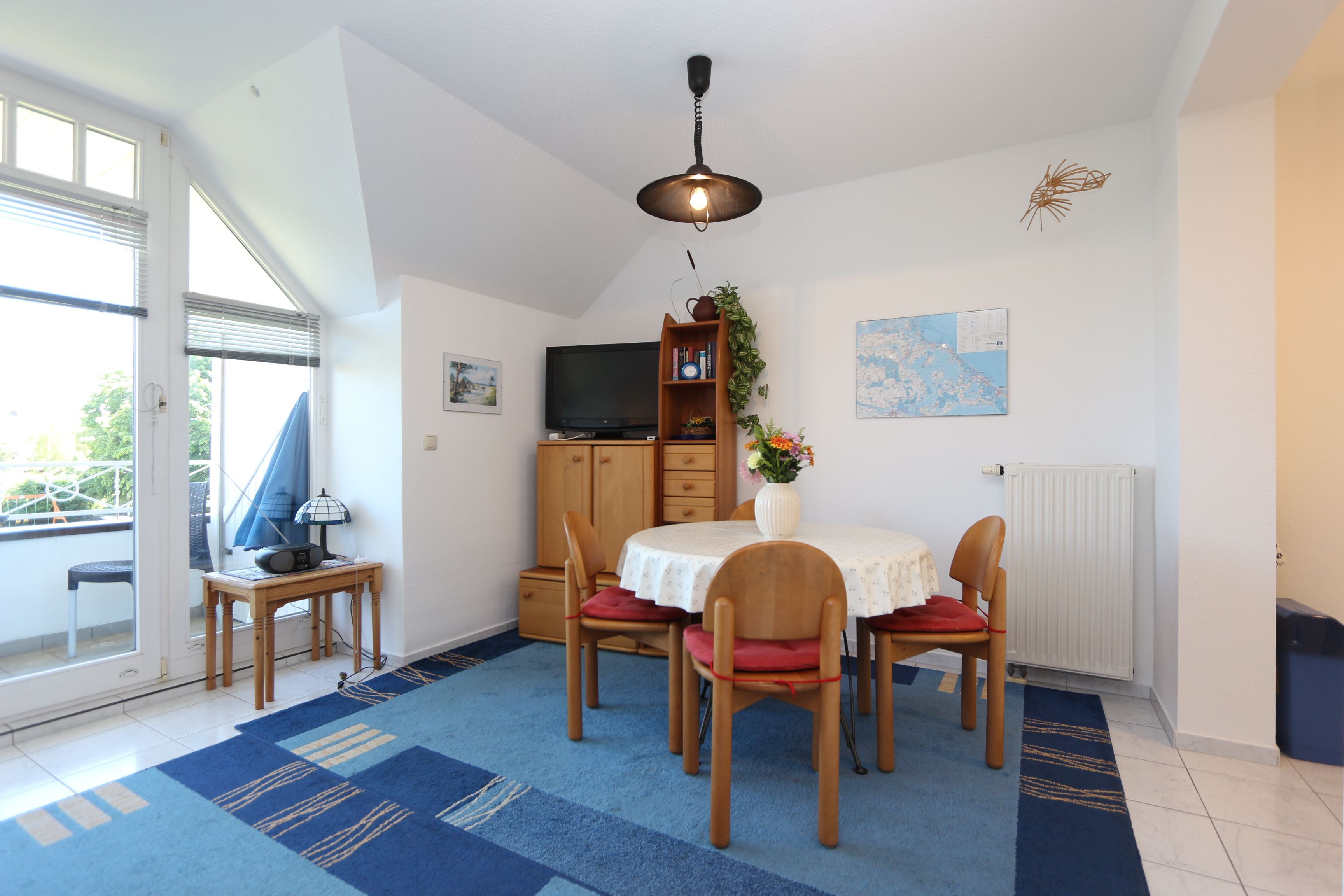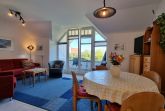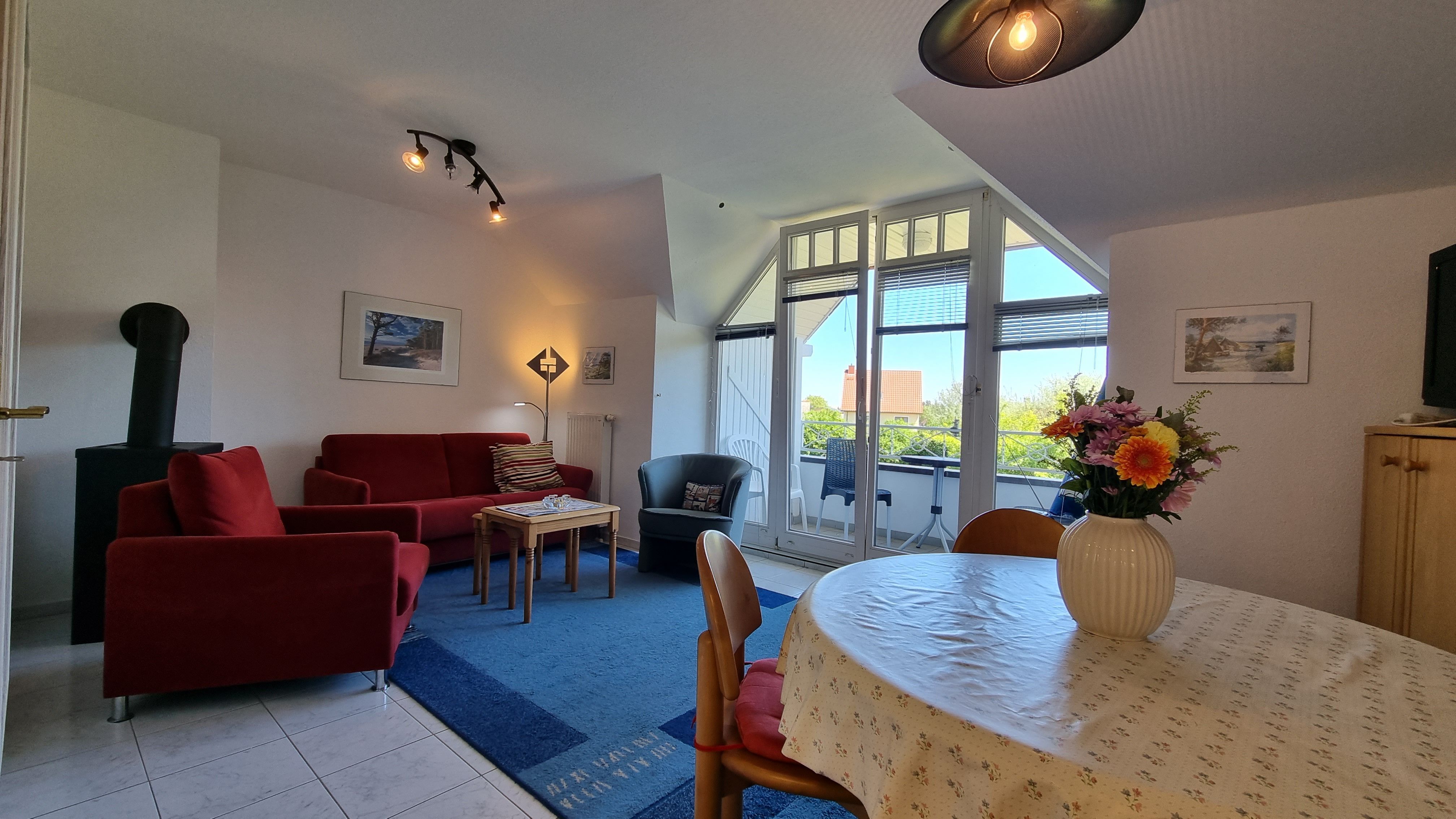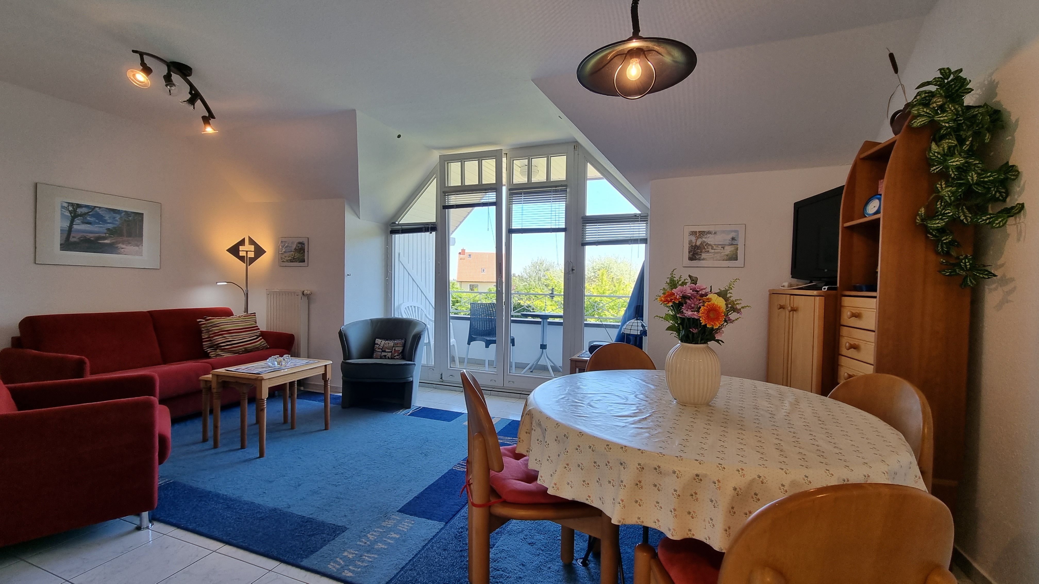 • Das Wohnzimmer verfügt ein Schlafsofa (Aufbettung für die 3. und 4. Person) und einen Essbereich für 4 Personen.
