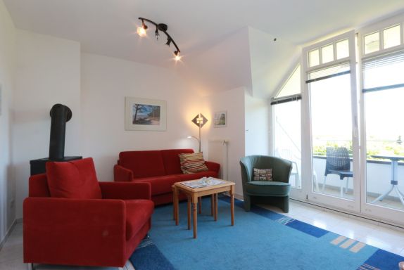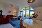 Ferienwohnung für 2-4 Personen inkl. Kleinkind (ca. 44 m²) im Dachgeschoss mit Wohn- und Esszimmer, Schlafzimmer, offener Küche, Bad und Balkon.