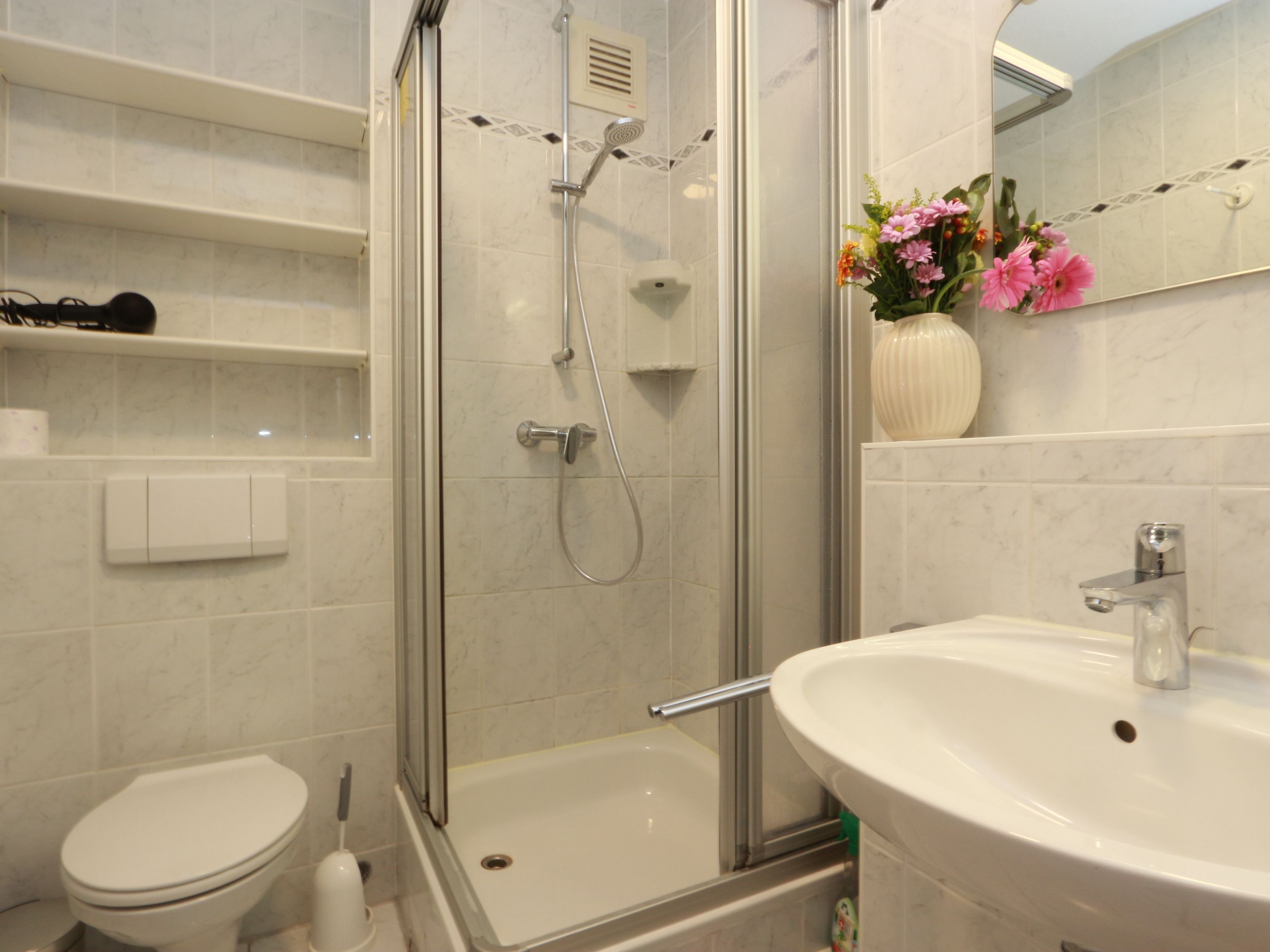 • Das innenliegende Badezimmer verfügt über eine Dusche mit WC, Waschbecken, Fön und einem Handtuchtrockenheizkörper.