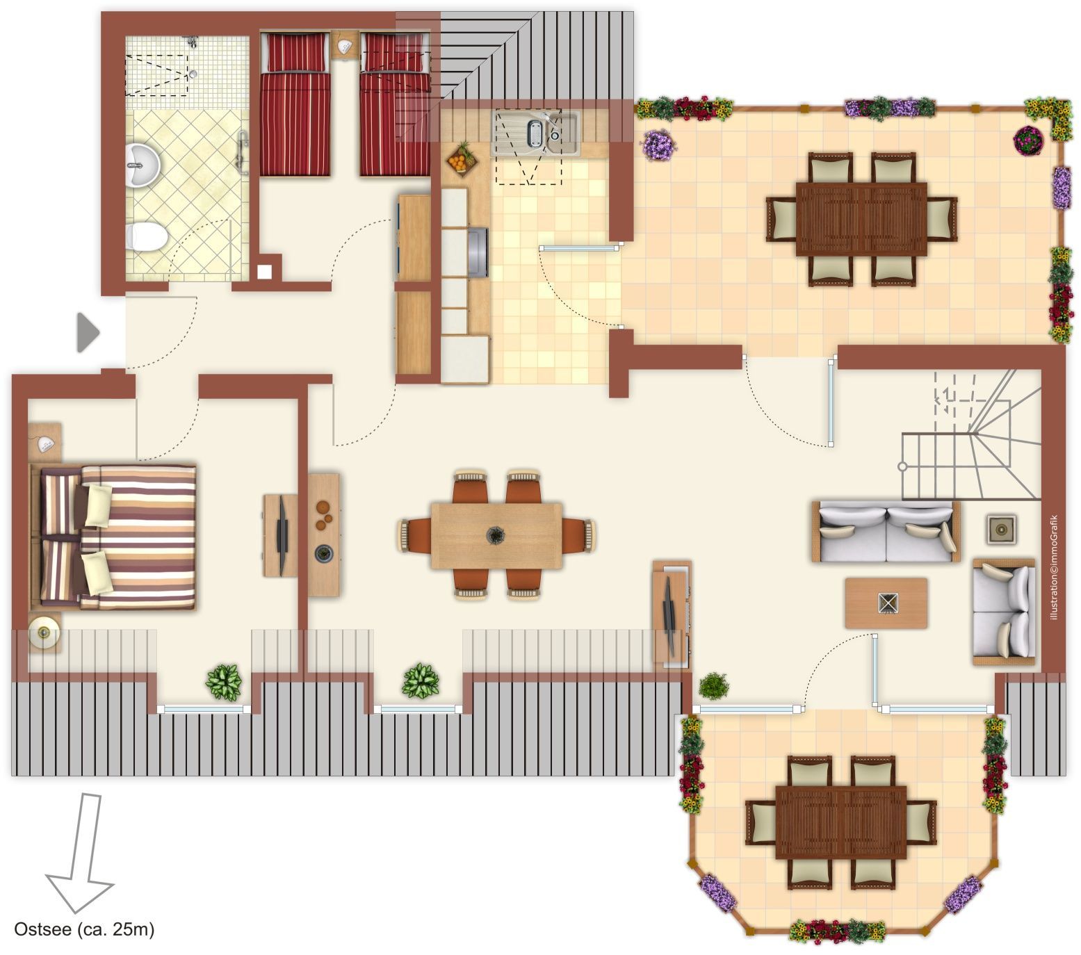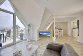 Unsere 4-Zimmer-Ferienwohnung Ostseeblick in Scharbeutz bietet Familien mit max. 6 Erwachsenen und 1 Kleinkind (0-3 Jahre) viel Komfort und Platz. Die 85m² Ferienwohnung im 2. und 3. OG verfügt über 1 großes Wohnzimmer mit Essbereich mit Blick auf die Ostsee, 3 Schlafzimmer, 2 Duschbäder, 1 Küche, 2 Balkone Meerblick/Abendsonne, WLAN usw. Ein Parkplatz sowie eine großzügige Fahrradgarage befindet sich direkt am Haus. Zusätzlich steht Ihnen eine Waschmaschine und ein Wäschetrockner im Keller im Hauswirtschaftsraum zur Verfügung. Vom ersten Balkon und vom Wohnzimmer blicken Sie über die Fußgängerzone direkt zum Strand bzw. zur Seebrücke von Scharbeutz. Vom zweiten Balkon blicken Sie in den sonnigen Westen in Richtung Kurpark und können von dort in aller Ruhe die Abendsonne genießen. Sobald Sie das Haus verlassen befinden Sie sich mitten in der Fußgängerzone vom Scharbeutzer Strandzentrum. Hier finden Sie Restaurants, Cafés, Geschäfte, Spielplätze, den Kurpark und vieles mehr. Scharbeutz bietet alles für einen perfekten Urlaub. Der feine Sandstrand lädt zum Entspannen und Sonnenbaden ein, während die frische Meeresbriese für Erholung sorgt. Zahlreiche Rad-und Wanderwege bieten die Möglichkeit, die Umgebung zu erkunden. Ob Wassersport, Shopping oder einfach die Seele baumeln lassen Scharbeutz ist der ideale Ort, um dem Alltag zu entfliehen und unvergessliche Momente zu genießen.