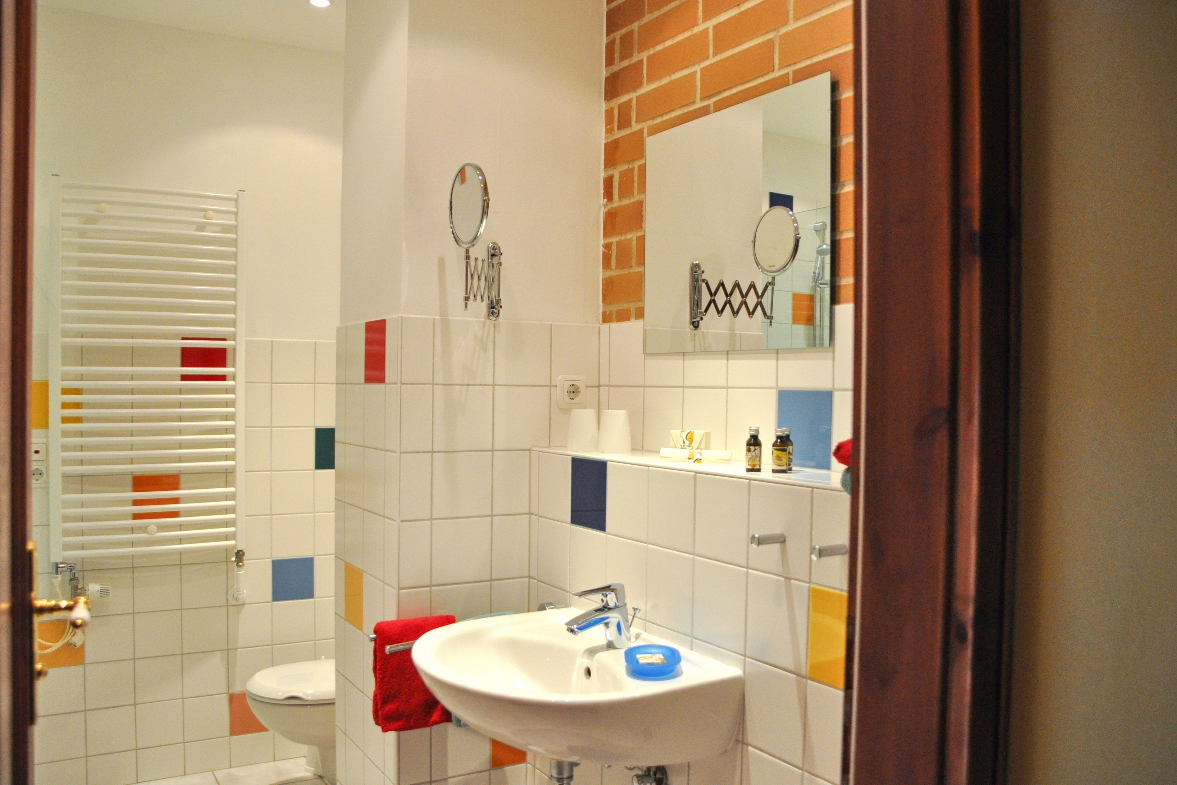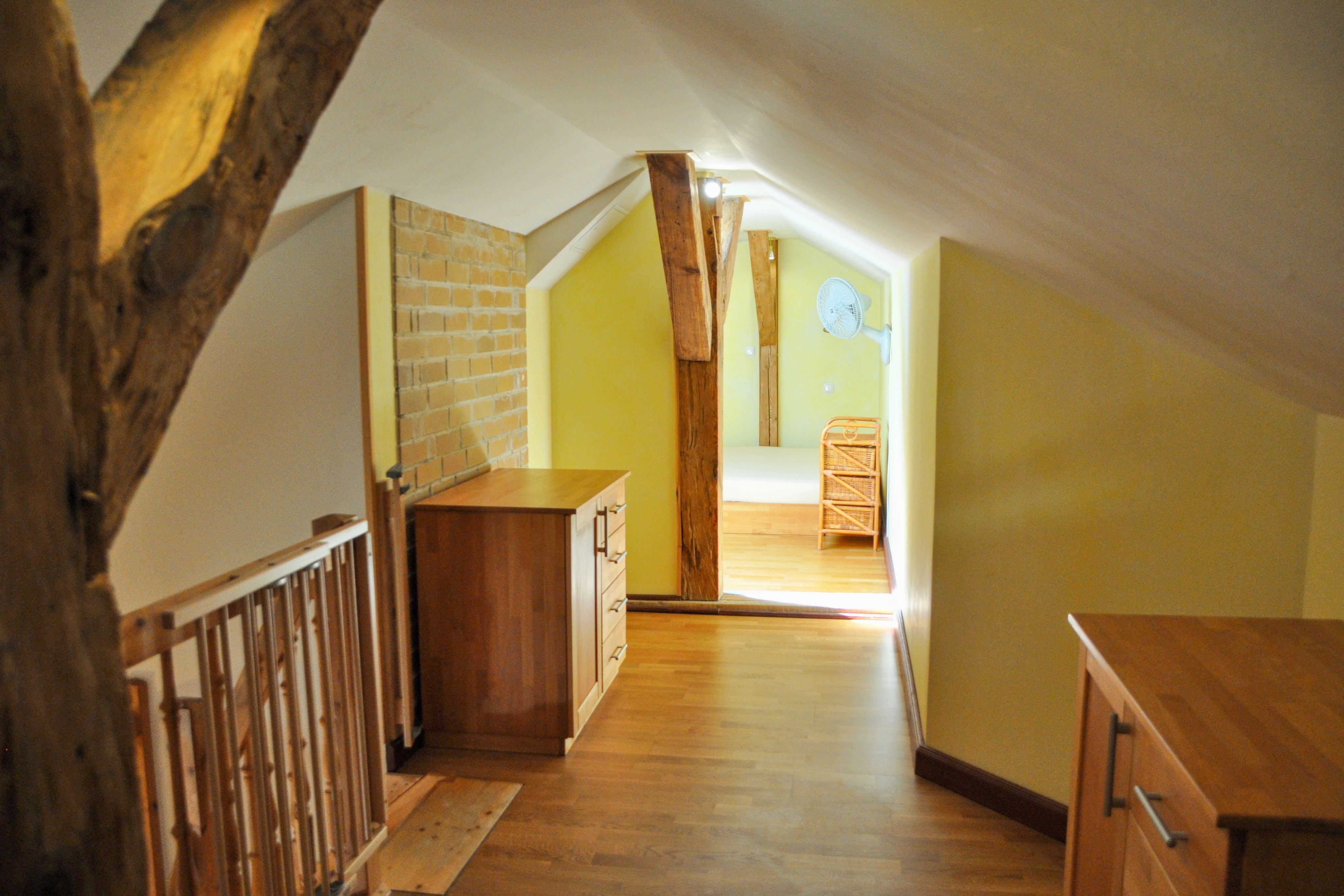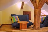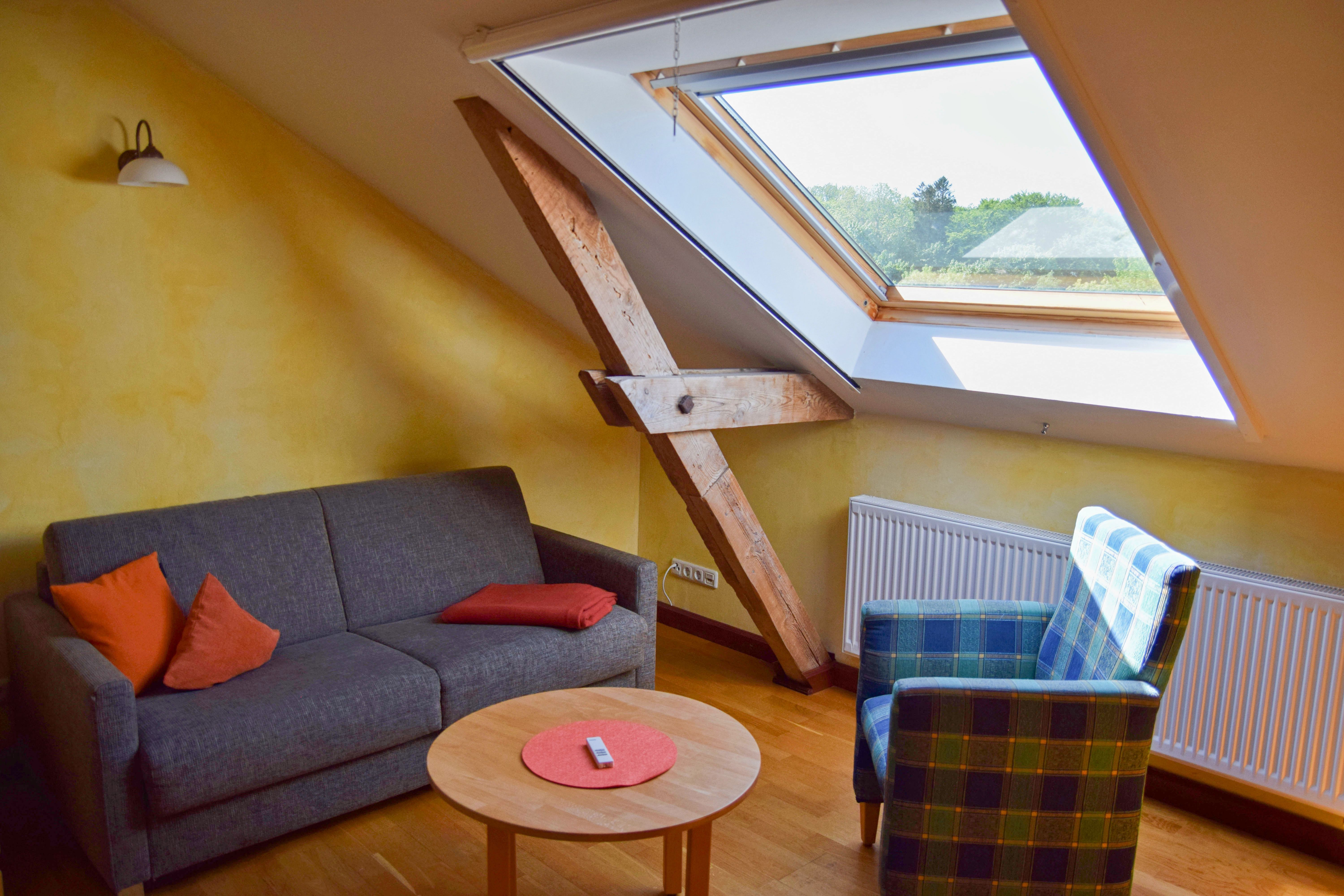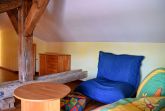 Sehr großzügige 3-Zimmer-Wohnung im Dachgeschoß (Dachschrägen). Wohnzimmer mit Sitzecke, Esstisch, Pantryküche und Schlafsofa. Schlafzimmer mit Doppelbett. Schlaf- und Wohnbereich für große Kinder auf der Galerie-Ebene, Treppe mit Treppengitter beidseitig gesichert. Geräumiges Bad mit Dusche. Gesamt-Wohnfläche: 79 m².