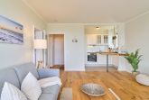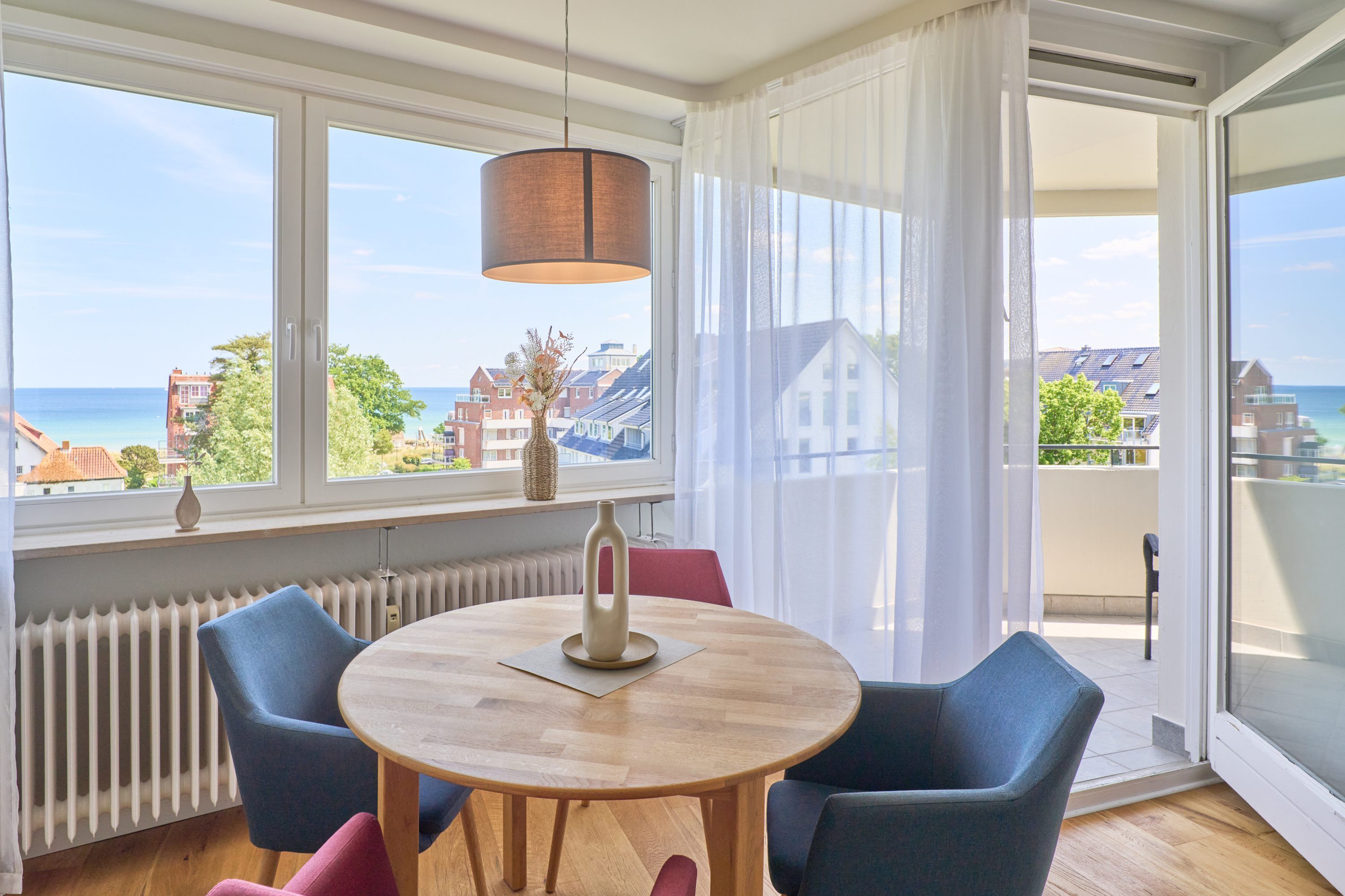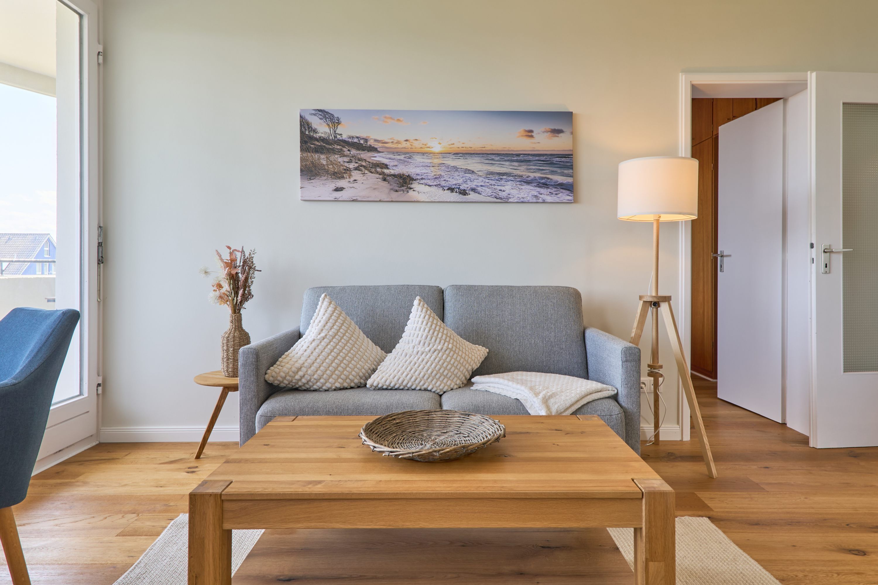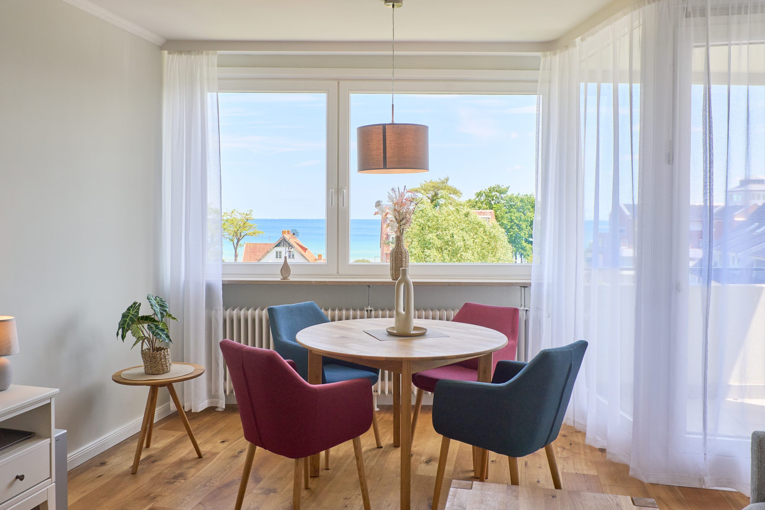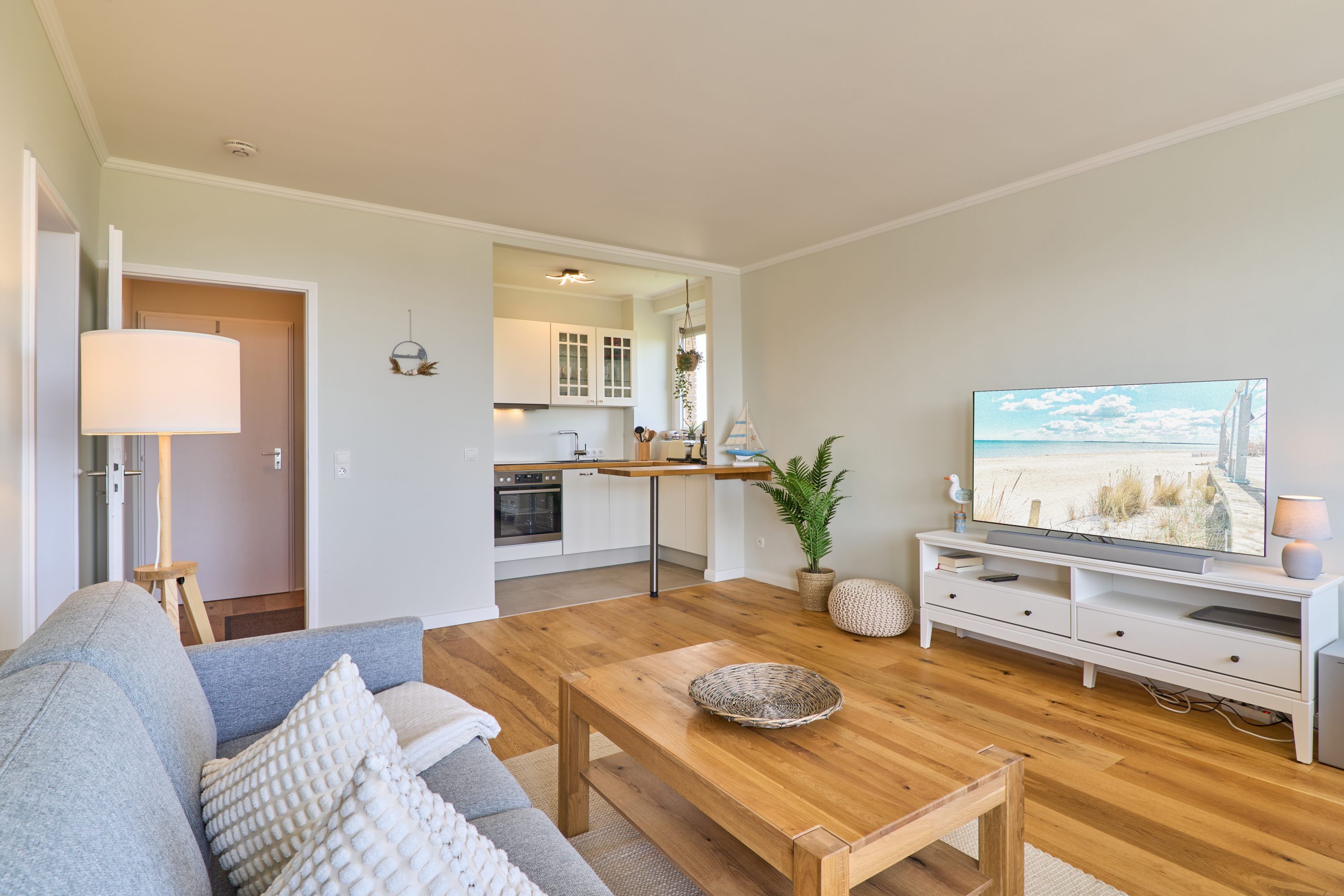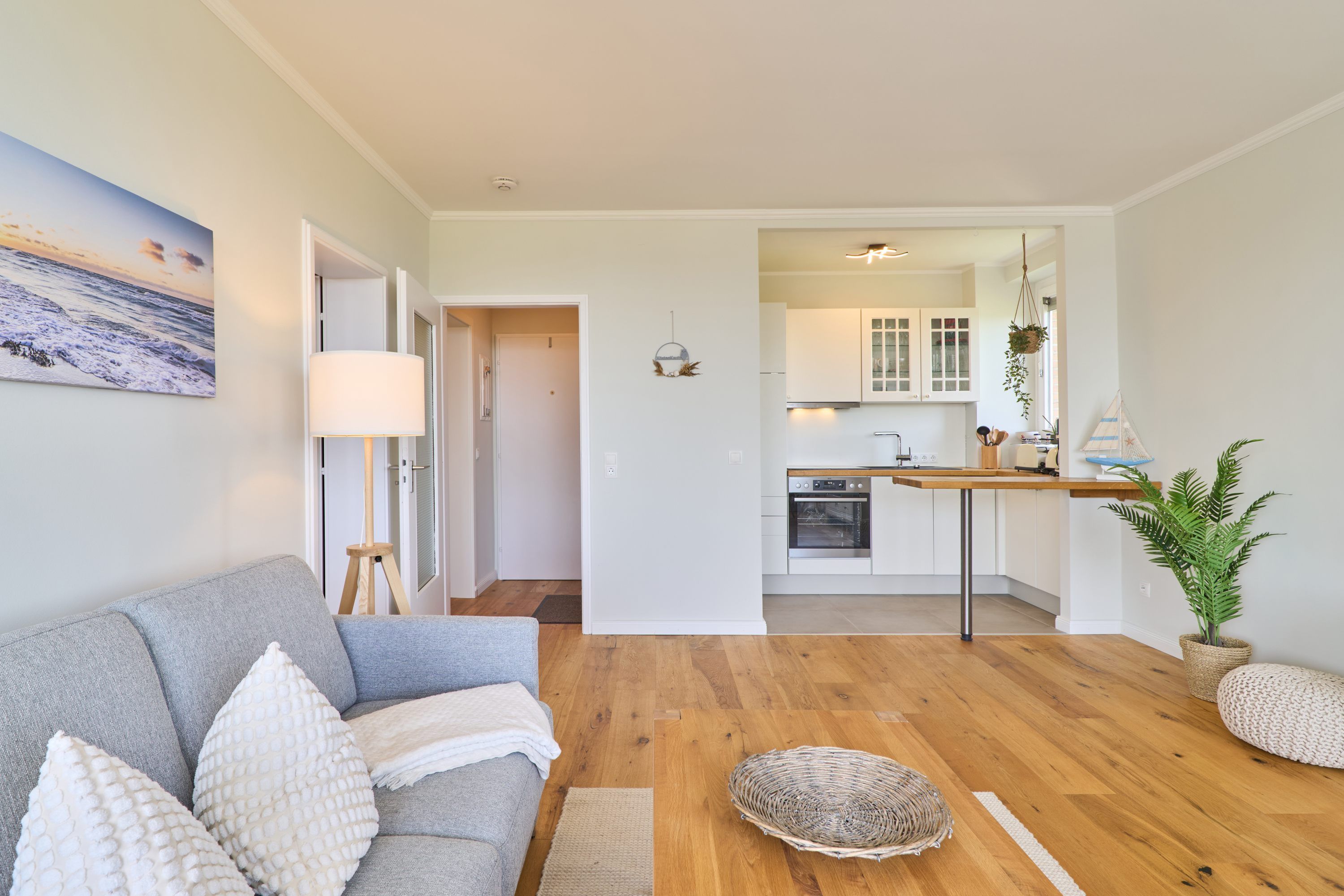 Diese sehr ansprechende Ferienwohnung bietet Ihnen einen gemütlichen Wohn-Essbereich. Genießen Sie den Blick auf die Ostsee schon vom Esstisch aus. Die Couch lässt sich mit nur wenigen Handgriffen in eine bequeme Schlafcouch verwandeln. Neben dem Smart TV steht Ihnen selbstverständlich kostenloses WLAN zur Verfügung. Der überdachte Balkon mit Blick auf die Ostsee ist mit Tisch und Stühlen ausgestattet. Die feine Küche ist u.a. mit einer Filterkaffeemaschine, Wasserkocher, Toaster ausgestattet.