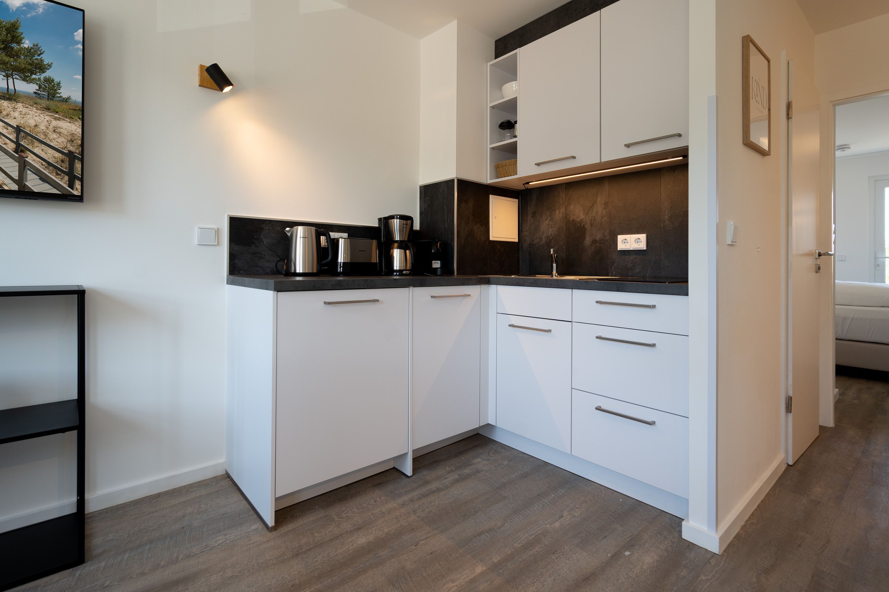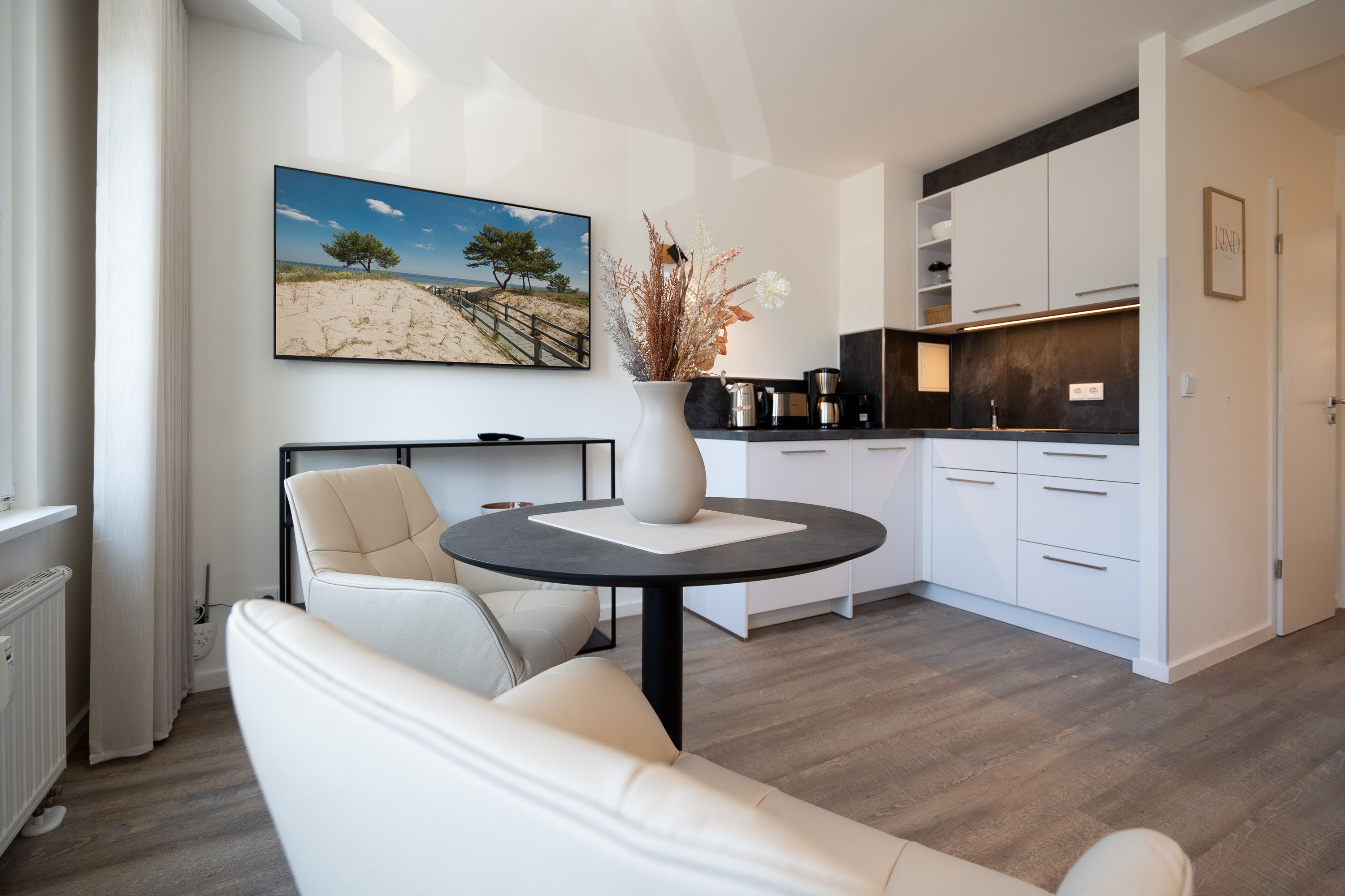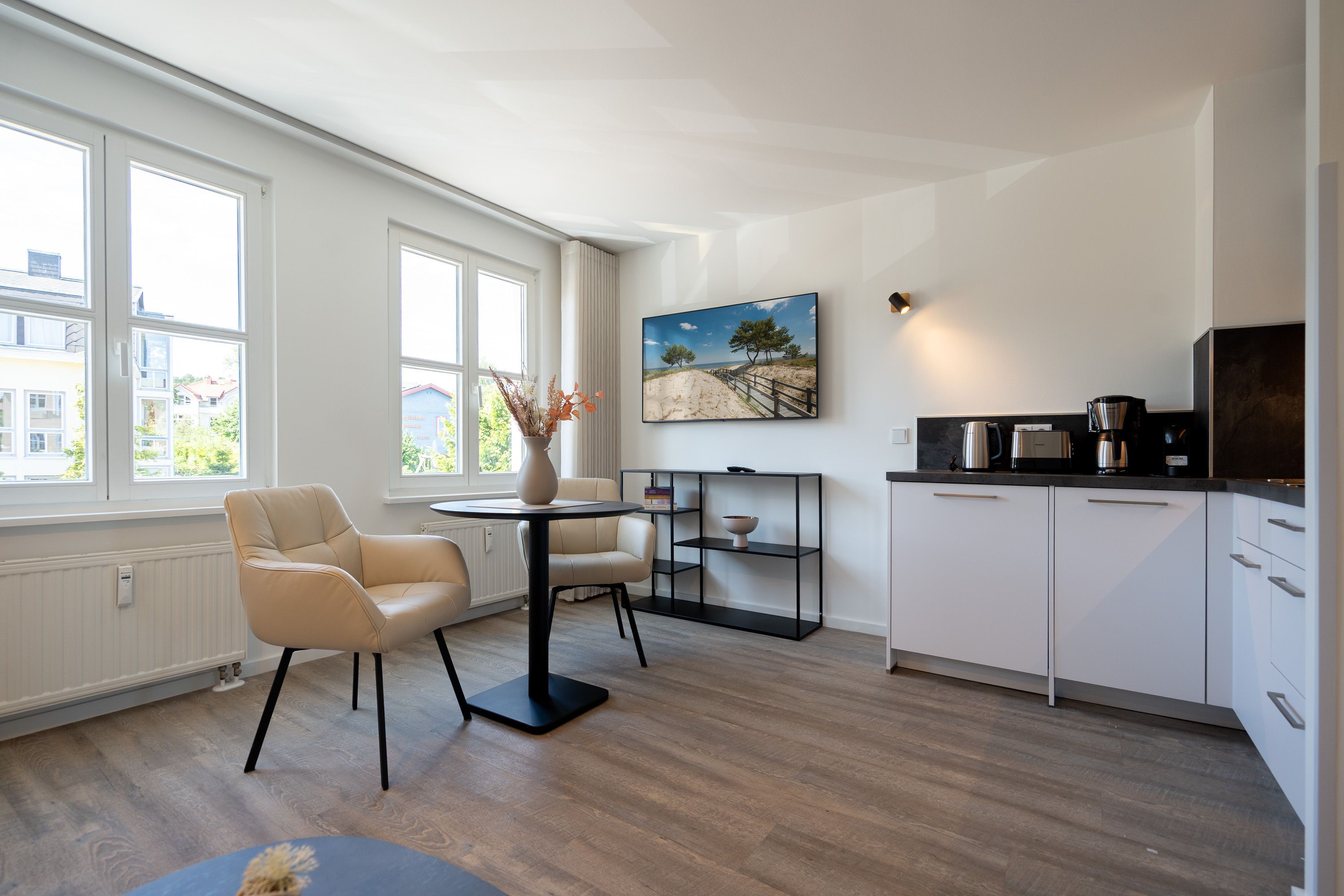 Lichtdurchflutetes 2-Raum-Appartement Nr. 4 mit Balkon Entspannung in der 2. Etage. Dieses charmante 2-Raum-Appartement in der 2. Etage bietet auf 33?m² ein stilvolles Zuhause auf Zeit für zwei Personen durchdacht geschnitten, hell und mit liebevollen Details ausgestattet. Der offene Wohnbereich empfängt Sie mit einer modernen Küchenecke inklusive 2-Platten-Cerankochfeld, Spülmaschine, Kühlschrank mit Gefrierfach und Nespresso-Kapselmaschine ideal für einen entspannten Start in den Tag oder das unkomplizierte Abendessen. Am Esstisch für zwei genießen Sie Ihre Mahlzeiten in gemütlicher Atmosphäre. Ein komfortables Sofa und der 55-Zoll-Flat-TV sorgen für entspannte Stunden ob mit Buch, Film oder einfach beim Durchschnaufen. Im separaten Schlafzimmer erwartet Sie ein komfortables Boxspringbett (1,80?m x 1,95?m), das erholsame Nächte garantiert. Von hier aus gelangen Sie direkt auf den sonnigen Süd-Ost-Balkon (ca. 5?m²) ein Lieblingsplatz für die Morgenstunden oder ein Gläschen Wein am Abend. Ein geräumiger Kleiderschrank steht im Flur zur Verfügung und bietet ausreichend Stauraum für Ihr Gepäck. Das kompakte Bad mit Dusche ( 0,85 m x 0,70 m), Waschtisch und WC ist funktional und gepflegt alles, was man braucht, nichts, was fehlt. Ein fester PKW-Stellplatz (Nr. 4) befindet sich direkt vor dem Haus. Und natürlich steht Ihnen kostenfreies WLAN zur Verfügung. Ideal für Paare, Alleinreisende oder alle, die gerne mit Leichtigkeit wohnen herzlich willkommen!