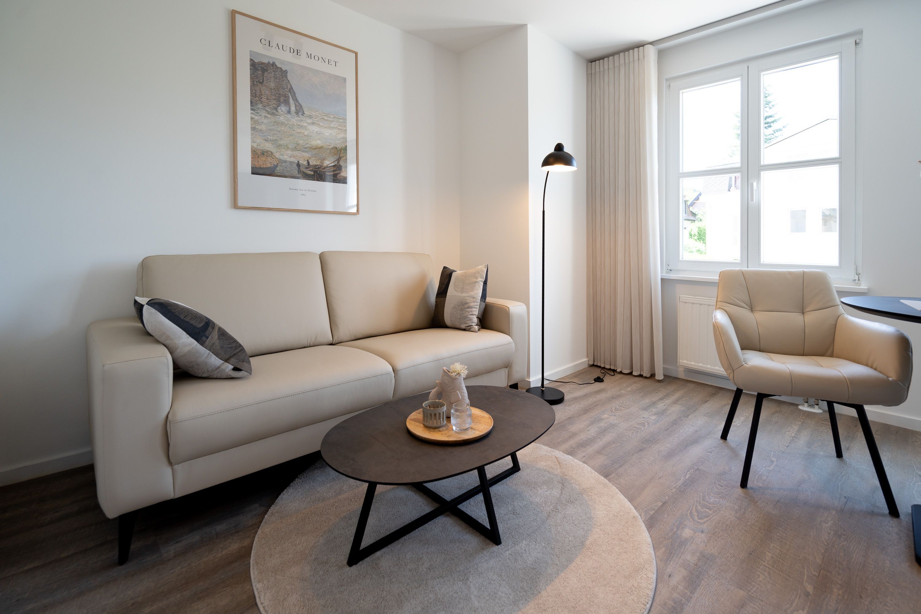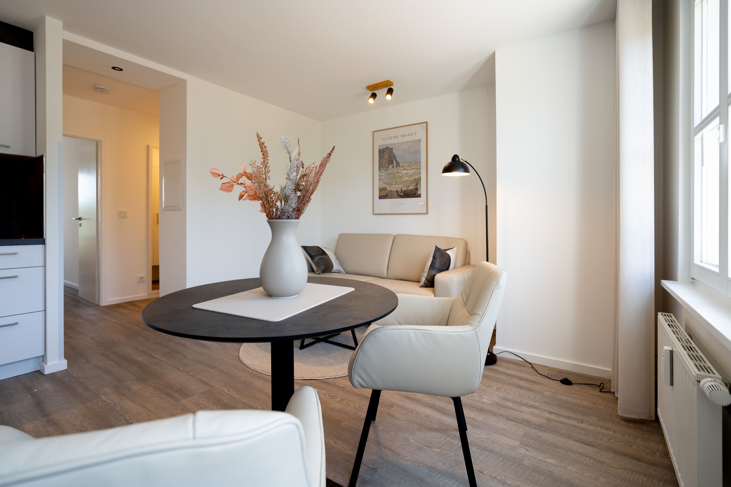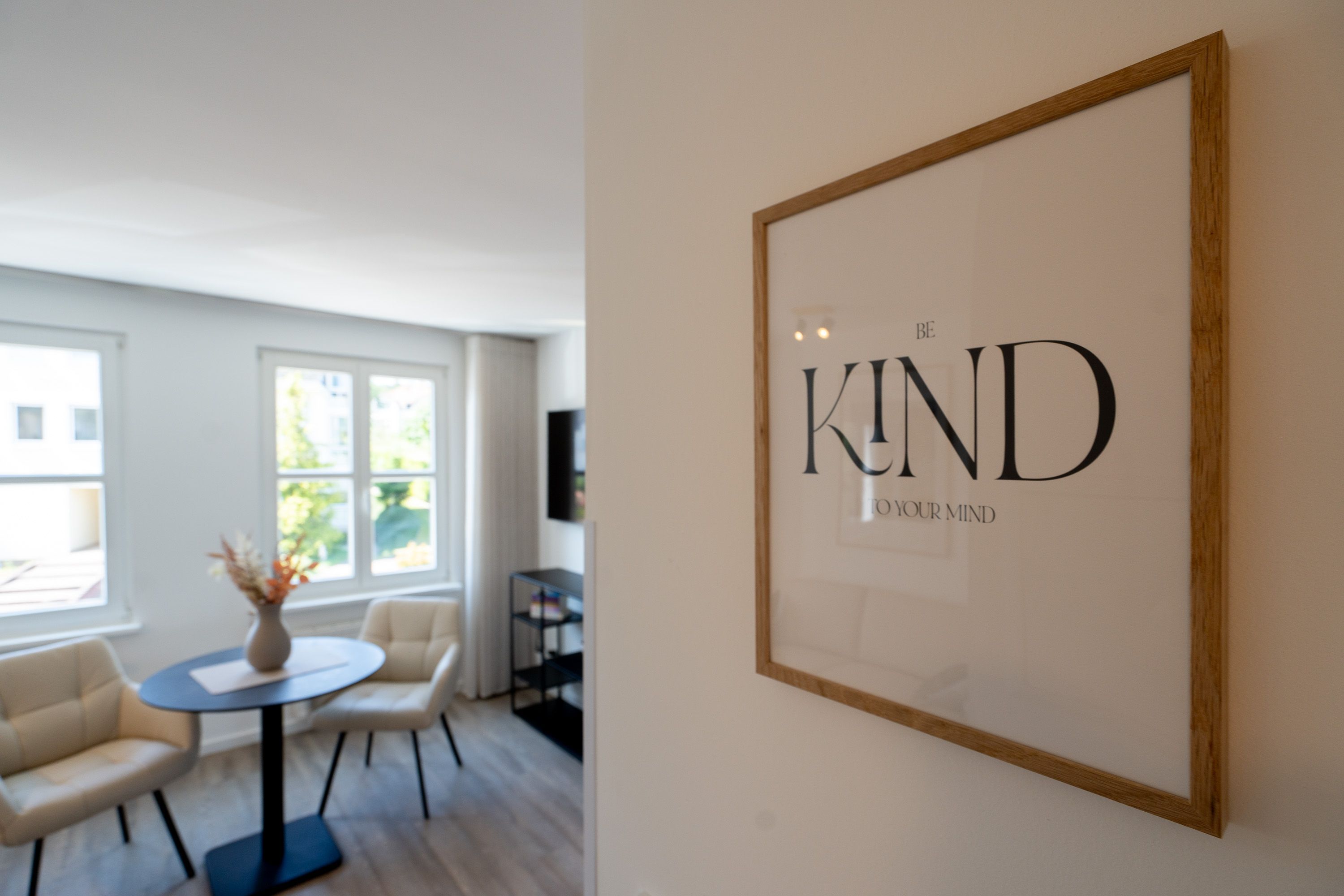 Lichtdurchflutetes 2-Raum-Appartement Nr. 4 mit Balkon Entspannung in der 2. Etage. Dieses charmante 2-Raum-Appartement in der 2. Etage bietet auf 33?m² ein stilvolles Zuhause auf Zeit für zwei Personen durchdacht geschnitten, hell und mit liebevollen Details ausgestattet. Der offene Wohnbereich empfängt Sie mit einer modernen Küchenecke inklusive 2-Platten-Cerankochfeld, Spülmaschine, Kühlschrank mit Gefrierfach und Nespresso-Kapselmaschine ideal für einen entspannten Start in den Tag oder das unkomplizierte Abendessen. Am Esstisch für zwei genießen Sie Ihre Mahlzeiten in gemütlicher Atmosphäre. Ein komfortables Sofa und der 55-Zoll-Flat-TV sorgen für entspannte Stunden ob mit Buch, Film oder einfach beim Durchschnaufen. Im separaten Schlafzimmer erwartet Sie ein komfortables Boxspringbett (1,80?m x 1,95?m), das erholsame Nächte garantiert. Von hier aus gelangen Sie direkt auf den sonnigen Süd-Ost-Balkon (ca. 5?m²) ein Lieblingsplatz für die Morgenstunden oder ein Gläschen Wein am Abend. Ein geräumiger Kleiderschrank steht im Flur zur Verfügung und bietet ausreichend Stauraum für Ihr Gepäck. Das kompakte Bad mit Dusche ( 0,85 m x 0,70 m), Waschtisch und WC ist funktional und gepflegt alles, was man braucht, nichts, was fehlt. Ein fester PKW-Stellplatz (Nr. 4) befindet sich direkt vor dem Haus. Und natürlich steht Ihnen kostenfreies WLAN zur Verfügung. Ideal für Paare, Alleinreisende oder alle, die gerne mit Leichtigkeit wohnen herzlich willkommen!