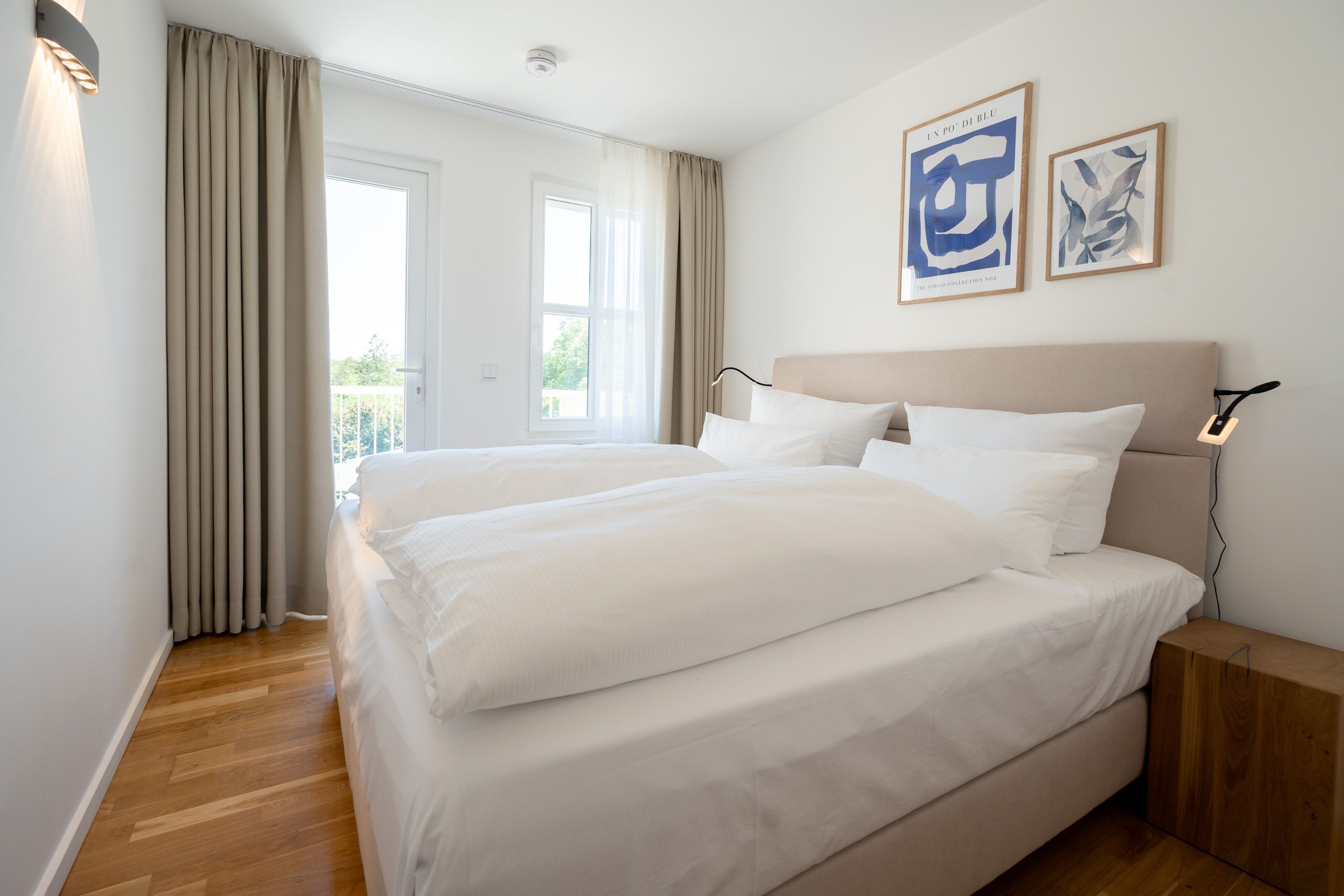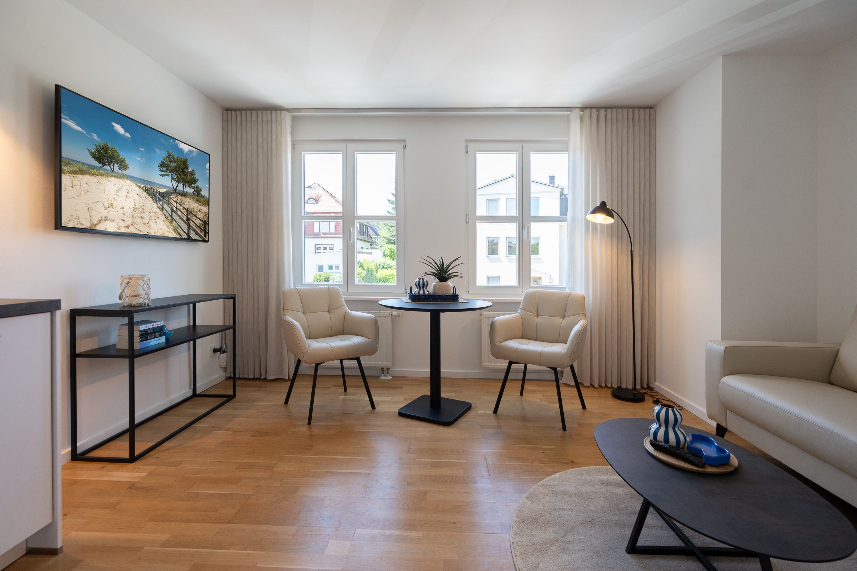 2-Raum-Appartement Nr. 6 mit Sonnenbalkon stilvoll entspannen in der 2. Etage. Dieses helle 2-Raum-Appartement in der 2. Etage bietet auf 33?m² ein durchdachtes Zuhause für zwei ideal für Paare oder Alleinreisende, die Wert auf Komfort und ein stimmiges Ambiente legen. Der offene Wohnbereich empfängt Sie mit einer gut ausgestatteten Küchenecke: 2-Platten-Cerankochfeld, Spülmaschine, Kühlschrank mit Gefrierfach und eine Nespresso-Kapselmaschine sorgen für genussvolle Selbstversorgung. Am Essplatz für zwei genießen Sie Frühstück, Abendessen oder einfach den ersten Kaffee am Tag. Ein gemütliches Sofa und ein 55-Zoll-Flat-TV machen den Wohnbereich zum entspannten Rückzugsort. Im separaten Schlafzimmer wartet ein hochwertiges Boxspringdoppelbett (1,80?m x 1,95?m) auf Sie ideal für erholsame Nächte. Von hier aus gelangen Sie direkt auf den sonnigen Süd-Ost-Balkon (ca. 5?m²), der zum Lesen, Träumen oder Nichtstun einlädt. Der geräumige Kleiderschrank befindet sich praktisch zugänglich im Flur. Ein kleines Tageslicht-Bad mit Dusche (0,85m x 0,70m), Waschtisch und WC vervollständigt das Raumangebot modern, gepflegt, funktional. Ein fester PKW-Stellplatz (Nr.?6) steht direkt vor dem Haus zur Verfügung. Selbstverständlich nutzen Sie auch das WLAN kostenfrei. Ihre perfekte kleine Auszeit zwischen Ostseewellen und Entspannung willkommen in der Villa Elisabeth.