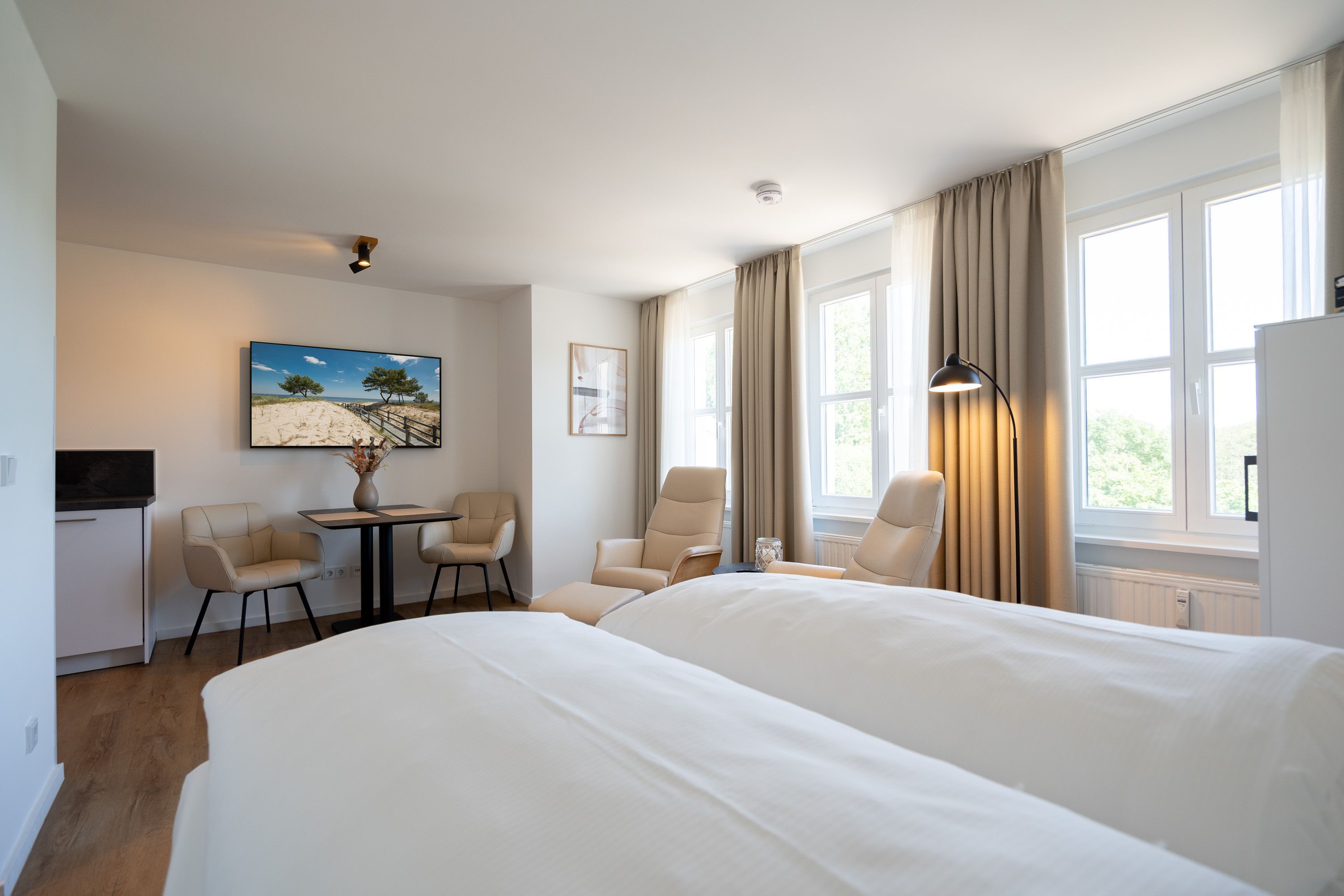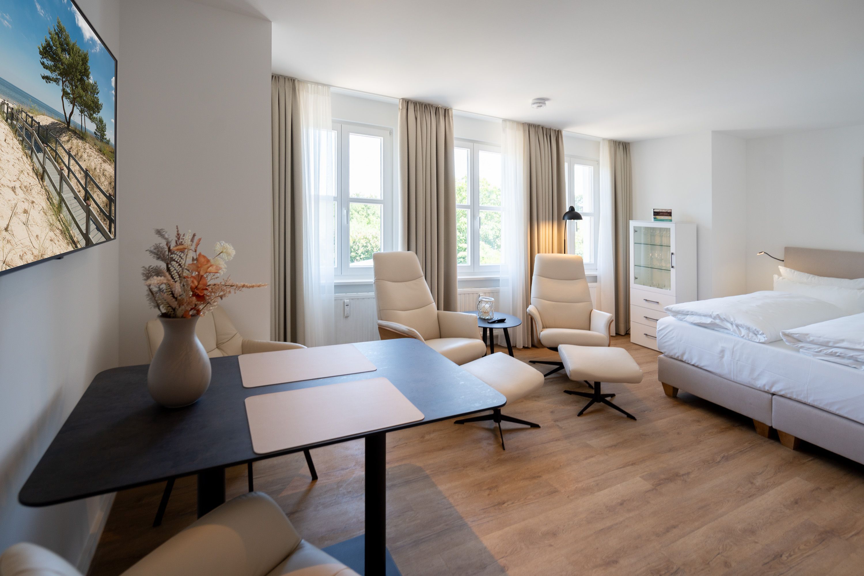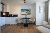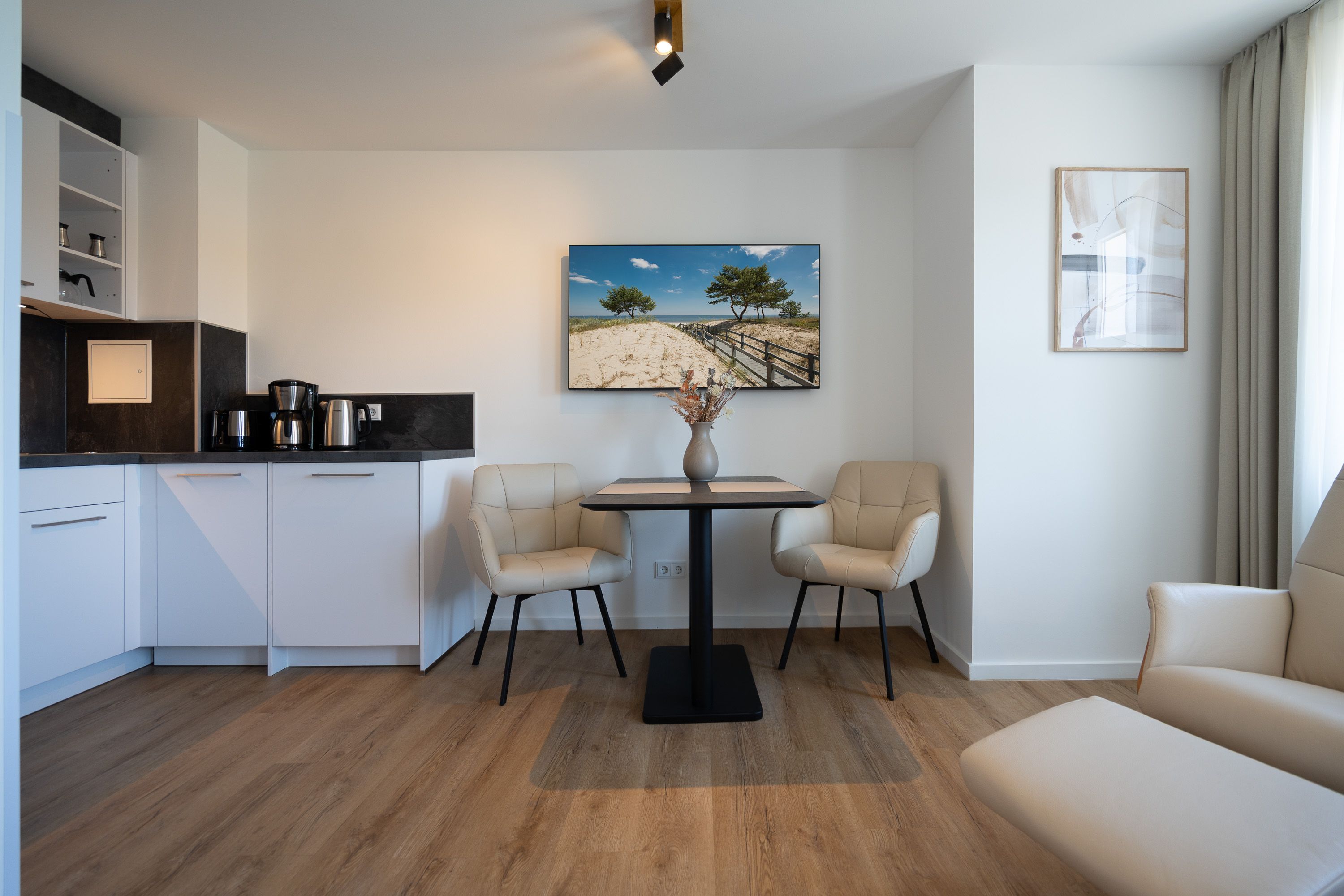 Kompakt, stilvoll, durchdacht 1-Raum-Appartement Nr. 5 für zwei in der 2. Etage.Dieses liebevoll eingerichtete 1-Raum-Appartement in der 2. Etage bietet auf 28?m² eine clevere Kombination aus Funktionalität und Wohlfühlambiente ideal für Paare oder Alleinreisende, die Wert auf Komfort legen. Der offene Wohnbereich ist hell und freundlich gestaltet. Die moderne Küchenzeile ist ausgestattet mit 2-Platten-Cerankochfeld, Spülmaschine, Kühlschrank mit Gefrierfach und Nespresso-Kapselmaschine ideal für den ersten Kaffee am Morgen oder das schnelle Abendessen. Der gemütliche Essplatz für zwei lädt zum Verweilen ein. Für entspannte Stunden stehen zwei komfortable Relaxsessel mit Hocker bereit, begleitet von einem 55-Zoll-Flat-TV falls das Meer mal Pause hat. Das hochwertige Boxspringdoppelbett (1,60?m x 2,00?m) sorgt für erholsamen Schlaf, während der Kleiderschrank ausreichend Stauraum für Ihre Urlaubsgarderobe bietet. Das kompakte Bad mit Dusche (0,85m x 0,70m), Waschtisch und WC ist gepflegt und funktional alles drin, alles dran. Ein fester PKW-Stellplatz (Nr.?5) befindet sich direkt vor dem Haus, kostenfreies WLAN ist selbstverständlich inklusive. Ein durchdachtes Refugium für alle, die es klar, gemütlich und komfortabel mögen willkommen in Ihrer kleinen Auszeit.