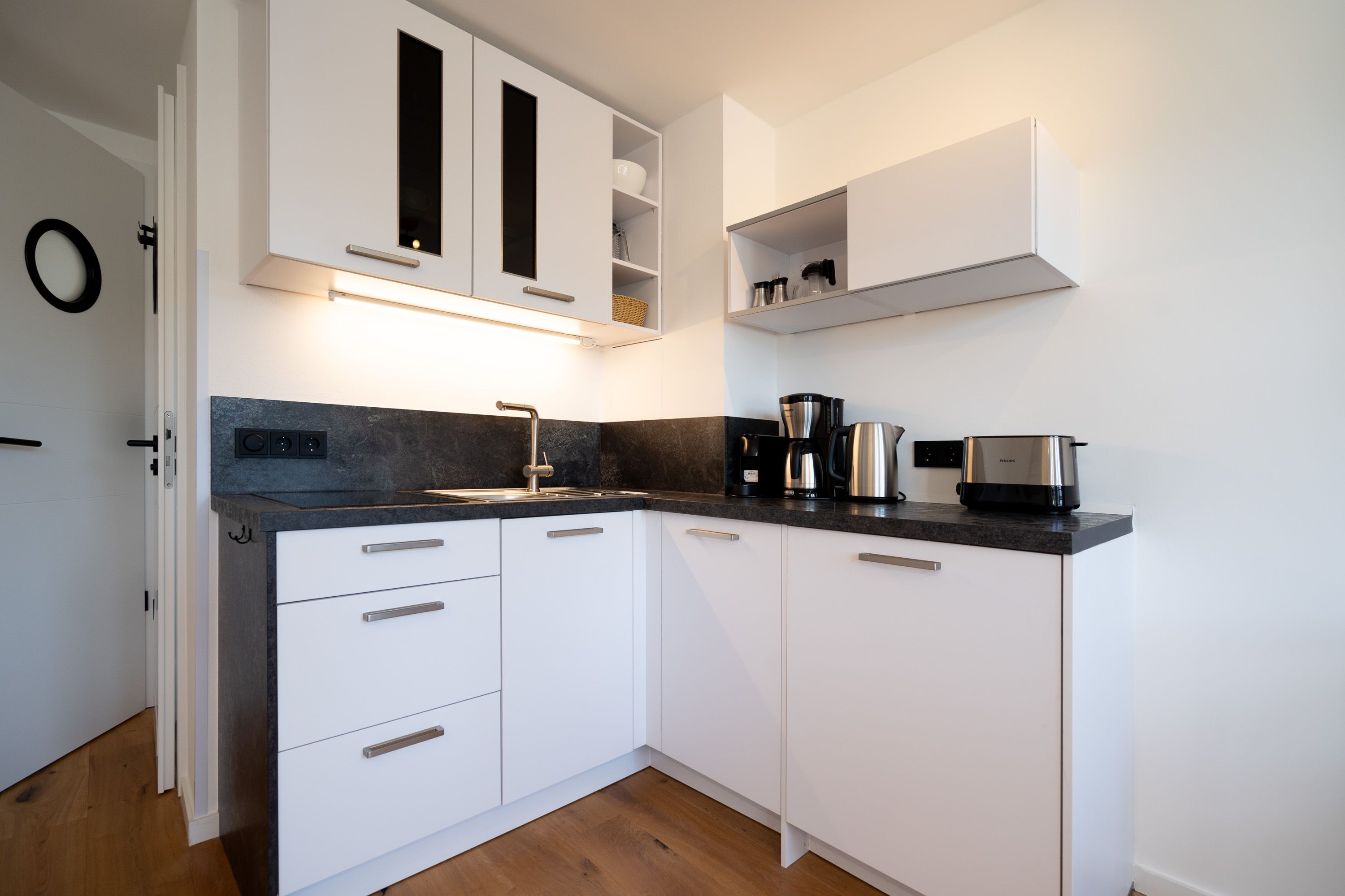2-Raum-Appartement mit Elektrokamin Wohlfühlambiente unterm Dach. Das 2-Raum-Appartement Nr.?9 im Dachgeschoss der Villa Elisabeth bietet auf 32?m² eine stilvolle Rückzugsmöglichkeit für zwei Personen mit liebevollen Details, durchdachter Ausstattung und einem Hauch Gemütlichkeit, der schon beim Reinkommen spürbar wird. Im offenen, hellen Wohnbereich finden Sie eine moderne Küchenecke mit 4-Platten-Cerankochfeld, Spülmaschine, Kühlschrank mit Gefrierfach und Nespresso-Kapselmaschine ideal für den selbstgemachten Urlaubskaffee oder das kleine Abendessen zu zweit. Der Essplatz bietet Raum für gemeinsame Mahlzeiten, während Sofa, 55-Zoll-Flat-TV und ein stimmungsvoller Elektrokamin mit Fernbedienung für entspannte Abende sorgen ganz ohne Holz, Rauch oder Aufwand. Im separaten Schlafzimmer sorgt ein bequemes Boxspringbett (1,60?m x 1,95?m) für erholsamen Schlaf. Der Kleiderschrank bietet ausreichend Platz für Ihre Garderobe. Das Tageslicht-Bad ist mit einer Dusche (0,85m x 0,70m), Waschtisch und WC ausgestattet kompakt, hell und funktional. Ihr Fahrzeug parkt wettergeschützt unter dem Carport auf dem Hof Stellplatz Nr.?9 gehört exklusiv zu Ihrer Wohnung. WLAN steht selbstverständlich kostenfrei zur Verfügung. Ein gemütlicher Rückzugsort mit besonderem Charme perfekt für erholsame Tage an der Ostsee.