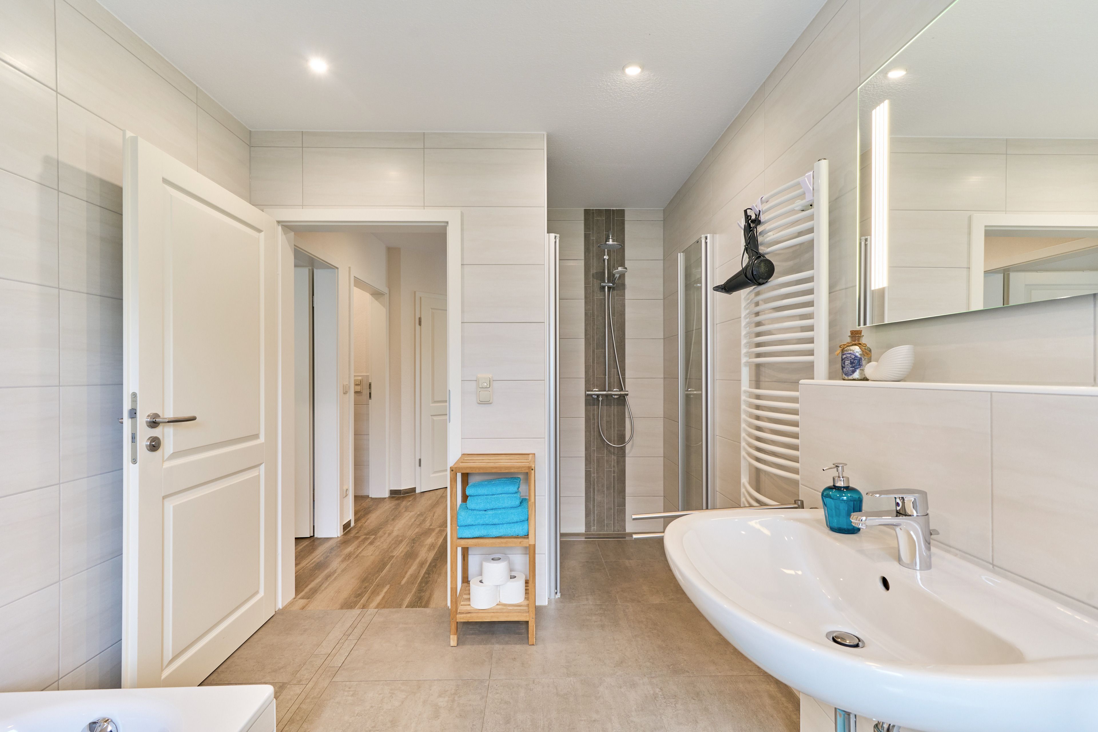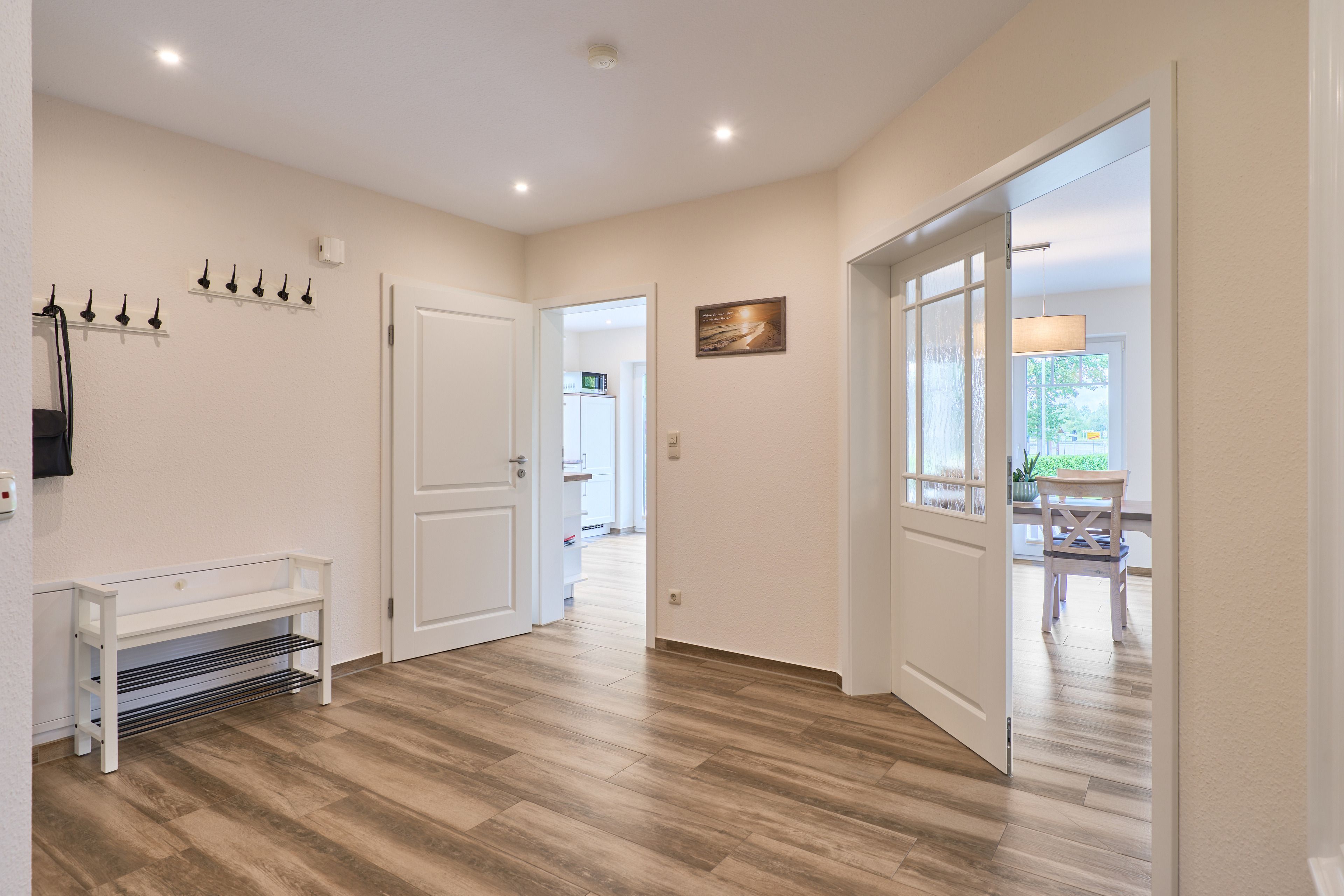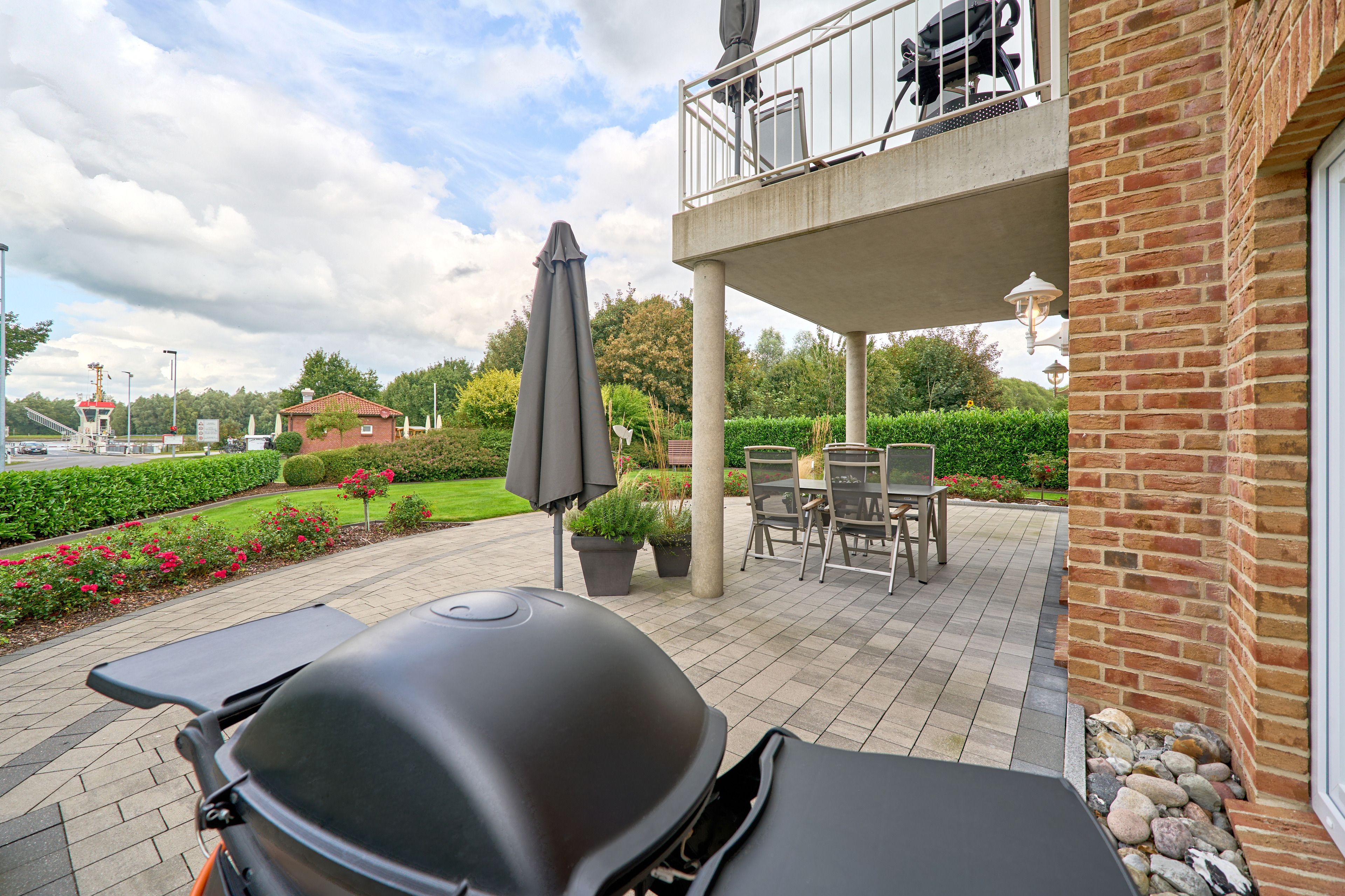 Die Ferienwohnung Schiffsdeck im Erdgeschoss ist hochwertig und geschmackvoll im hellen, modernen Landhausstil eingerichtet. In der lichtdurchfluteten Wohnung finden Sie viel Platz und Komfort für Ihren Traumurlaub. Der großzügige Schnitt der Wohnung lädt zum Erleben ein, ob gemeinsam oder lieber alleine, hier genießen Sie viel Freiraum, aber auch individuelle Rückzugsorte. Auf der großen Sonnenterrasse, die direkt vom Wohn- und Essbereich begehbar ist, finden Sie hochwertige Gartenmöbeln, einen Weber Gasgrill und natürlich einen Sonnenschirm. Der Garten mit viel Rasenfläche ist ideal für Familien mit Kindern. Die Wohnung ist bedingt barrierefrei, auf Wunsch steht Ihnen ein mobile Rollstuhlrampe zur Verfügung. Von der Nebeneingangstür zusätzlich zum Haupteingang könne Sie die Wohnung direkt vom Carport aus betreten. Zwei geräumige Schlafzimmer (Doppelbett 180x200) mit TV laden hier nach einem tollen Urlaubstag zum Träumen ein. Die Schlafzimmer haben zusätzlich zu den Plissees elektrische Aussenrollläden, damit Sie auch im Sommer nicht auf einen erholsamen Schlaf verzichten müssen. Der Wohn- und Essbereich bietet mit seinen bodentiefen Fenstern einen herrlichen Blick auf den NOK. Träumen Sie beim Kochen in der hochwertig ausgestatteten Küche von großen Pötten und der weiten Welt oder genießen Sie von der großen Wohnlandschaft das ständige pendeln der Fähre. Die Wohnung ist komplett ausgestattet, neben dem 55 Zoll TV mit DVD Player und Sonoro Soundsystem, im Wohnbereich, finden Sie eine feine Auswahl an Lektüren und Spielen. Unsere kleinen Gäste liegen uns sehr am Herzen, für sie stellen wir Ihnen gerne unsere Kleinkindausstattung zur Verfügung. Genießen Sie entspannte Sonnentage in der sehr gepflegten Gartenanlage mit viel Platz zum relaxen, Kraft tanken, entspannen oder toben und spielen. Staunen Sie über die vorbeiziehenden Schiffe oder beobachten Sie das rege Treiben der NOK- Fähre.