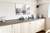 Für die Zubereitung kleiner Mahlzeiten oder eines köstlichen Frühstücks steht Ihnen die offene Pantryküche zur Verfügung. Diese ist mit zwei Kochplatten, einem kleinen Kühlschrank, einer Filterkaffeemaschine, einer Nespresso-Maschine, Wasserkocher, Toaster und Eierkocher ausgestattet. Direkt neben der Küche lädt der Essbereich zu geselligen Stunden ein.