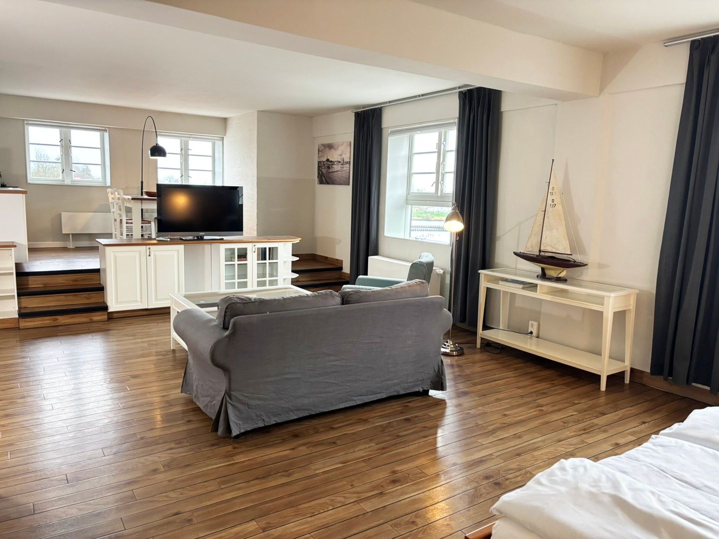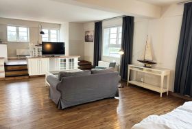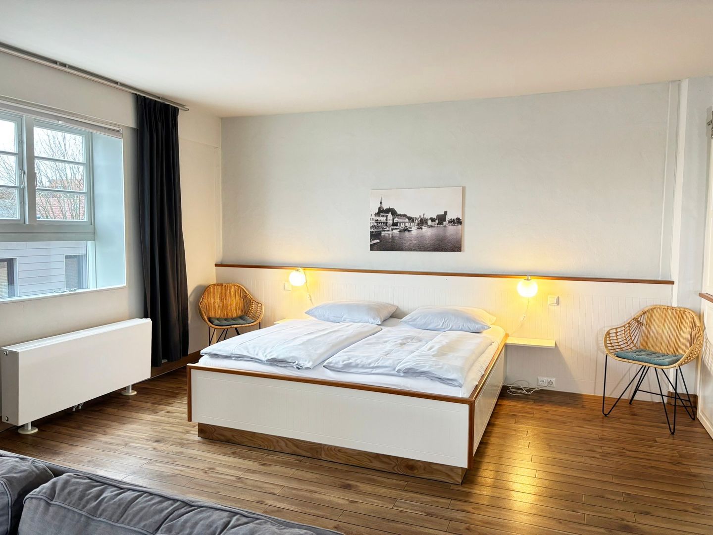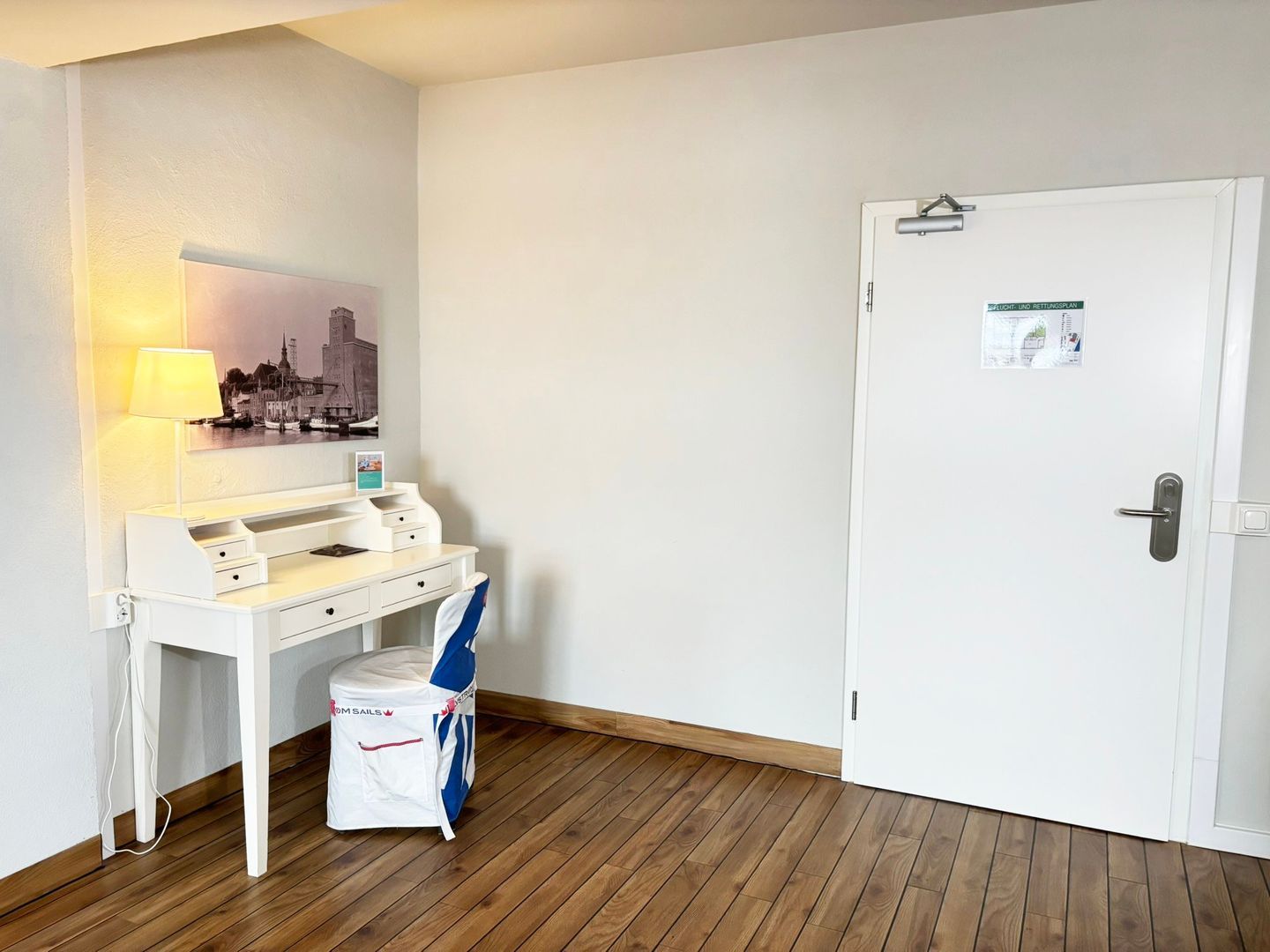 Das Appartement befindet sich in der dritten Etage des Pierspeichers und ist bequem über einen Aufzug oder das Treppenhaus erreichbar. Hier finden Sie einen einladenden Essbereich, eine gemütliche Sitzecke sowie eine praktische Pantryküche. Der offene Wohnbereich lädt mit einem bequemen Sessel und einem Sofa zum Entspannen ein.