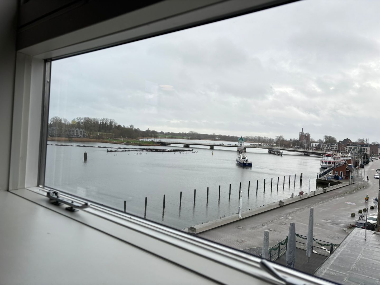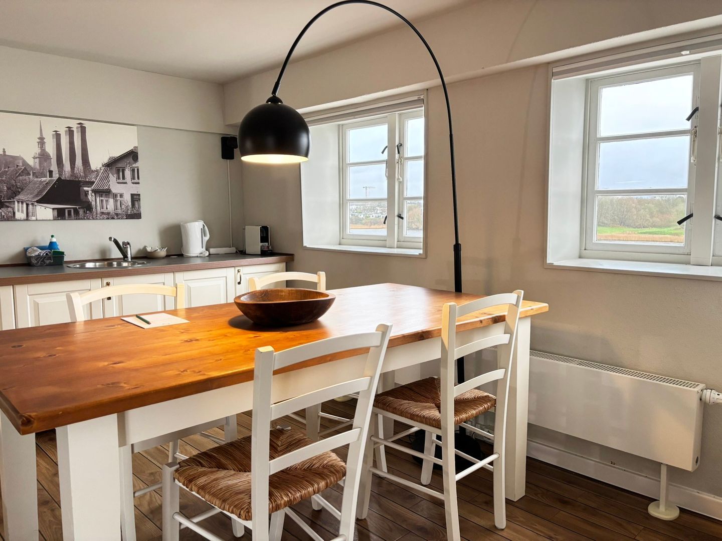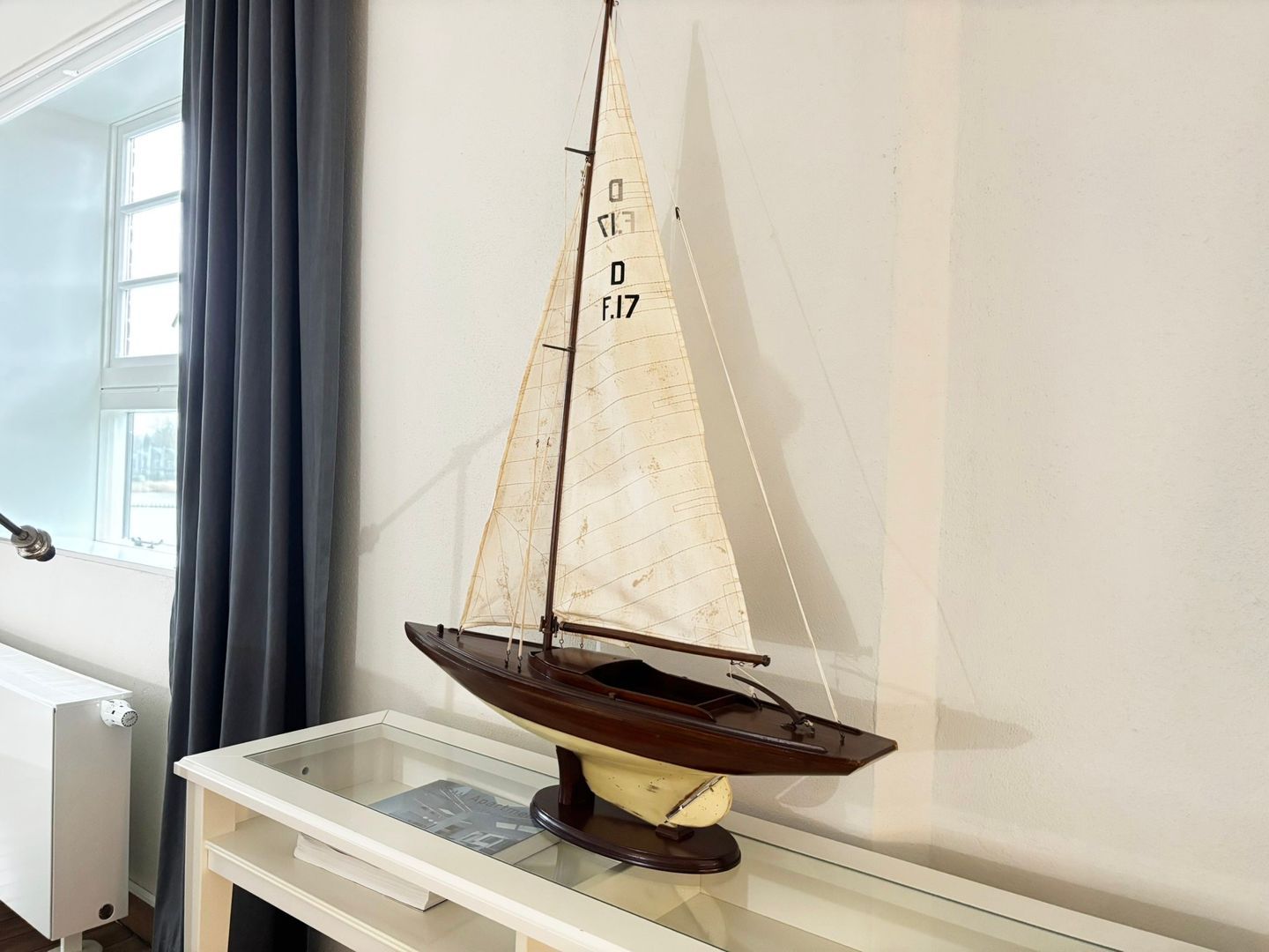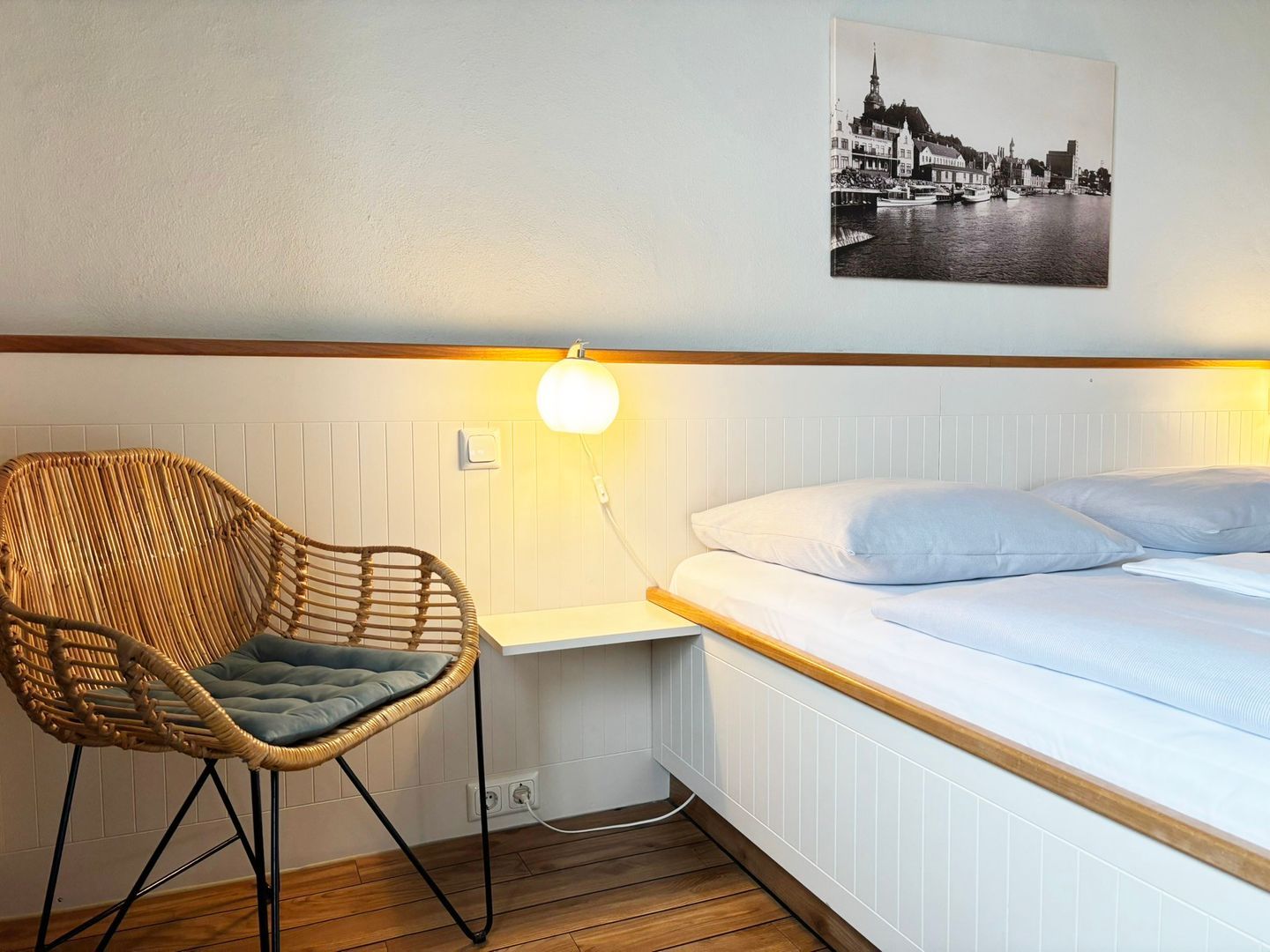 Das Appartement befindet sich in der dritten Etage des Pierspeichers und ist bequem über einen Aufzug oder das Treppenhaus erreichbar. Hier finden Sie einen einladenden Essbereich, eine gemütliche Sitzecke sowie eine praktische Pantryküche. Der offene Wohnbereich lädt mit einem bequemen Sessel und einem Sofa zum Entspannen ein.
