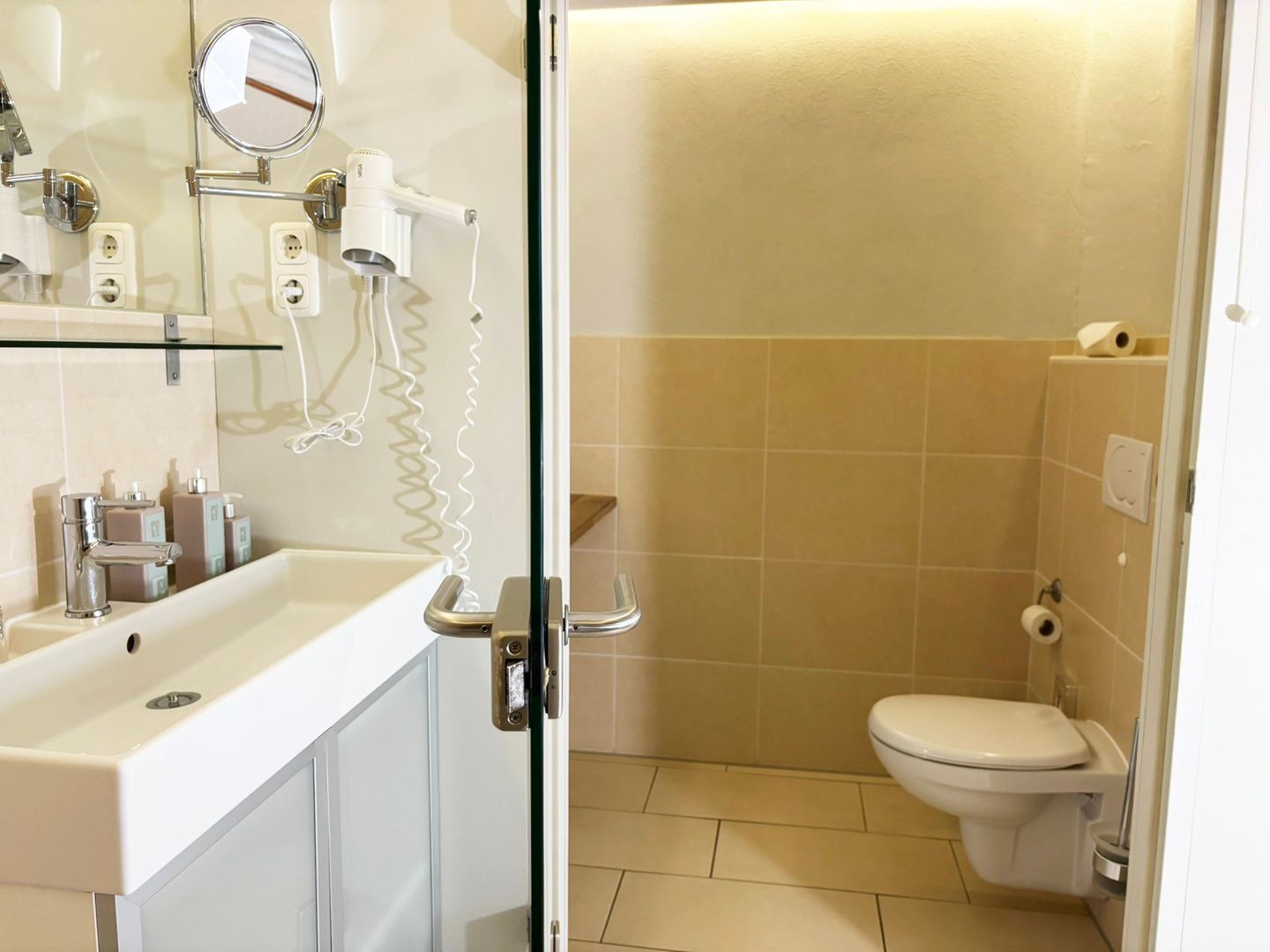 Das Badezimmer ist modern ausgestattet und in zwei separate Bereiche aufgeteilt. Bereich 1: Badewanne, Waschbecken, Haartrockner und Kosmetikspiegel , Bereich 2: WC.