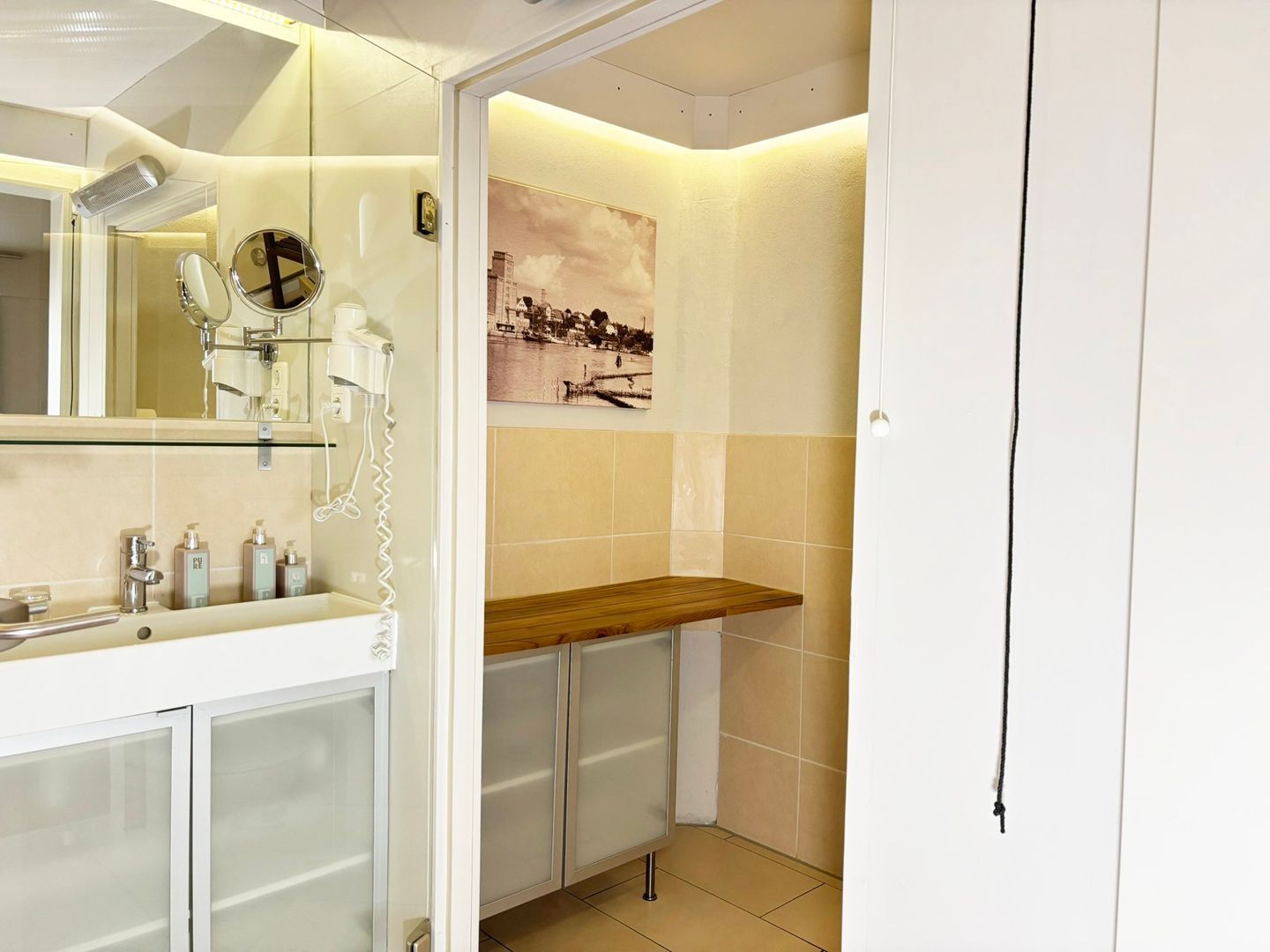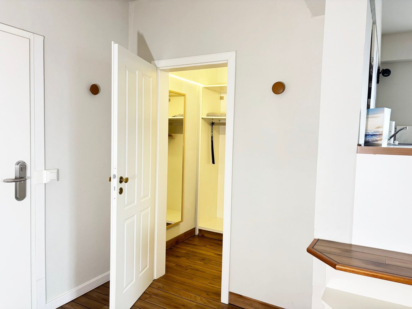 Im angrenzenden offenen Schlafbereich erwartet Sie ein komfortables Doppelbett (180x200 cm) mit getrennten Matratzen und offenem Fußende und Verdunklungsmöglichkeiten für erholsame Nächte. Ergänzt wird das Appartement durch einen begehbaren Kleiderschrank mit einer Kofferablage.