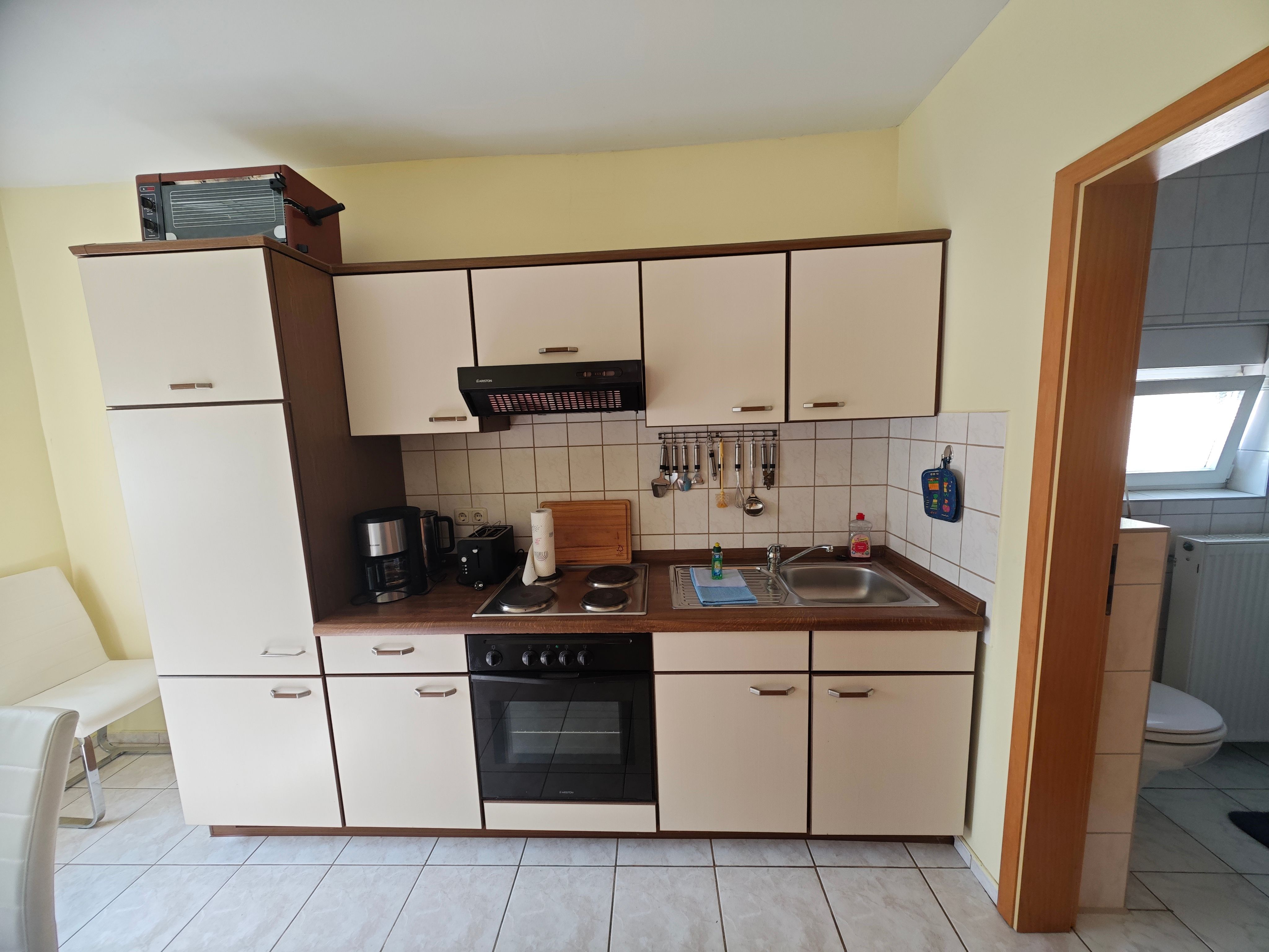 gut ausgestattete Küche mit Herd, Heißluftfritteuse, Wasserkocher, Kaffeemaschine, Toaster, Kühlschrank, Backofen , Gläser, Geschirr, Besteck, SAT-TV & WLAN.