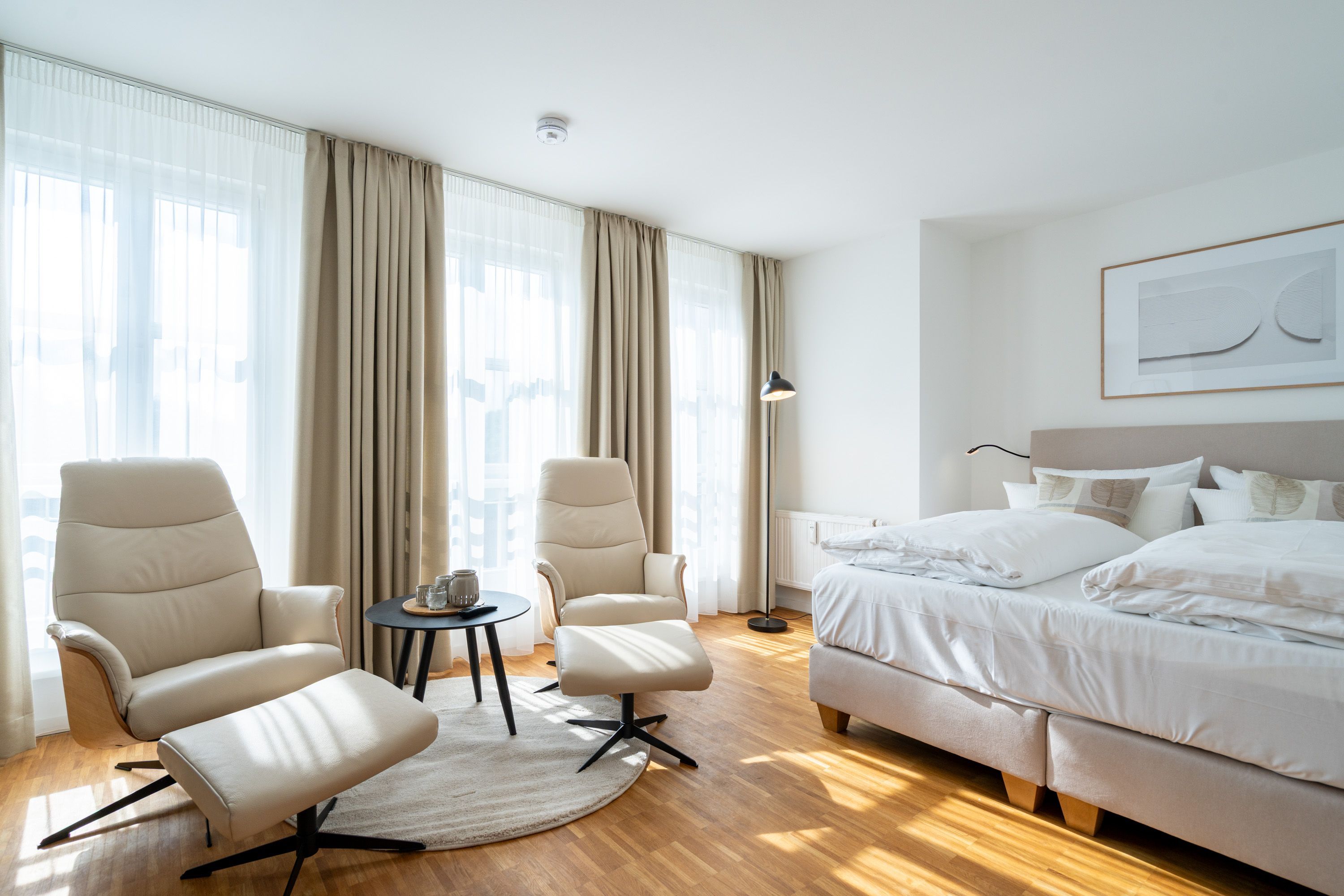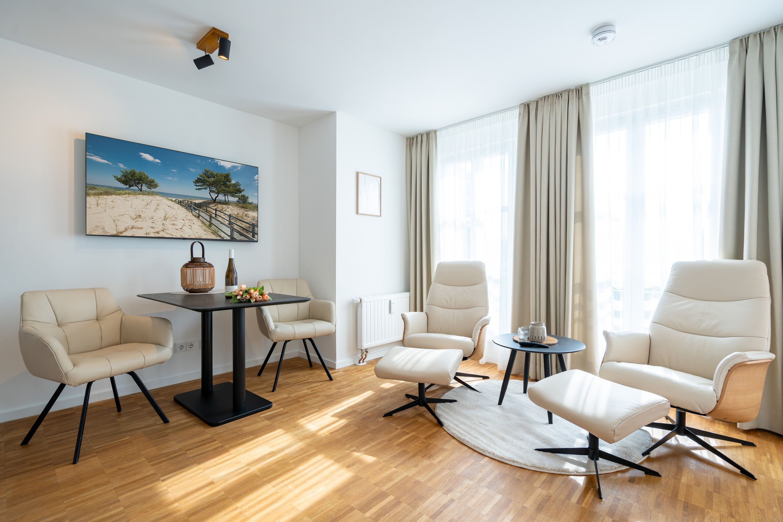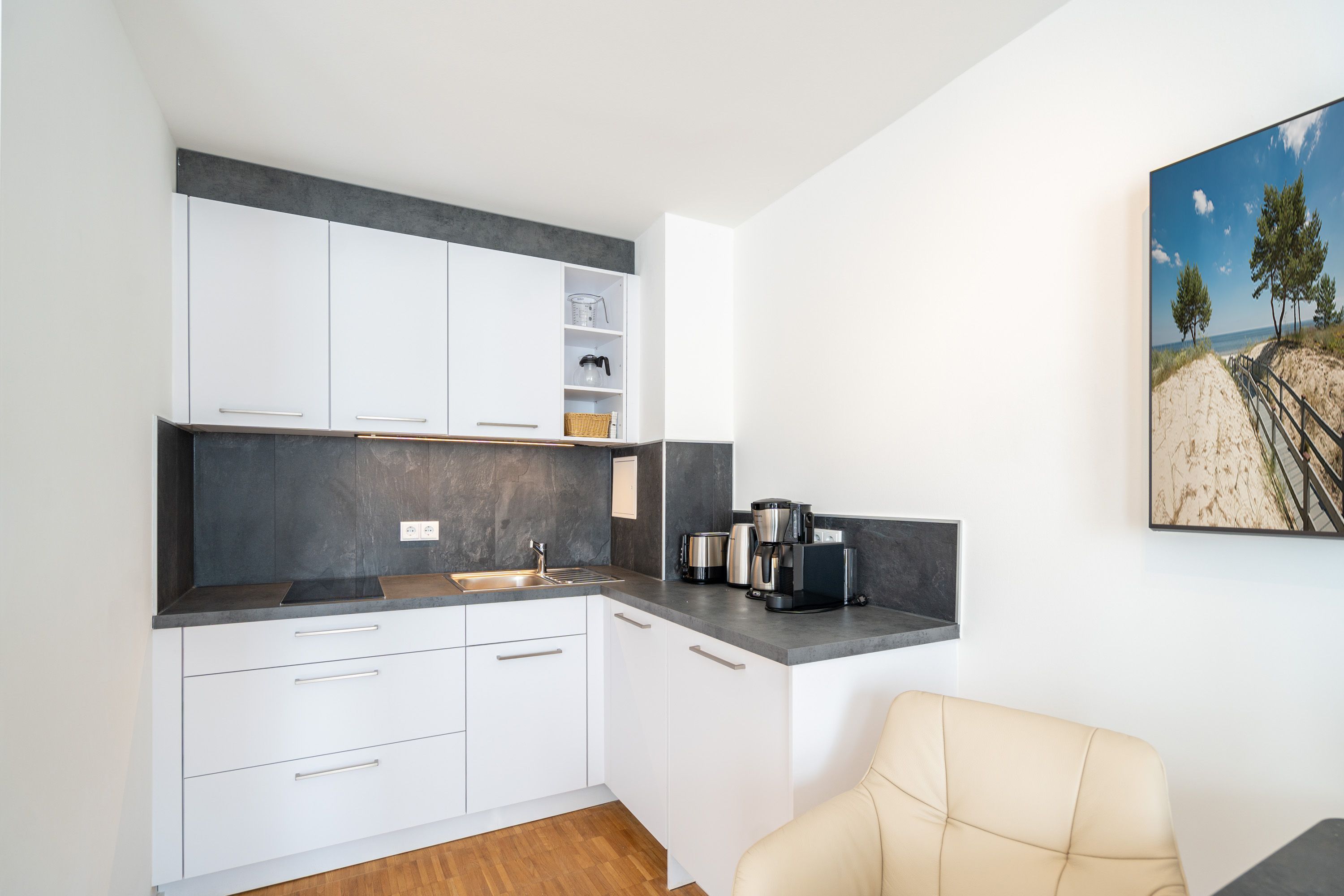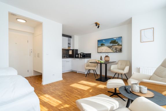 Klein, fein, einfach entspannen Ihr 1-Raum-Appartement Nr. 2 zum Wohlfühlen. Willkommen in Ihrem gemütlichen Rückzugsort für zwei! Dieses liebevoll eingerichtete 1-Raum-Appartement (28 m²) im Hochparterre bietet alles, was Sie für einen entspannten Urlaub zu zweit brauchen kompakt, stilvoll und durchdacht bis ins Detail. Der offene und helle Wohnbereich empfängt Sie mit einer modernen Küchenzeile, ausgestattet mit 2-Platten-Cerankochfeld, Spülmaschine, Kühlschrank mit Gefrierfach und einer Nespresso-Kapselmaschine perfekt für das erste Frühstück oder den kleinen Snack zwischendurch. Am Essplatz für zwei genießen Sie Ihre Mahlzeiten ganz entspannt mit Blick ins Grüne. Zum Entspannen laden zwei bequeme Relaxsessel mit Hockern ein perfekt für einen Filmabend am 55-Zoll-Flat-TV oder einfach zum Füßehochlegen. Für erholsame Nächte sorgt das komfortable Boxspringdoppelbett (1,60?m x 2,00?m), ein geräumiger Kleiderschrank bietet Platz für Ihr Urlaubsgepäck. Das kleine Duschbad ist funktional und gepflegt mit Waschtisch und WC. Ein PKW-Stellplatz (Nr. 2) steht Ihnen direkt vor dem Haus zur Verfügung, ebenso wie kostenfreies WLAN damit Sie auch im Urlaub bestens vernetzt bleiben. Ideal für Paare oder Alleinreisende, die auf Komfort nicht verzichten wollen willkommen in Ihrer kleinen Auszeit!