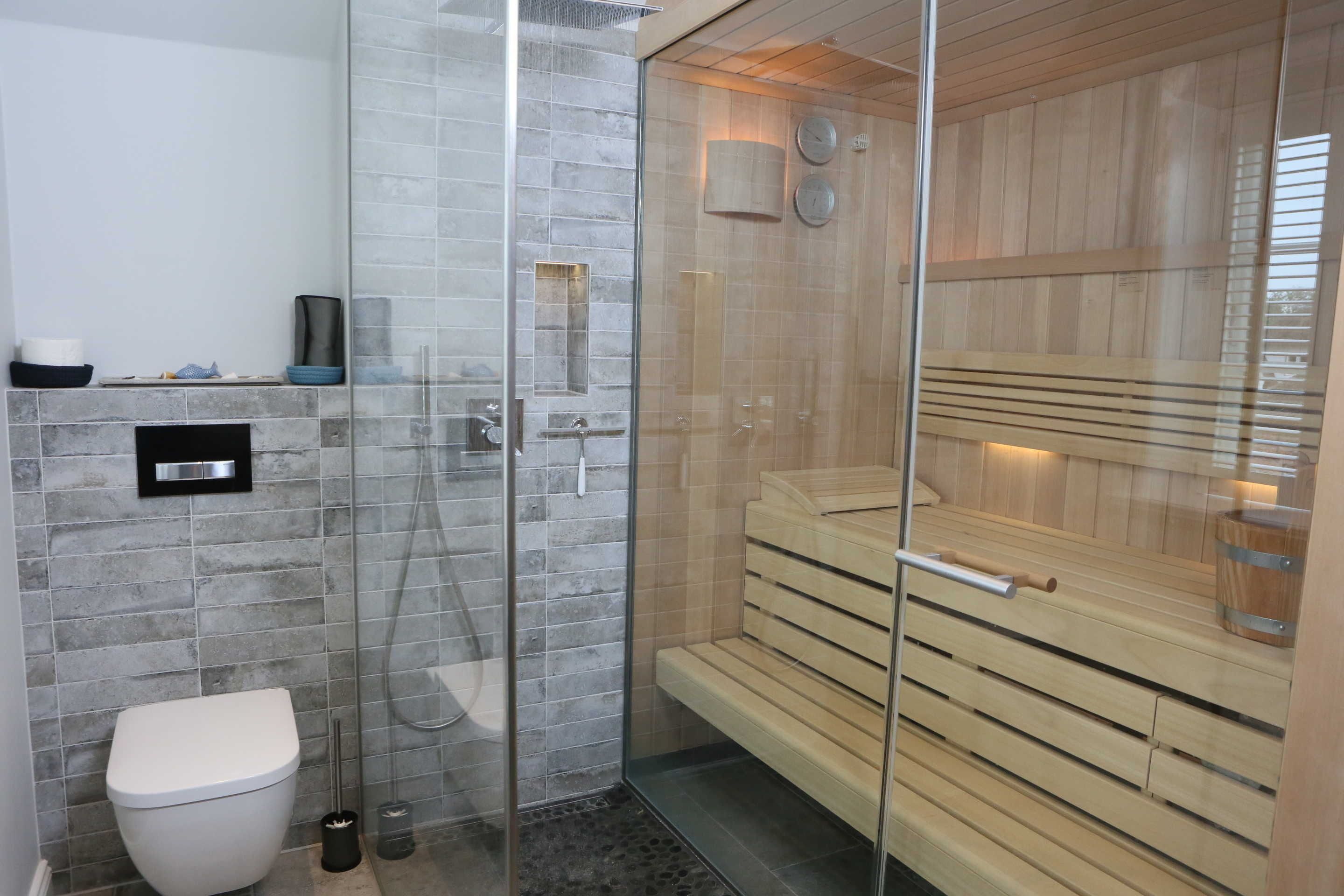 Ein weiteres Bad, über die Galerie erreichbar, hat eine hochmoderne Sauna, die über einen innovativen Sicherheitsofen verfügt. Dieser ist nicht offen erreichbar, so dass Verbrennungen an heißen Teilen ausgeschlossen sind. Auf einen Aufguss braucht man Dank eines ausgeklügelten Systems dennoch nicht zu verzichten.