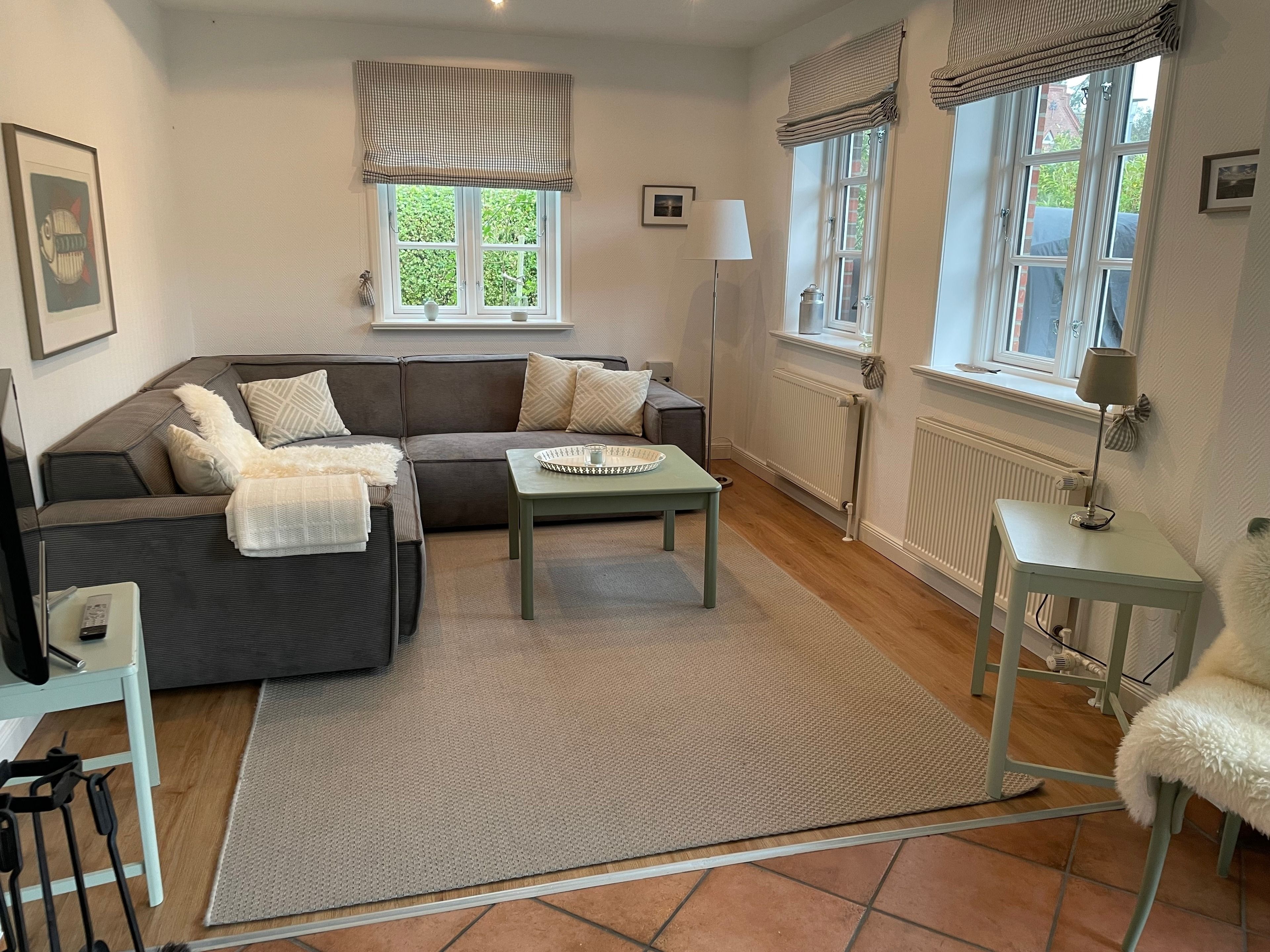 Im gemütlichen Wohnzimmer befinden sich eine Couch und mehrere Sessel, ein Flachbild-TV mit DVD-Player und ein Kaminofen für die kalten Tage. Vom Wohnzimmer aus kommt man auf die eigene Terrasse und den eigenen Garten mit Tisch, Stühlen, Strandkorb und Gartenliegen.