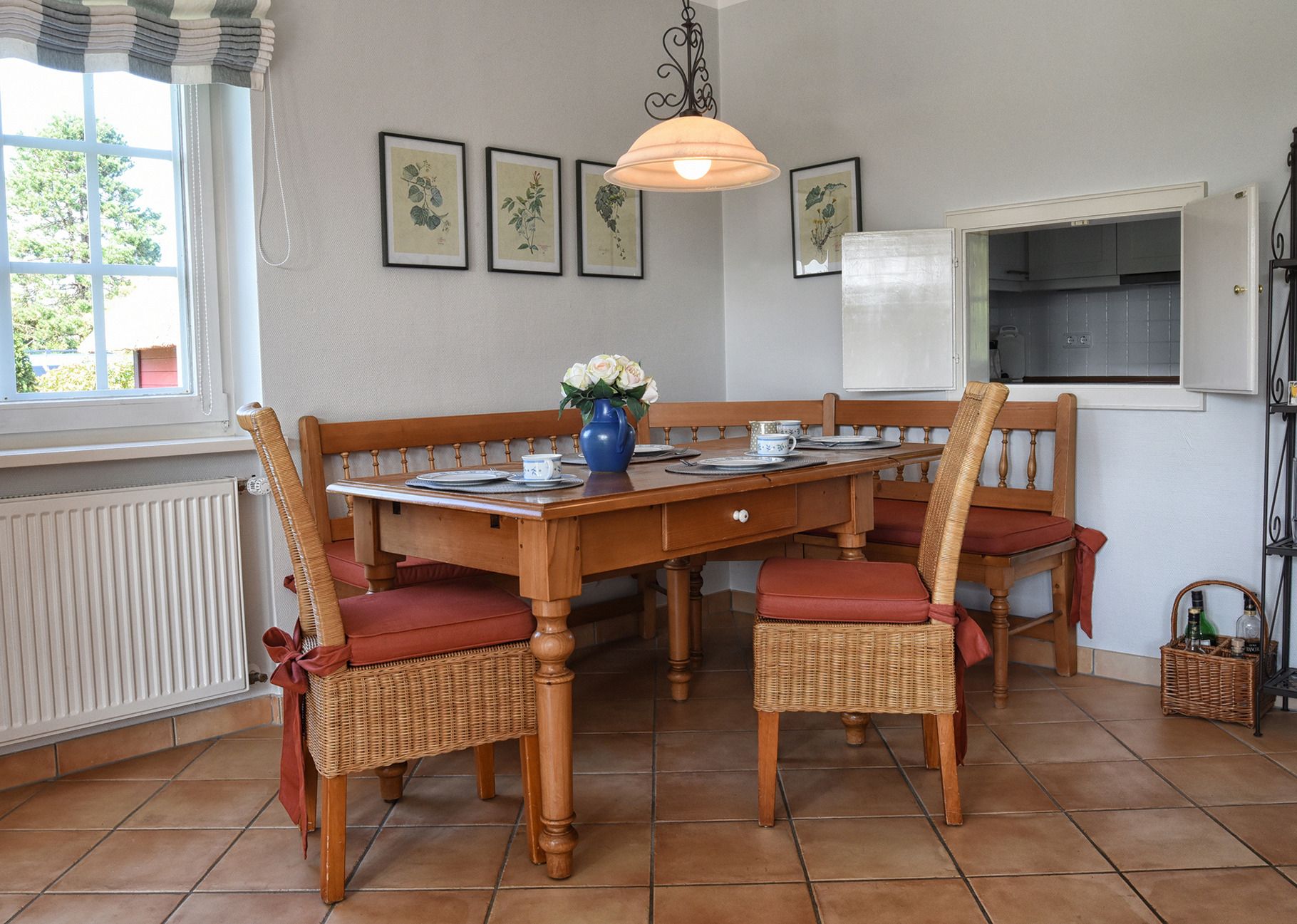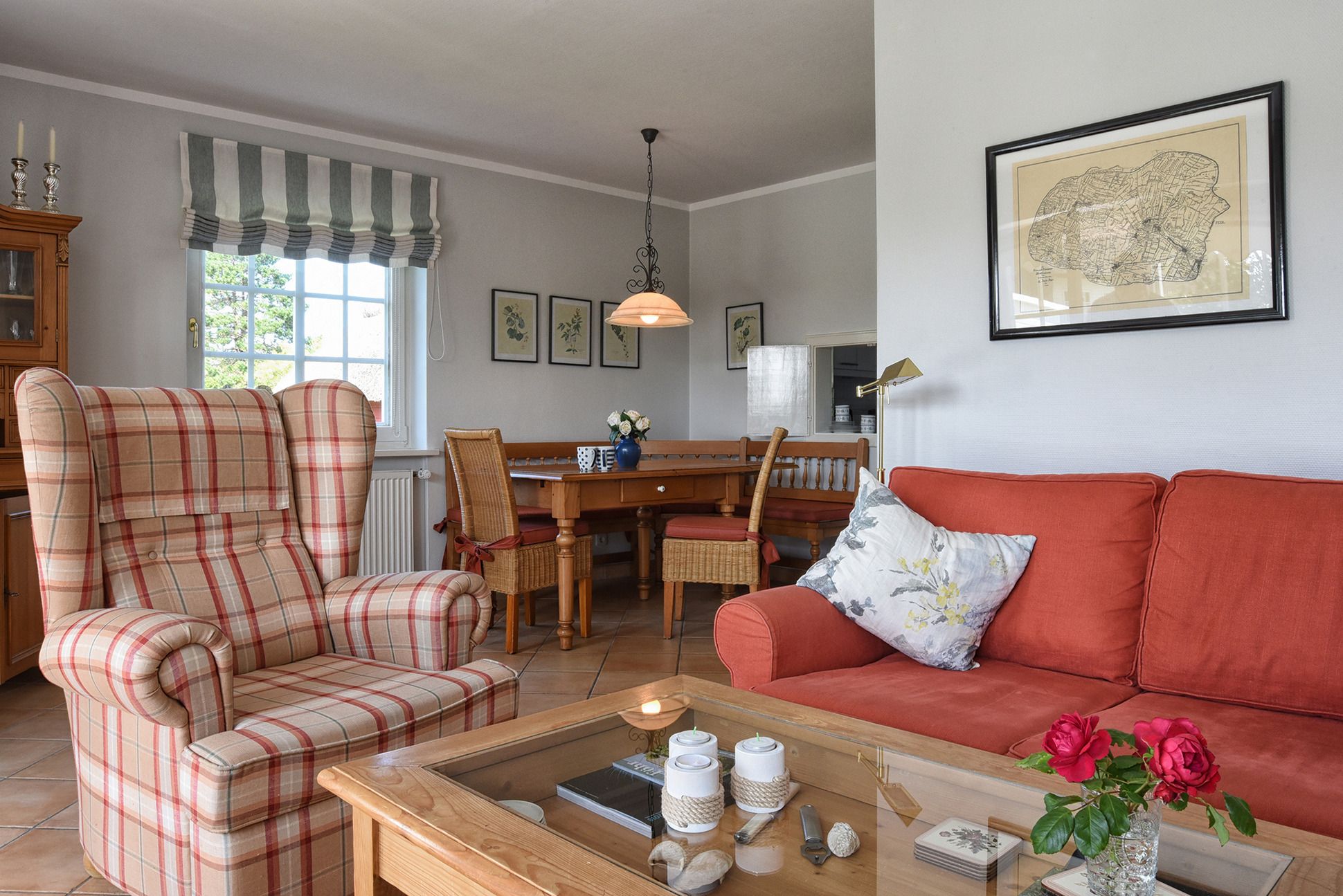 Vom ebenerdigen Flur geht es rechts in die Küche. Links liegt das Gäste-WC. Der Wohnraum ist unterteilt in einen Bereich mit Sitzecke und Kachelofen sowie einem Essbereich. Zur Küche besteht eine Verbindung über eine Durchreiche. Im Wohnraum befindet sich eine Musikanlage sowie ein Flachbildfernseher mit Satellitenempfang.