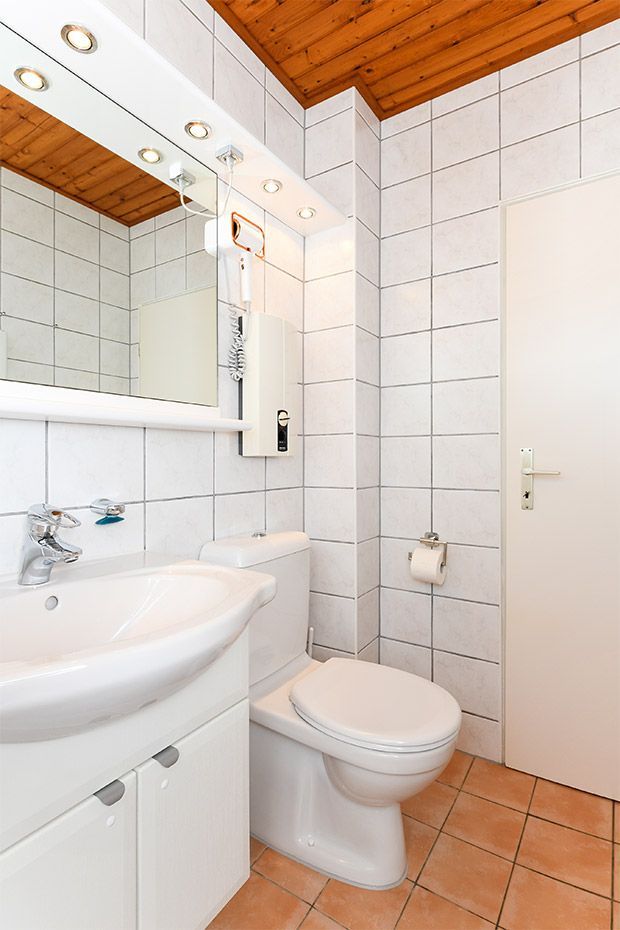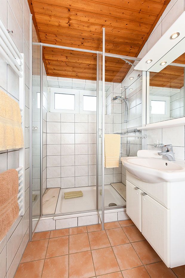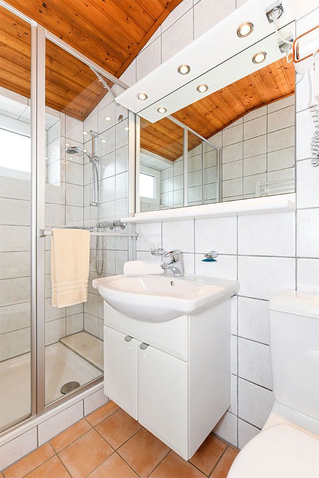 Badezimmer mit Dusche, Waschtisch und WC