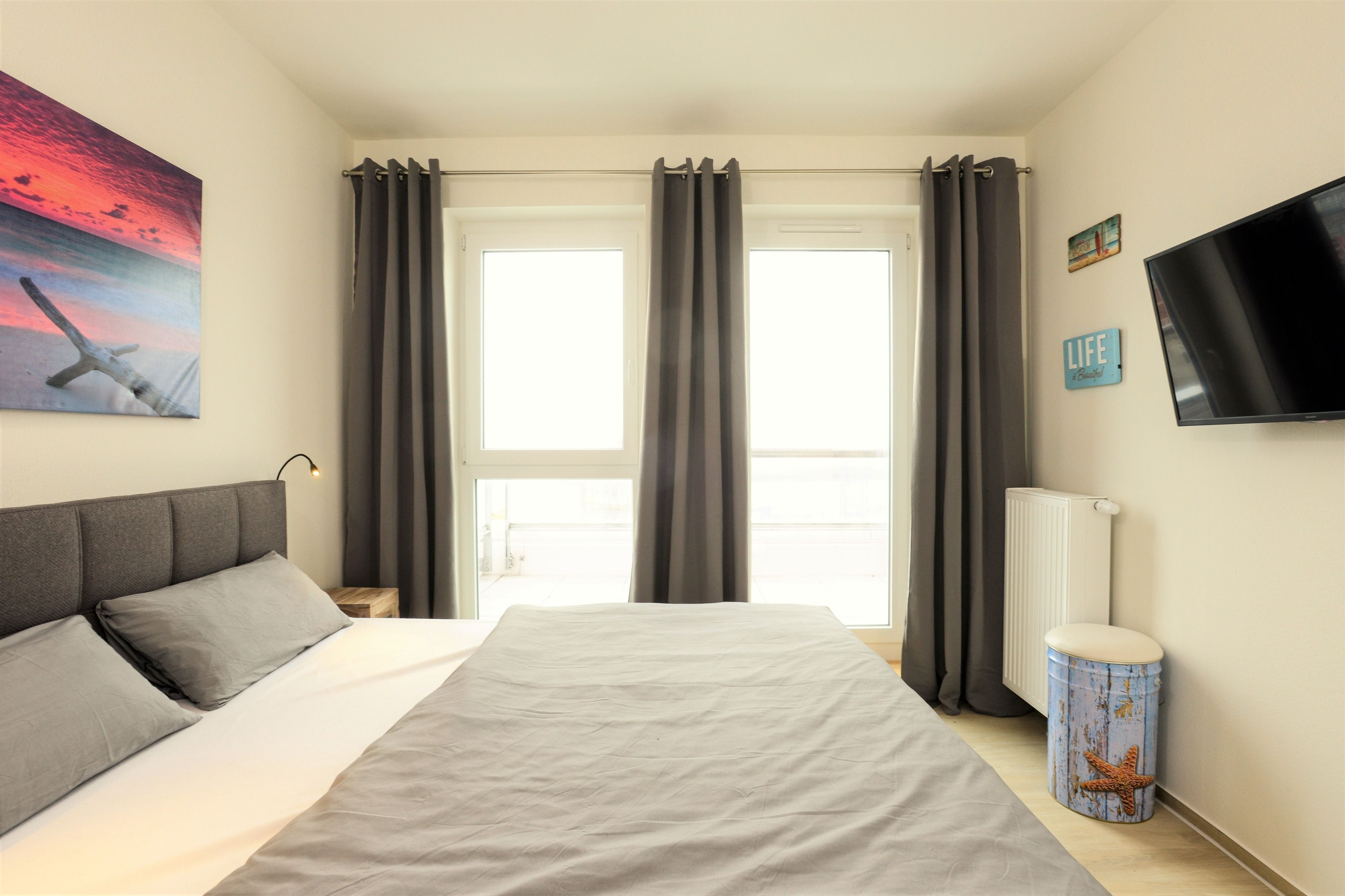 Nicht nur vom Wohnraum, sondern auch vom Schlafzimmer des Objektes aus können Sie den Blick auf die Ostsee genießen. Durch das große Boxspringbett und den eigenen Fernseher nächtigen Sie hier ebenso komfortabel wie im Hotel.