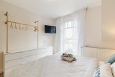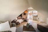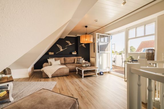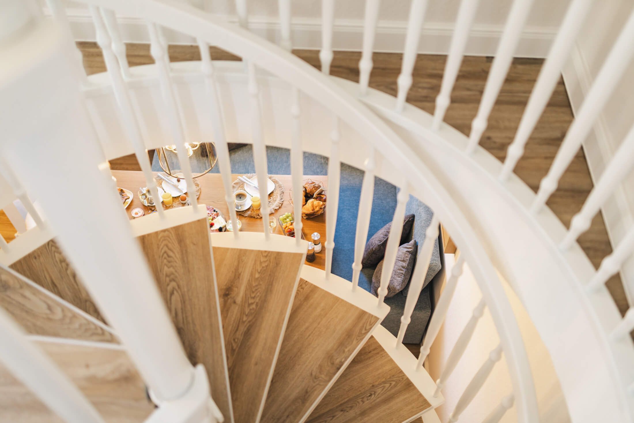 Über eine elegante Wendeltreppe gelangen Sie in den oberen Bereich der Wohnung, wo sich der helle und geräumige Wohnbereich befindet. Hier sorgt eine Aufbettung auf der bequemen Couch für zusätzliche Schlafplätze, die Flexibilität für größere Gruppen ermöglicht.