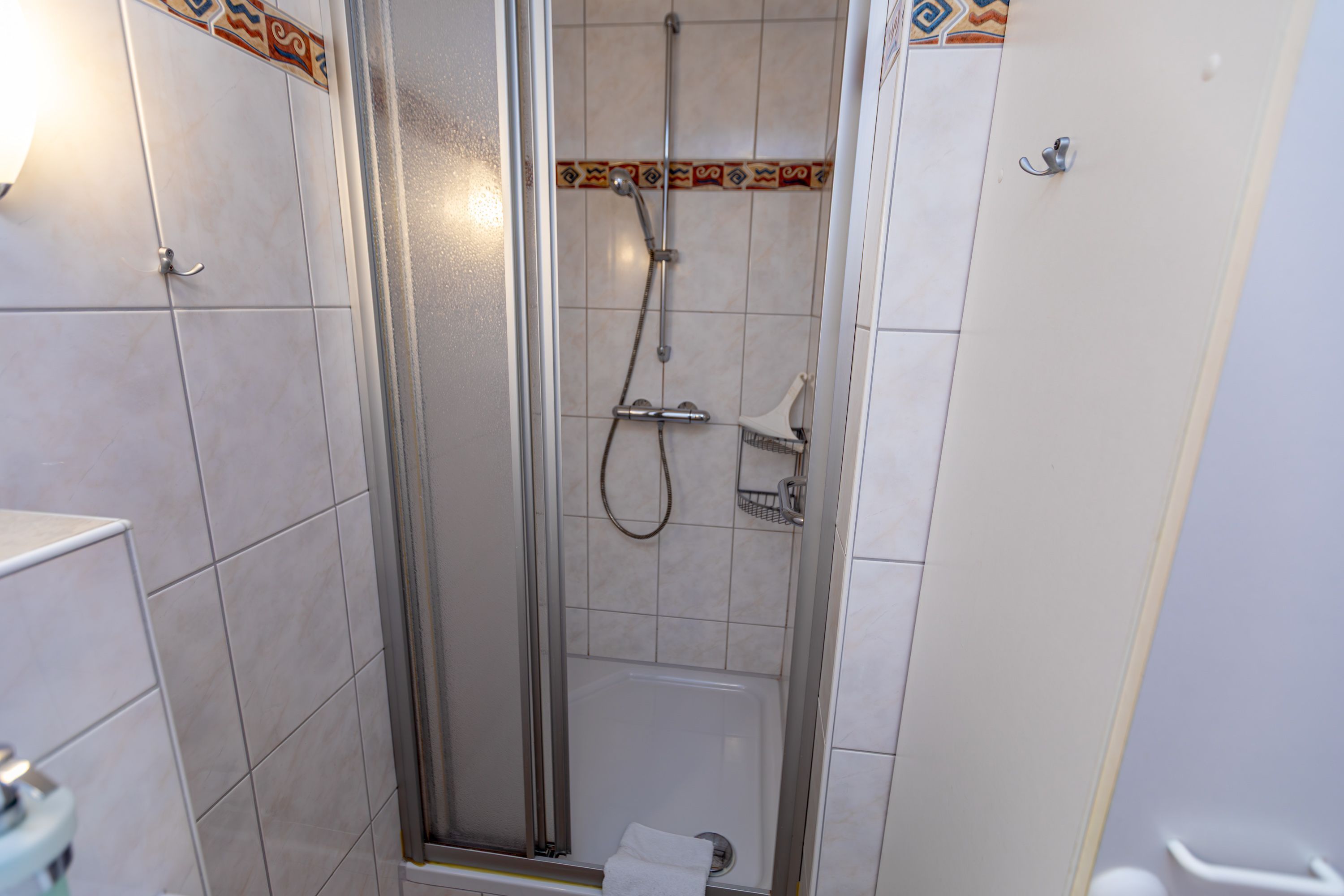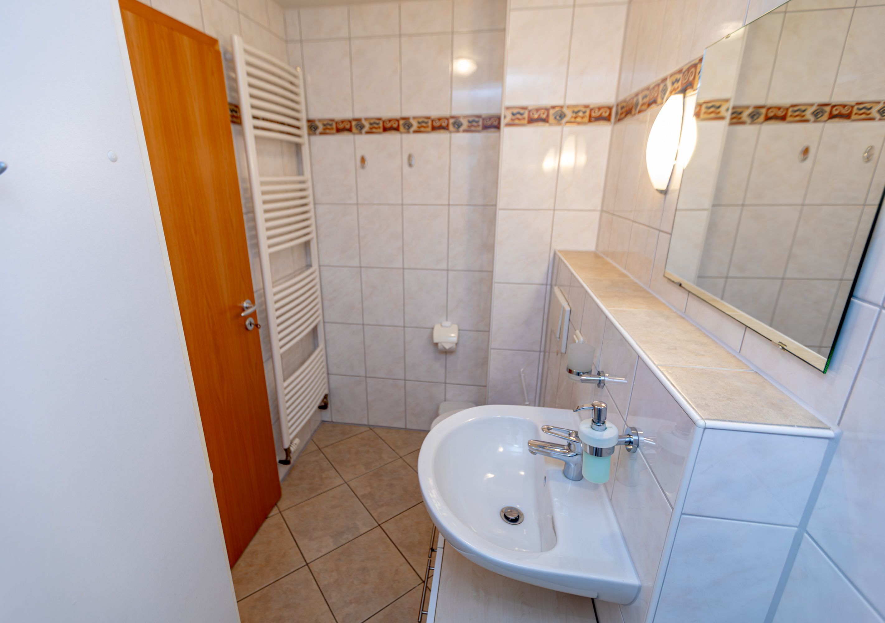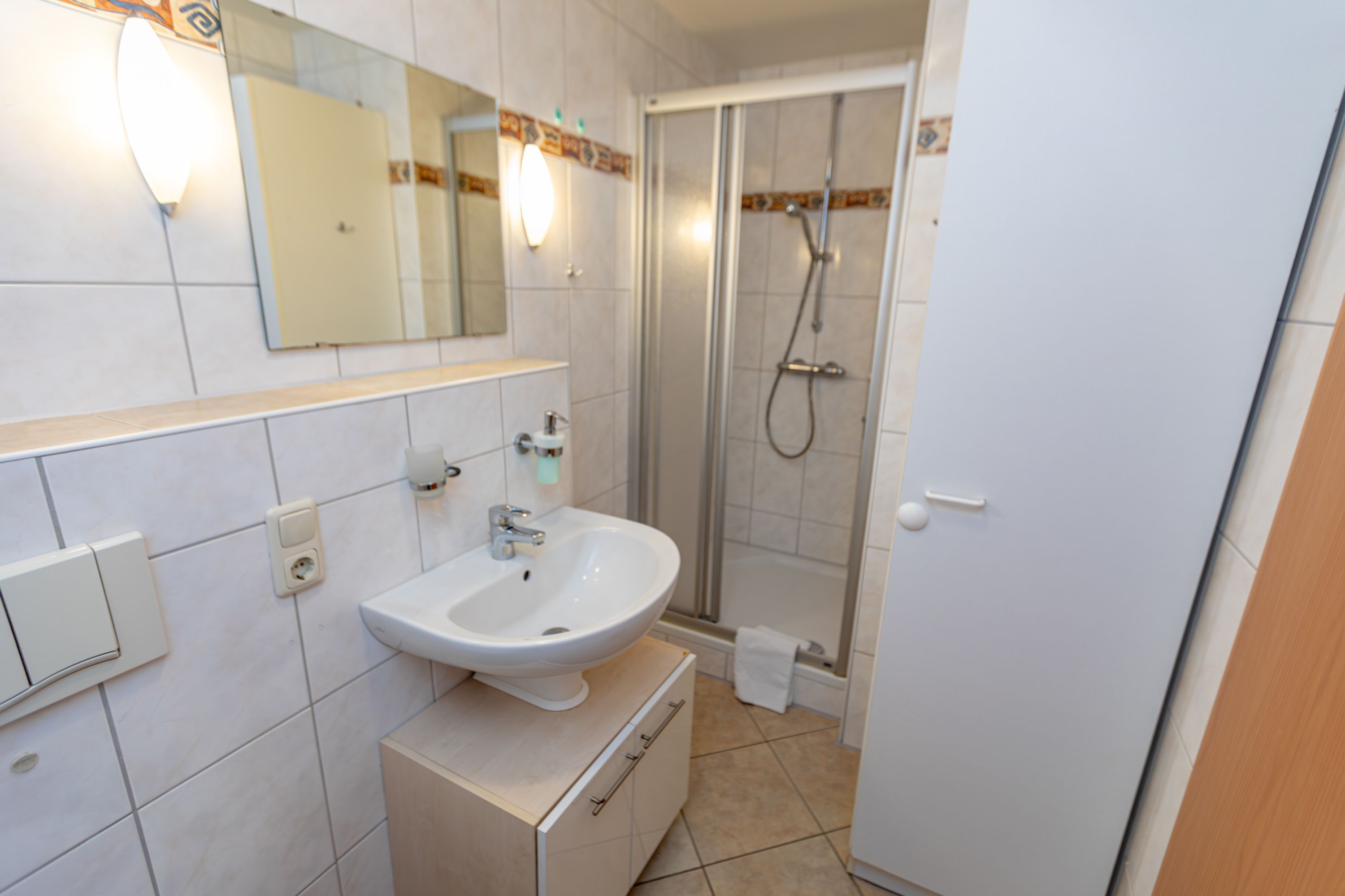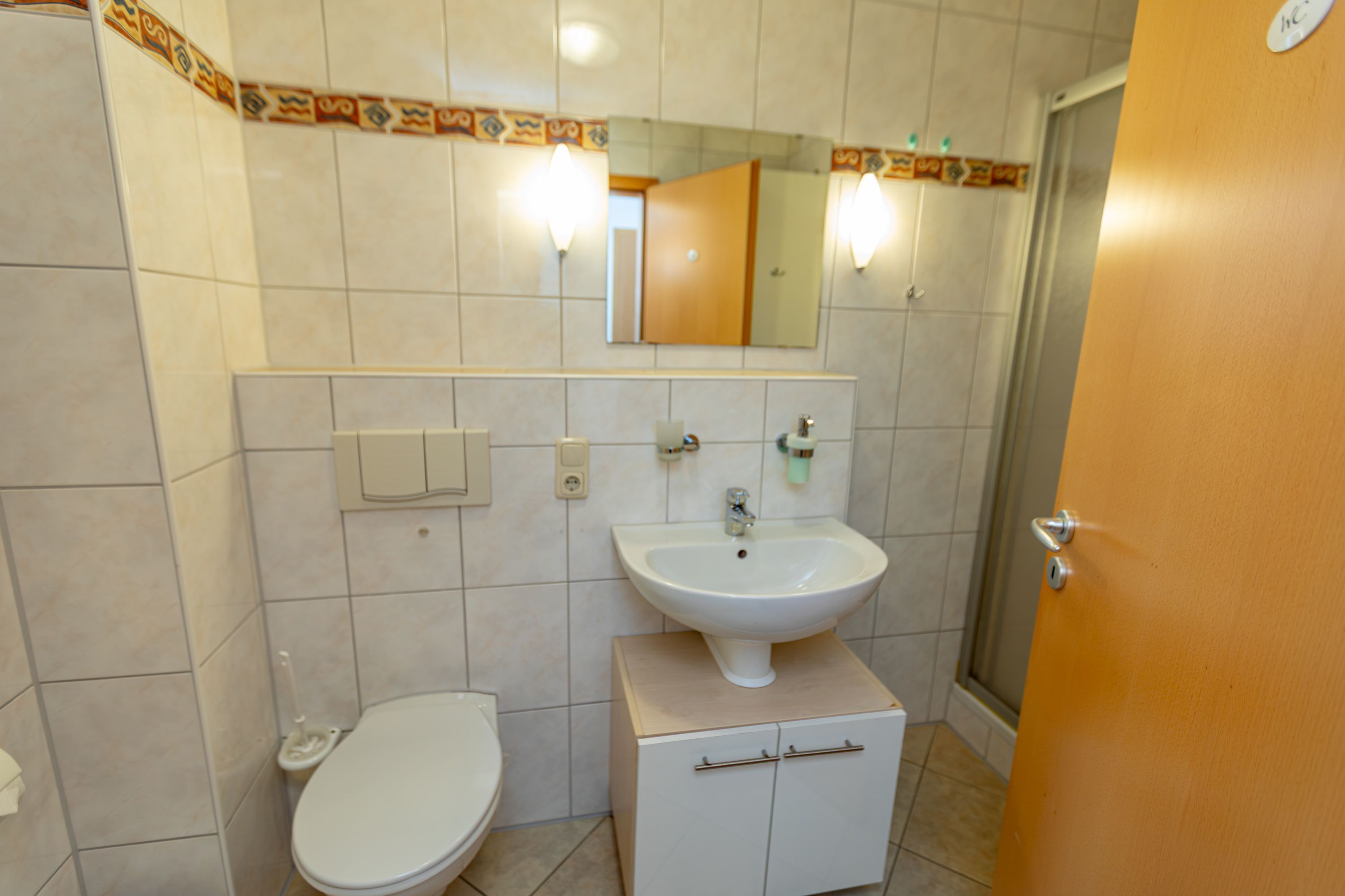 - Badezimmer mit Dusche, Waschtisch und WC