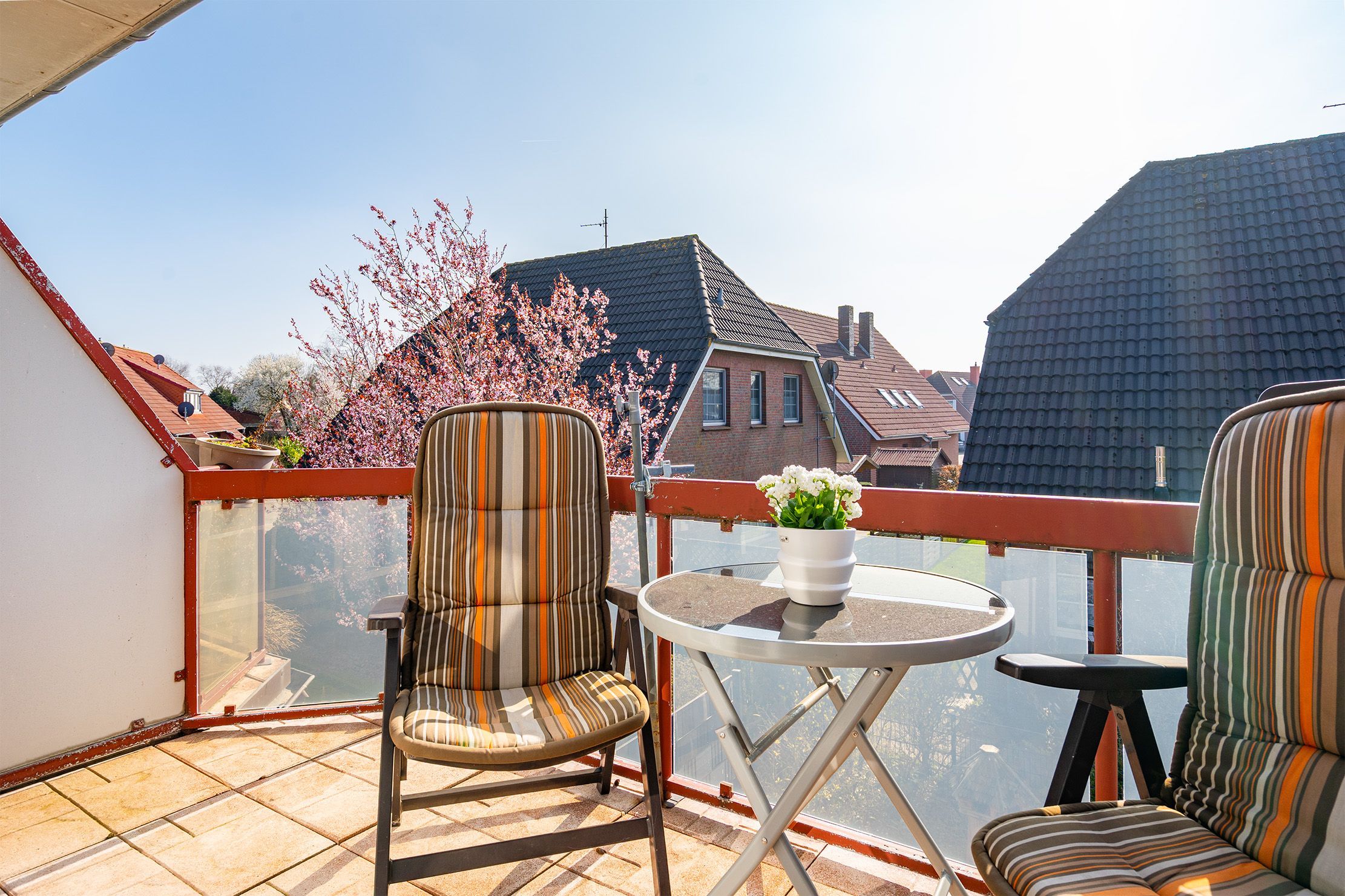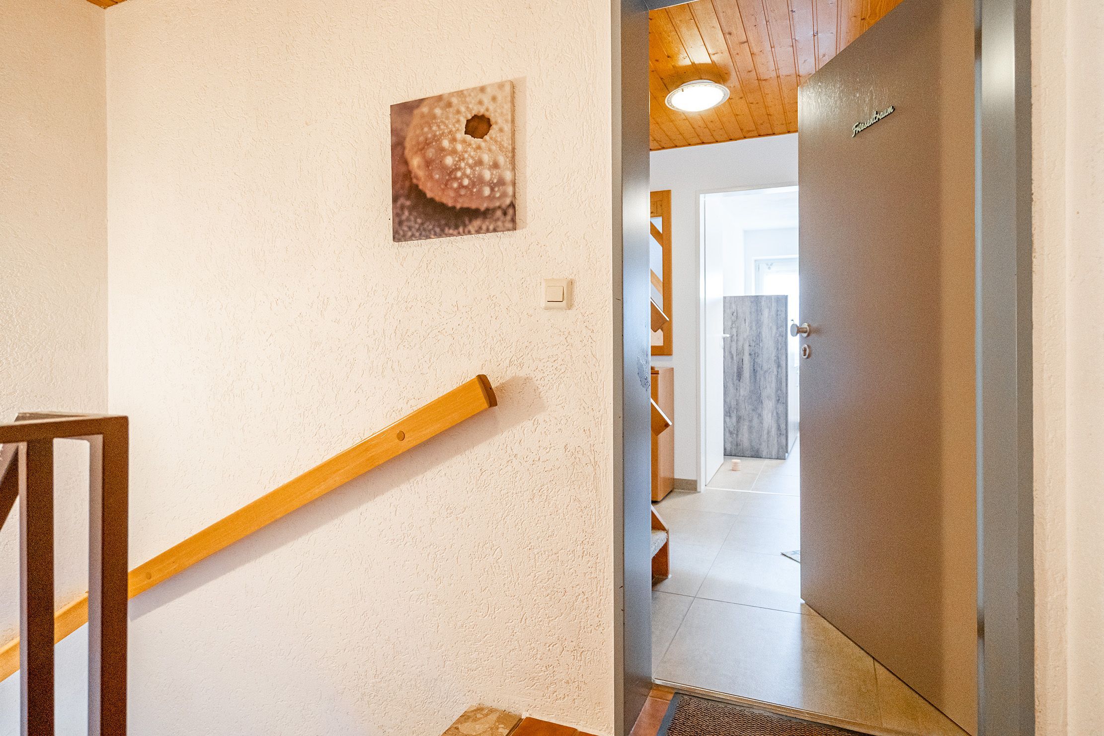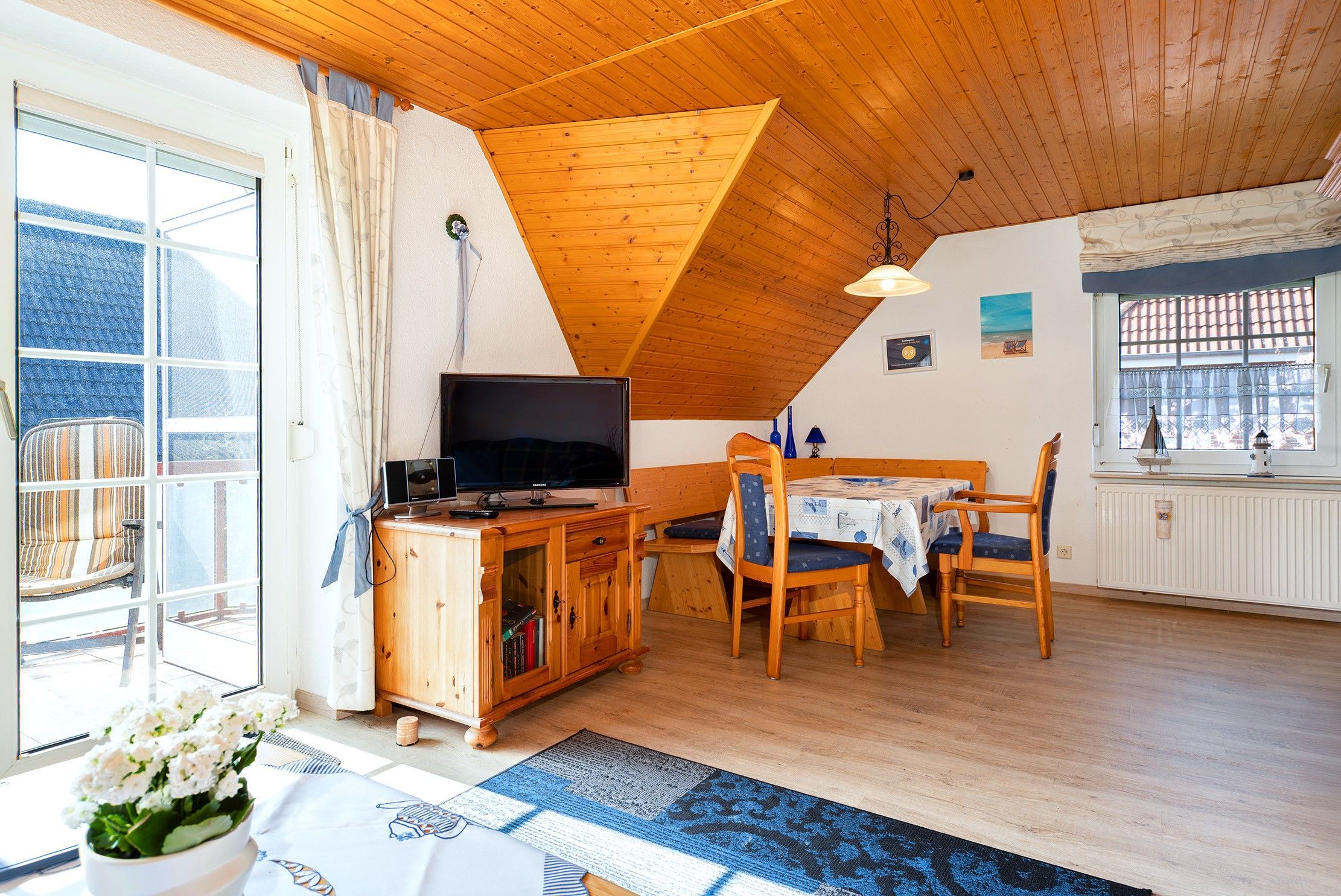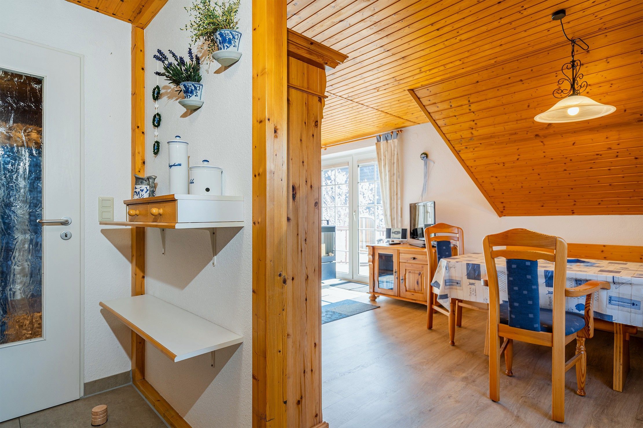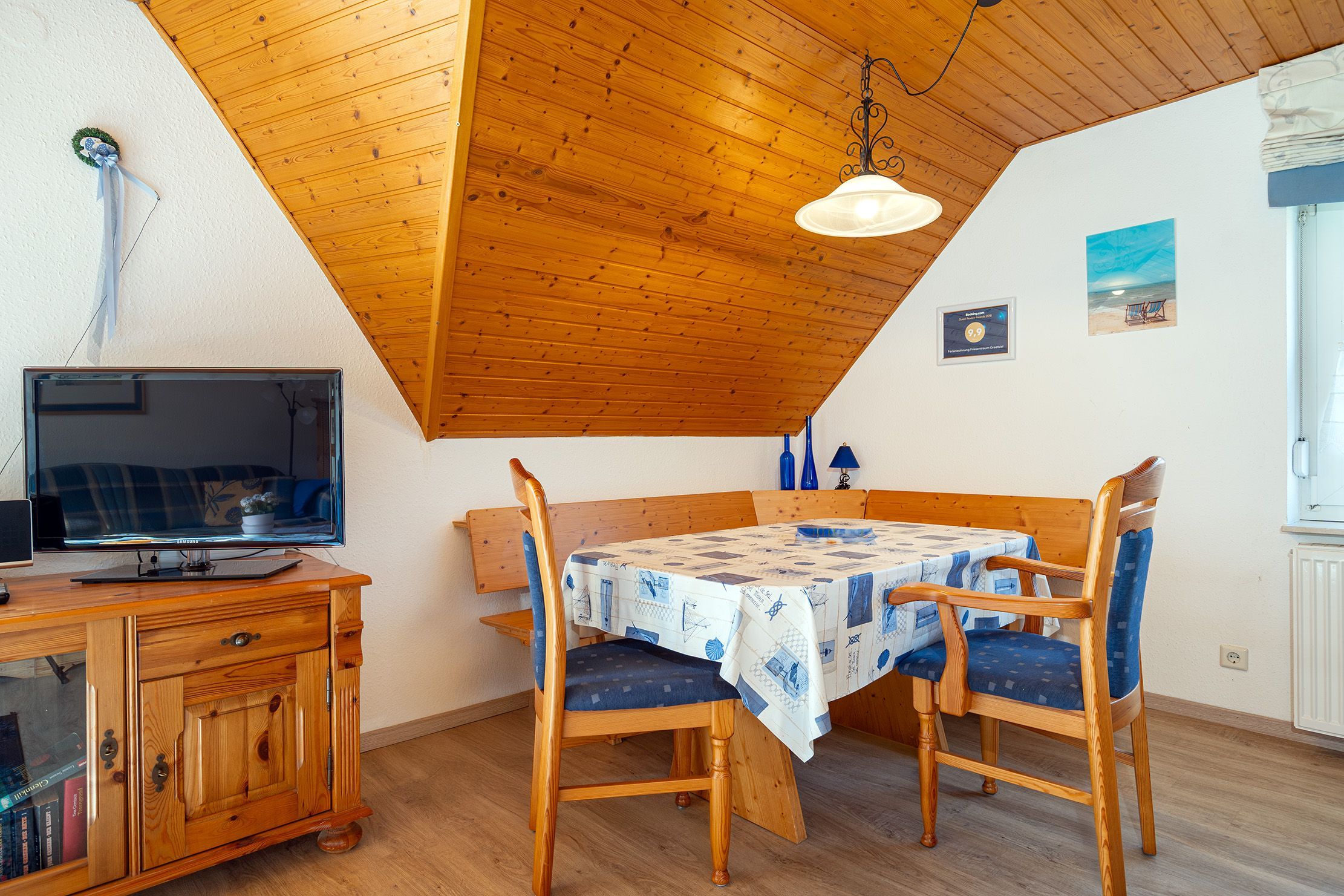Die Ferienwohnung Friesentraum befindet sich in einem traditionellen Ferienhausgebiet im Obergeschoss eines Hauses mit vier Wohneinheiten. Sie vereint auf charmante Weise ostfriesische Tradition mit modernem Wohnkomfort. Beim Betreten der Wohnung fällt sofort die liebevolle, traditionelle Einrichtung ins Auge: rustikale Holzmöbel, gemütliche Stoffe und typisch friesische Dekorationen schaffen eine warme, heimelige Atmosphäre. Der Wohnbereich und die Küche strahlen den gemütlichen Charakter eines klassischen Landhauses aus ideal, um zur Ruhe zu kommen. Gleichzeitig überzeugt die Wohnung mit modernen Akzenten: Das renovierte Tageslichtbad mit der ebenerdigen Dusche ist zeitgemäß ausgestattet. Auch eines der beiden Schlafzimmer wurde modernisiert und strahlt mit klaren Linien, hochwertigen Materialien und angenehmer Farbgestaltung eine frische, zeitlose Ruhe aus. Das zweite, traditionell gestaltete Schlafzimmer erreichen Sie durch eine Treppe und ist offen als Galerie gestaltet. Es bietet neben einem Schlafbereich auch einen Sessel. Die Wohnung bietet weiterhin einen Balkon, auf dem sich die frische Luft genießen lässt. Neben einem Fahrradabstellraum gibt es außerdem einen reservierten PKW-Stellplatz vor dem Haus.