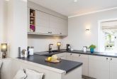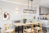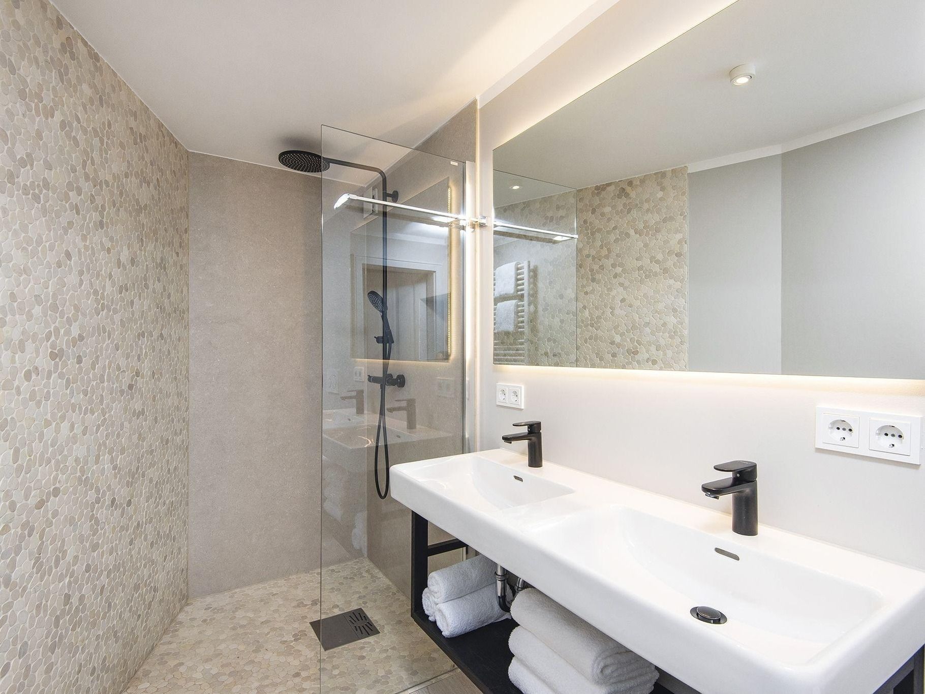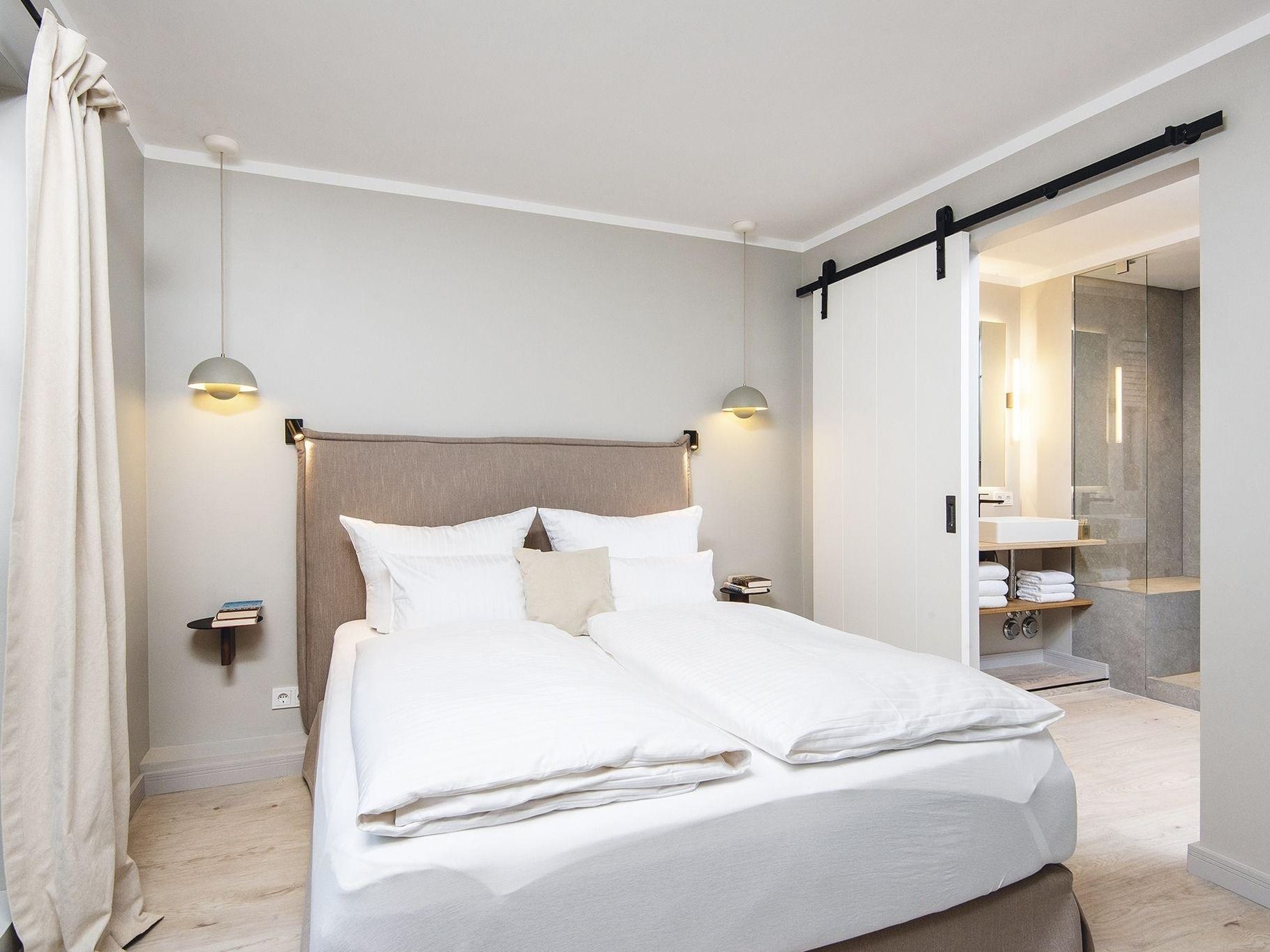 Wohnen im Dünental Klenterdeel in Keitum - Familienurlaub direkt am Watt. Das charmante Friesenhaus in dem diese Wohnung liegt, befindet sich am Ende einer ruhigen Sackgasse fernab der Straße. Das Quartier empfängt Sie im Erdgeschoss direkt im hell und modern gestalteten WohnEssbereich mit offener Küche und direktem Zugang zur privaten Terrasse mit tollem Blick auf das Weltnaturerbe Wattenmeer. Im Untergeschoss wird es gemütlich. Neben einem cozy Gästezimmer mit kleinem Doppelbett und separatem Gäste-WC, erwartet Sie noch ein weiteres Schlafzimmer mit Doppelbett und einem modernen Bad en suite. Hier dient die großzügige Dusche auch als Dampfsauna, perfekt für die typischen Nordseetage. Am Ende des Flurs mit den vielen Schränken befindet sich ein weiteres modernes Duschbad mit Doppelwaschbecken. Daneben dann das Kinderparadies mit Teppichboden, begehbarem Kleiderschrank und zwei Doppelstockbetten, wo vier kleine Urlaubsgäste herrlich träumen dürfen.