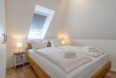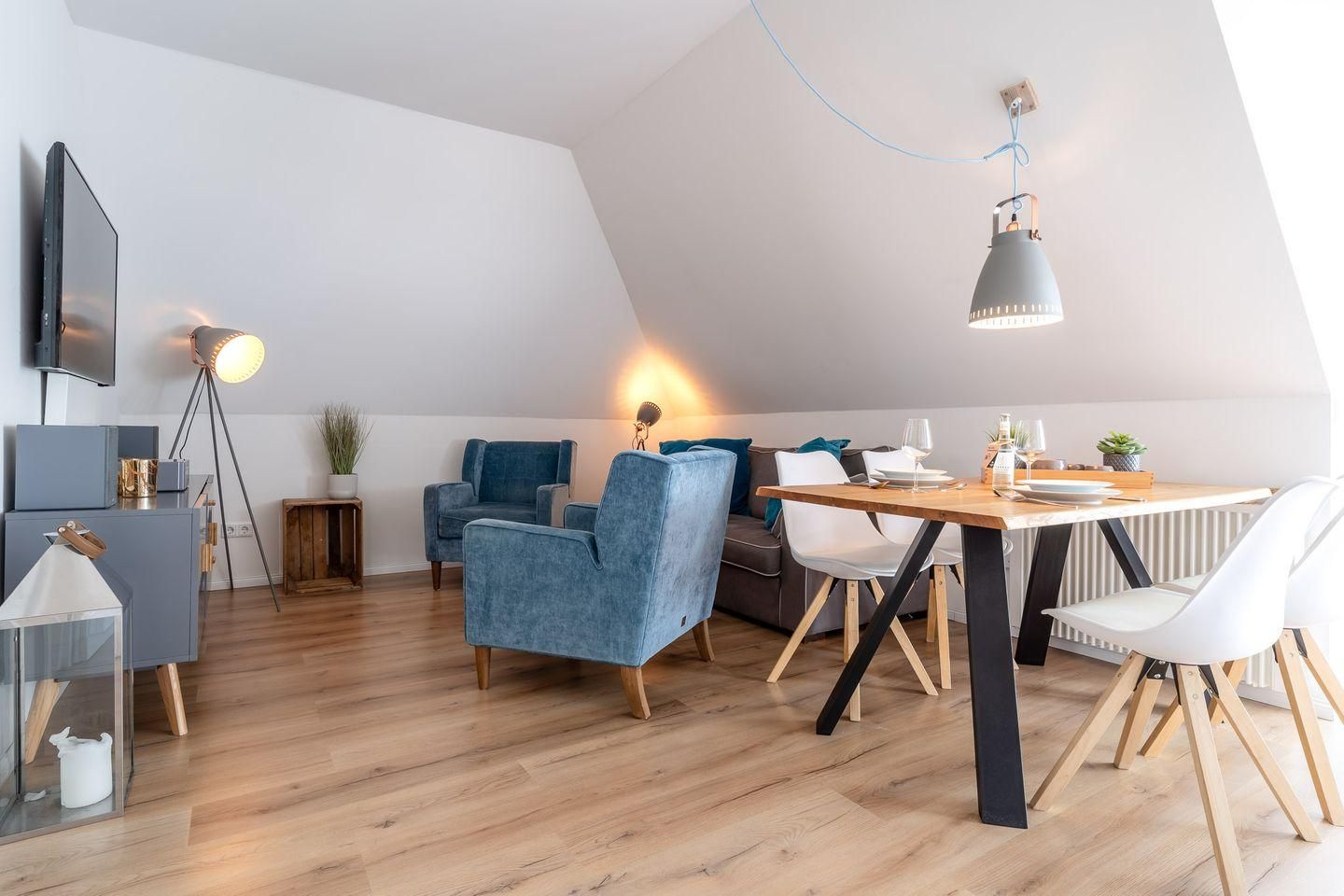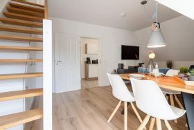 Die behagliche Ferienwohnung verfügt über zwei Schlafzimmer, in denen Sie nach einem erlebnisreichen Tag zur Ruhe kommen können. Beide Schlafzimmer sind im gleichen stilvollen Design gehalten, das durch einen hochwertigen Vinyl-Bodenbelag und eine angenehme Farbgebung besticht. Neben einem einladenden Wohnzimmer bietet die Unterkunft auch einen Essbereich, ideal für gesellige Abende mit Familie und Freunden.