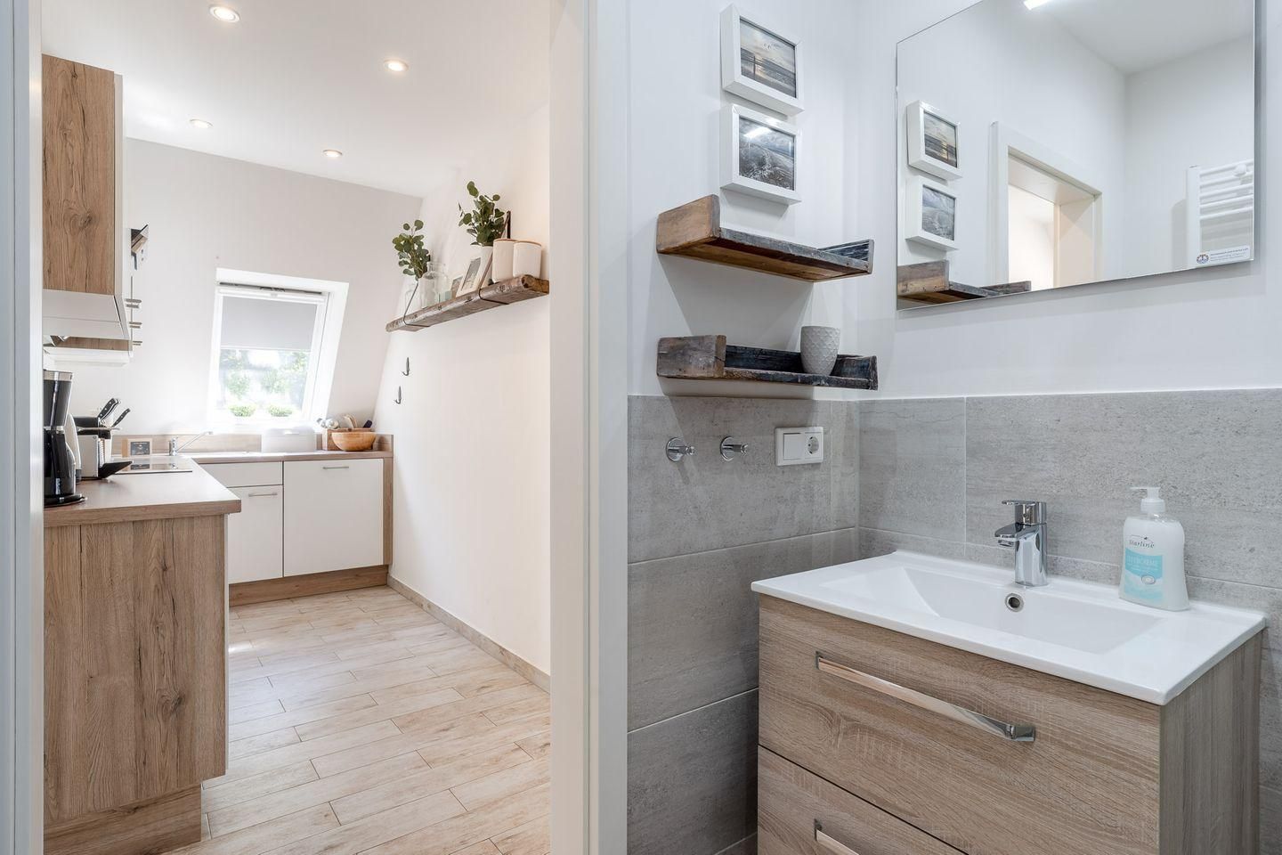 Das Badezimmer der Feinen Butze bietet eine Dusche, ein Waschbecken sowie ein WC. Selbstverständlich sind auch ein Haartrockner und ein Spiegel vorhanden, sodass Sie sich nach einem entspannenden Bad frisch machen können. Zudem ist die Unterkunft ein Nichtraucherobjekt und bietet eine angenehme Atmosphäre ohne störende Gerüche.