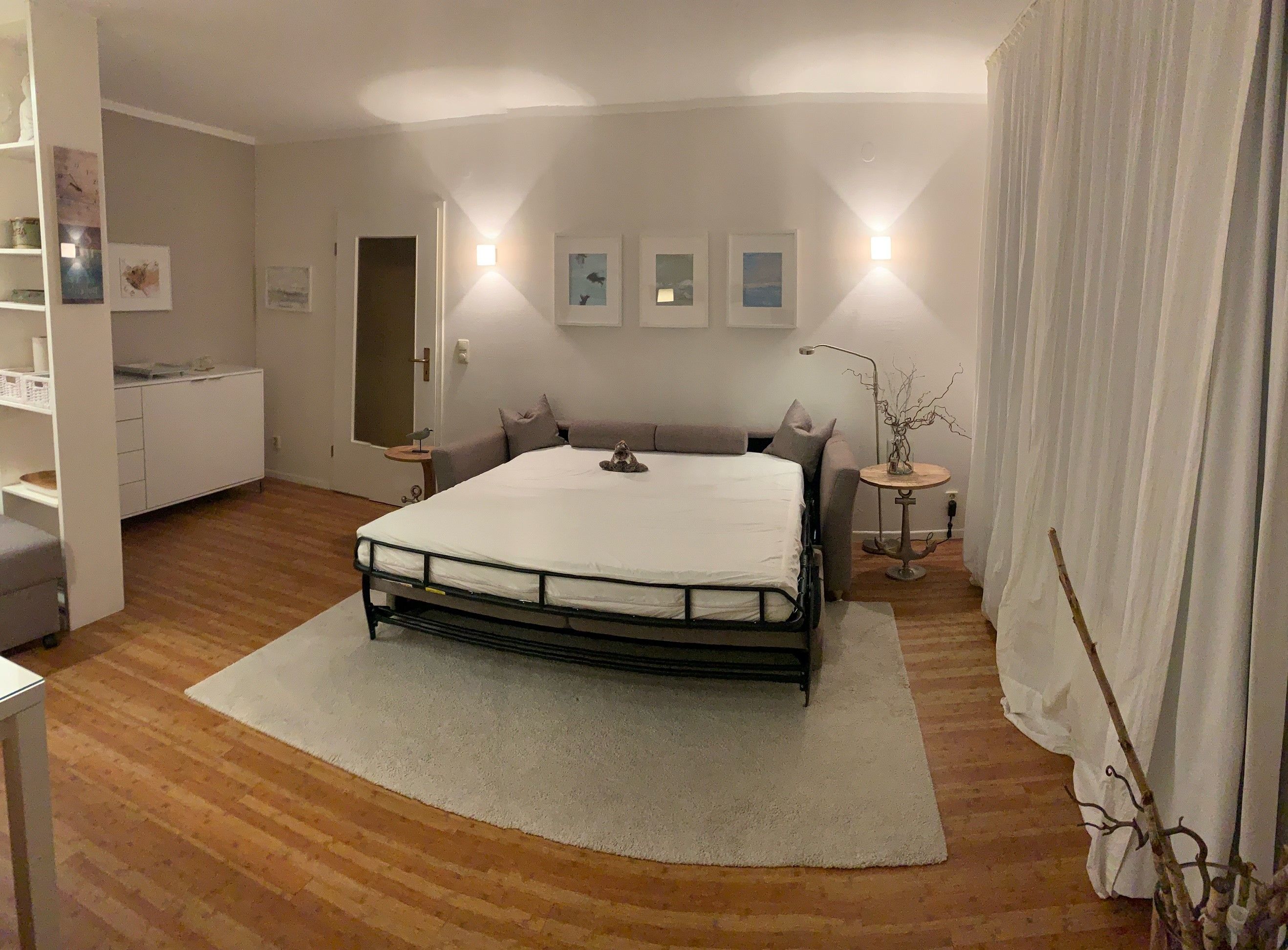Der Wohnbereich mit einem 40 LED Flachbildschirm, SAT-TV, HiFi-Anlage mit CD, Blue-Ray Player ist auch als Schlafbereich mit einer leicht umzubauenden Doppelbettcouch (170 cm x 200 cm) mit sitzhoher Liegefläche und Verdunkelungsgardinen nutzbar.