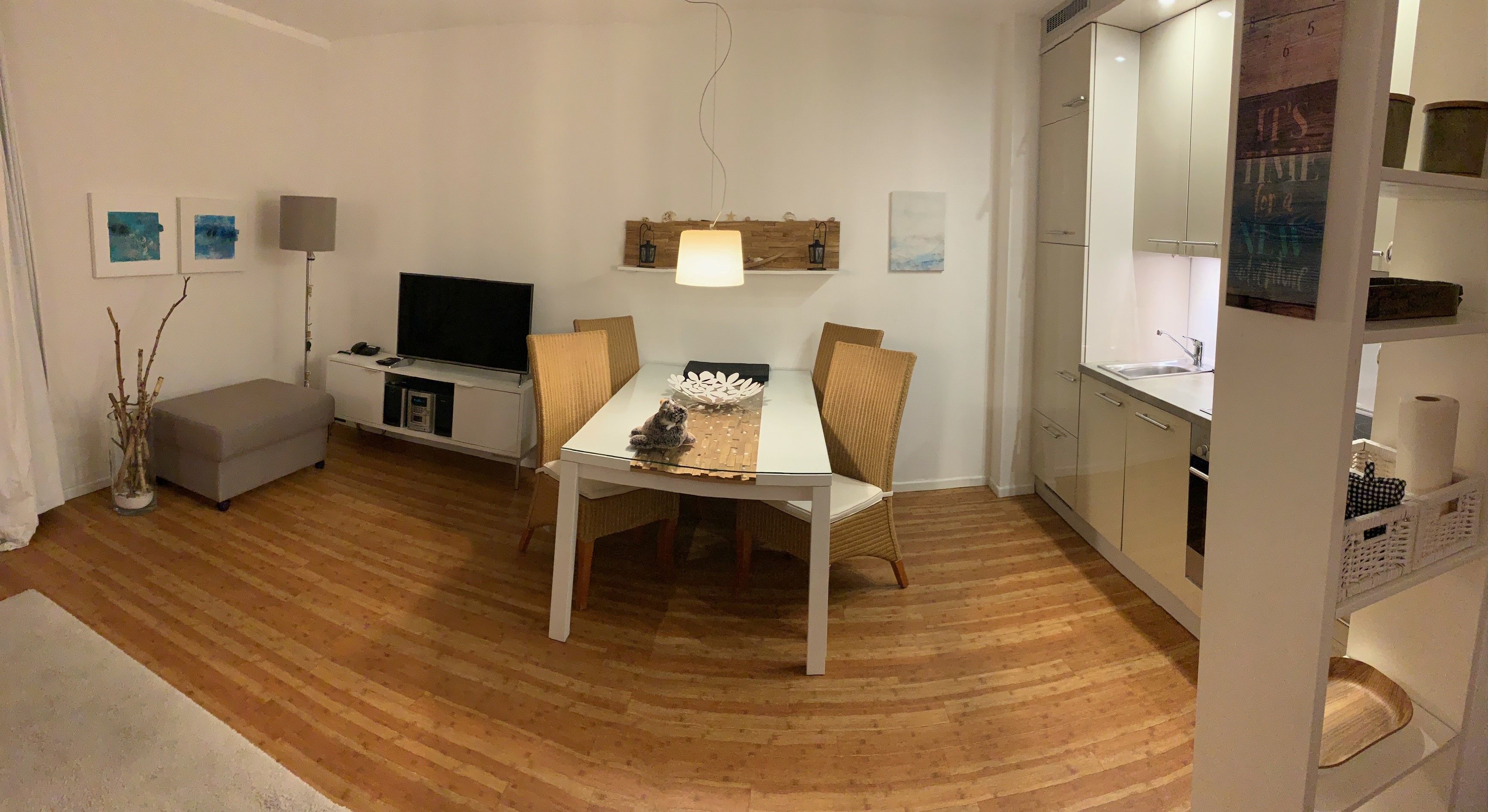 Im Essbereich befindet sich eine moderne Küchenzeile. Ein leiser Kühlschrank sowie eine geräuscharme Spülmaschine, eine Mikrowelle und die üblichen Haushaltskleingeräte gehören zur weiteren Ausstattung.
