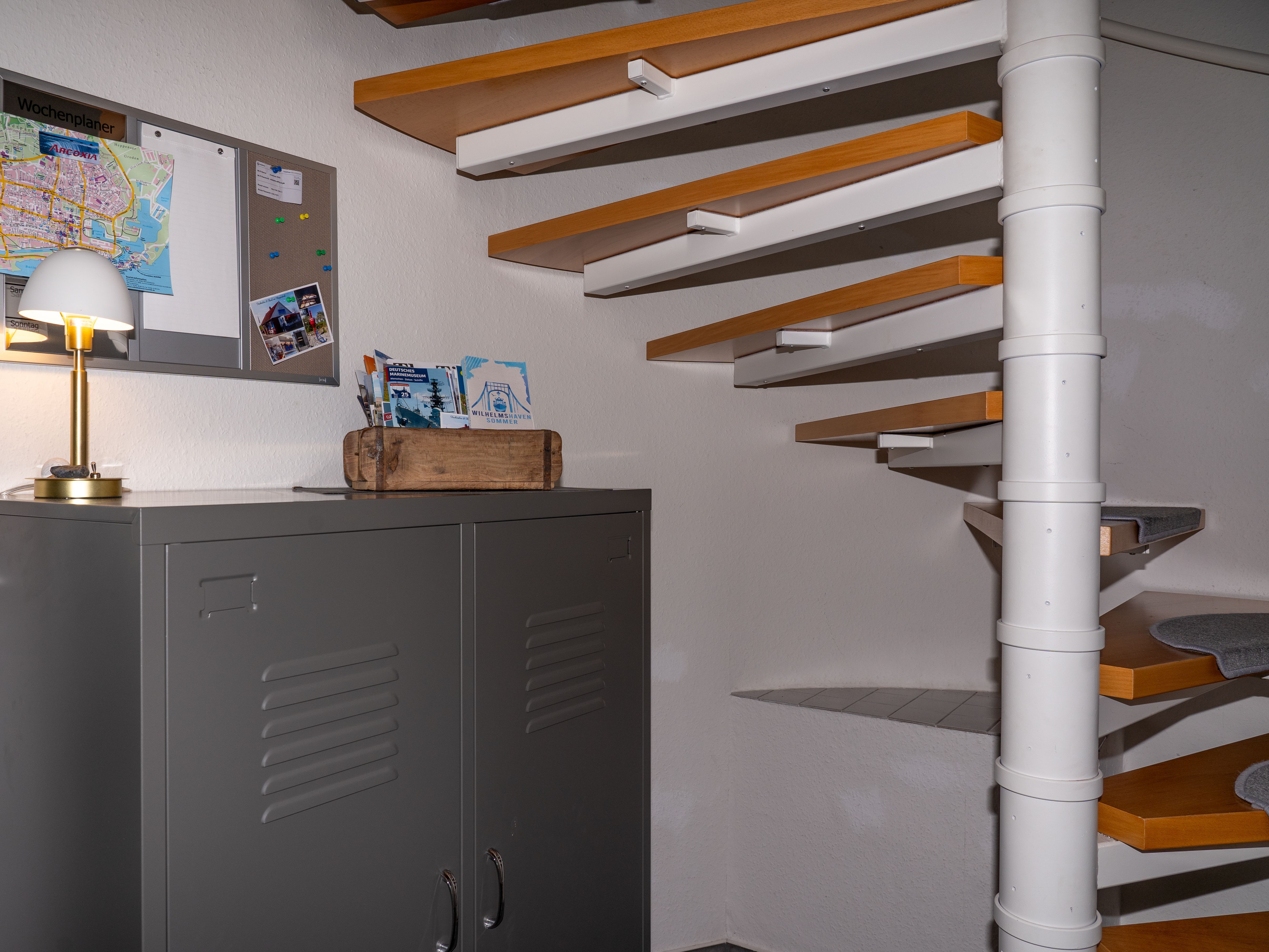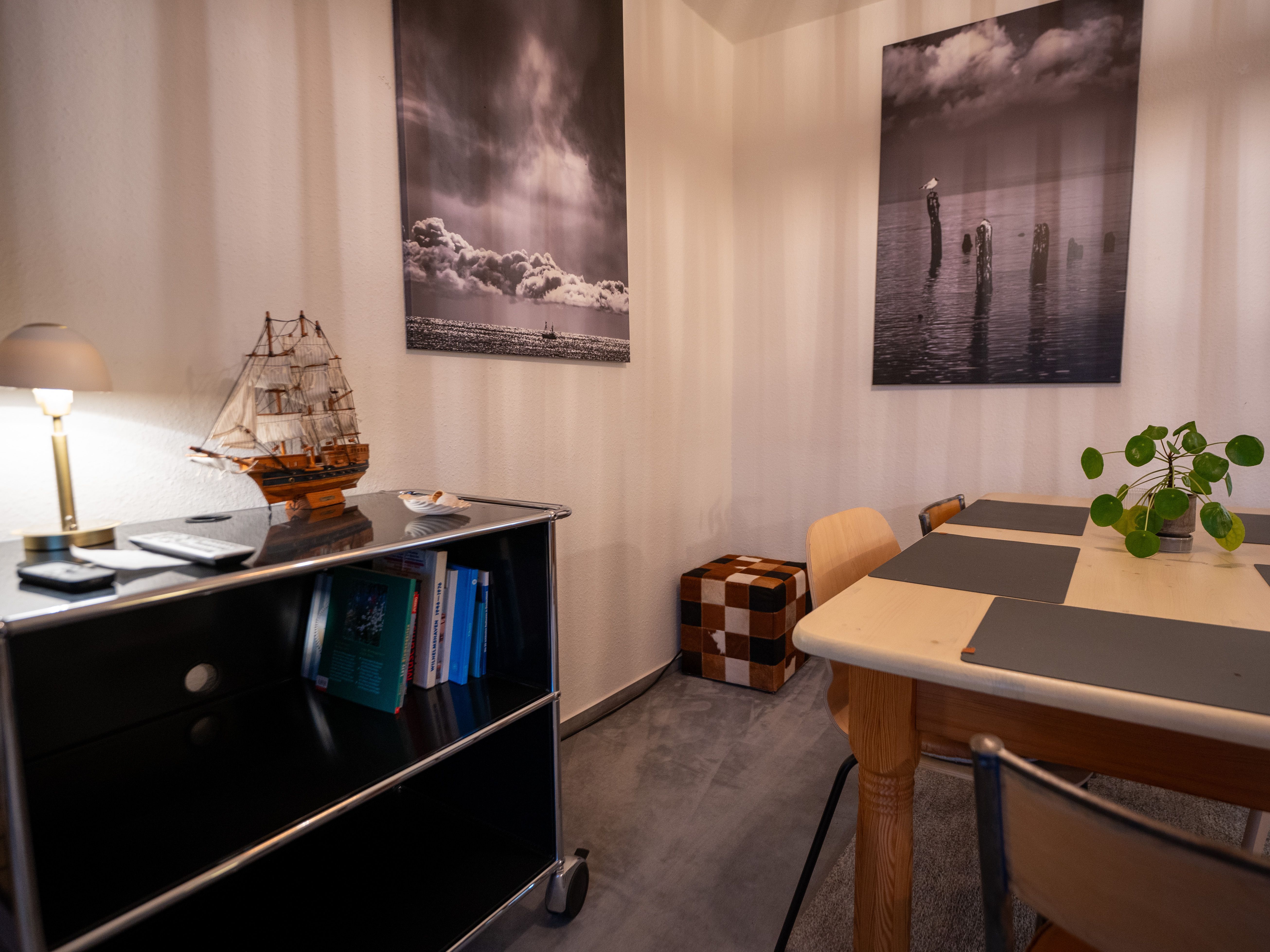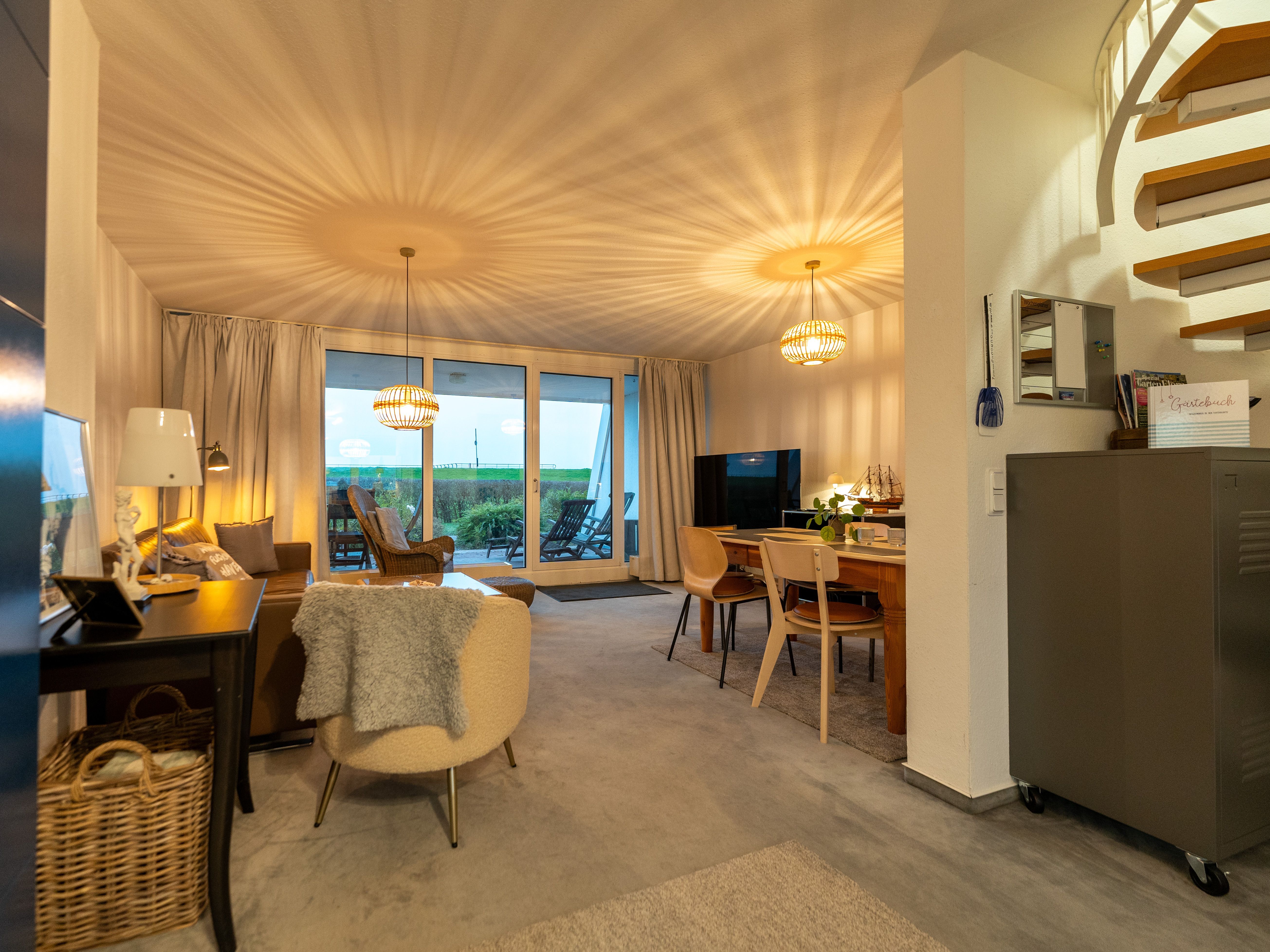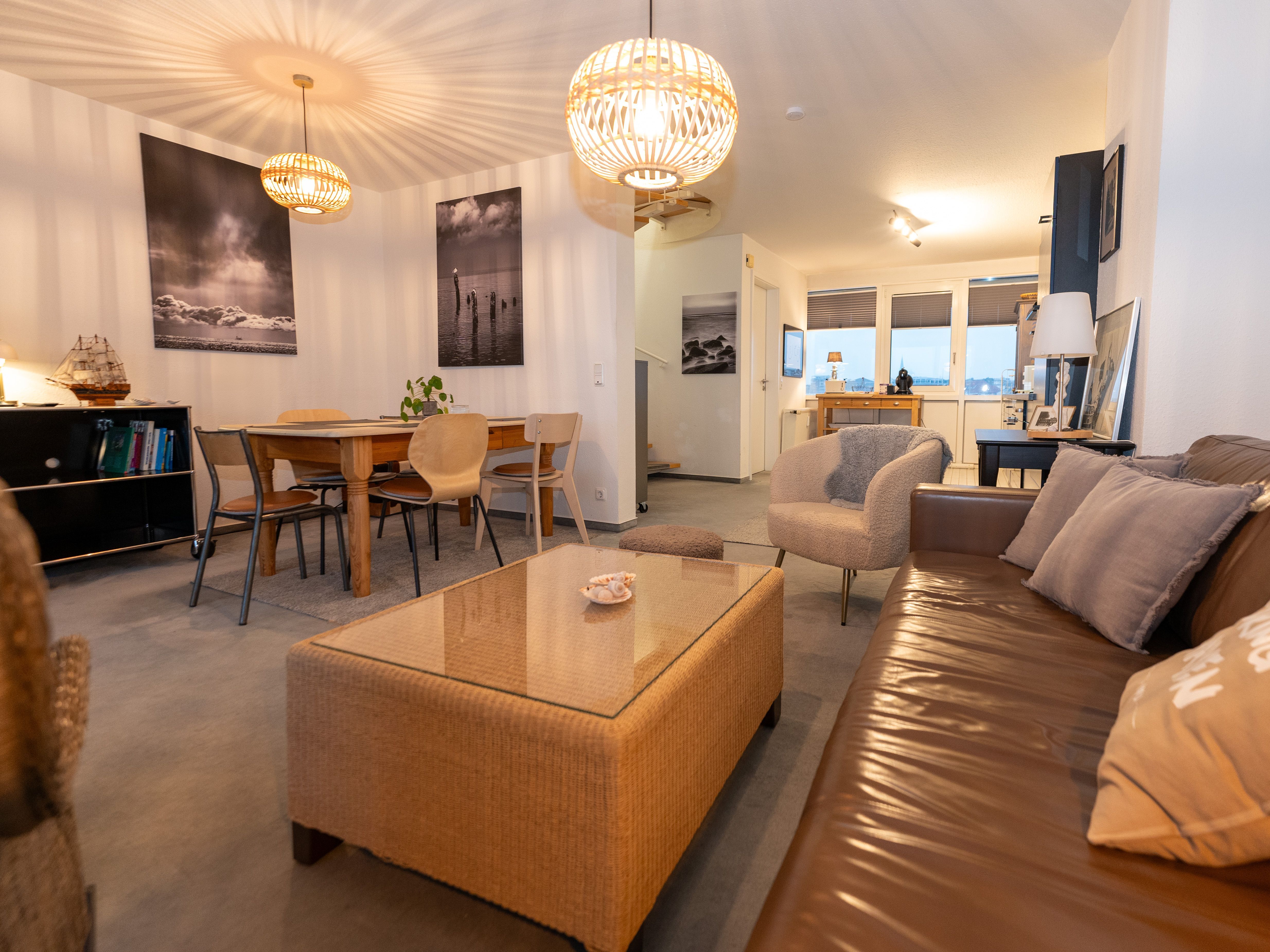 Die Maisonettewohnung befindet sich im Erd- und im 1. Obergeschoß des Helgoland Avantgarde, einer repräsentativen Wohnanlage am Südstrand der Nordseestadt Wilhelmshaven. Im Erdgeschoß befindet sich der offene Wohn-/Eßbereich mit Blick auf den maritimen Yachthafen und direkten Zugang zum Südstrand. Im 1. Obergeschoß befinden sich zwei Schlafzimmer, das größere ist mit einem Doppelbett ausgestattet, das kleinere mit einem Etagenbett. Beide Zimmer mit Blick auf den Binnenhafen. Die Wohnung verfügt über einen eigenen PKW-Stellplatz.