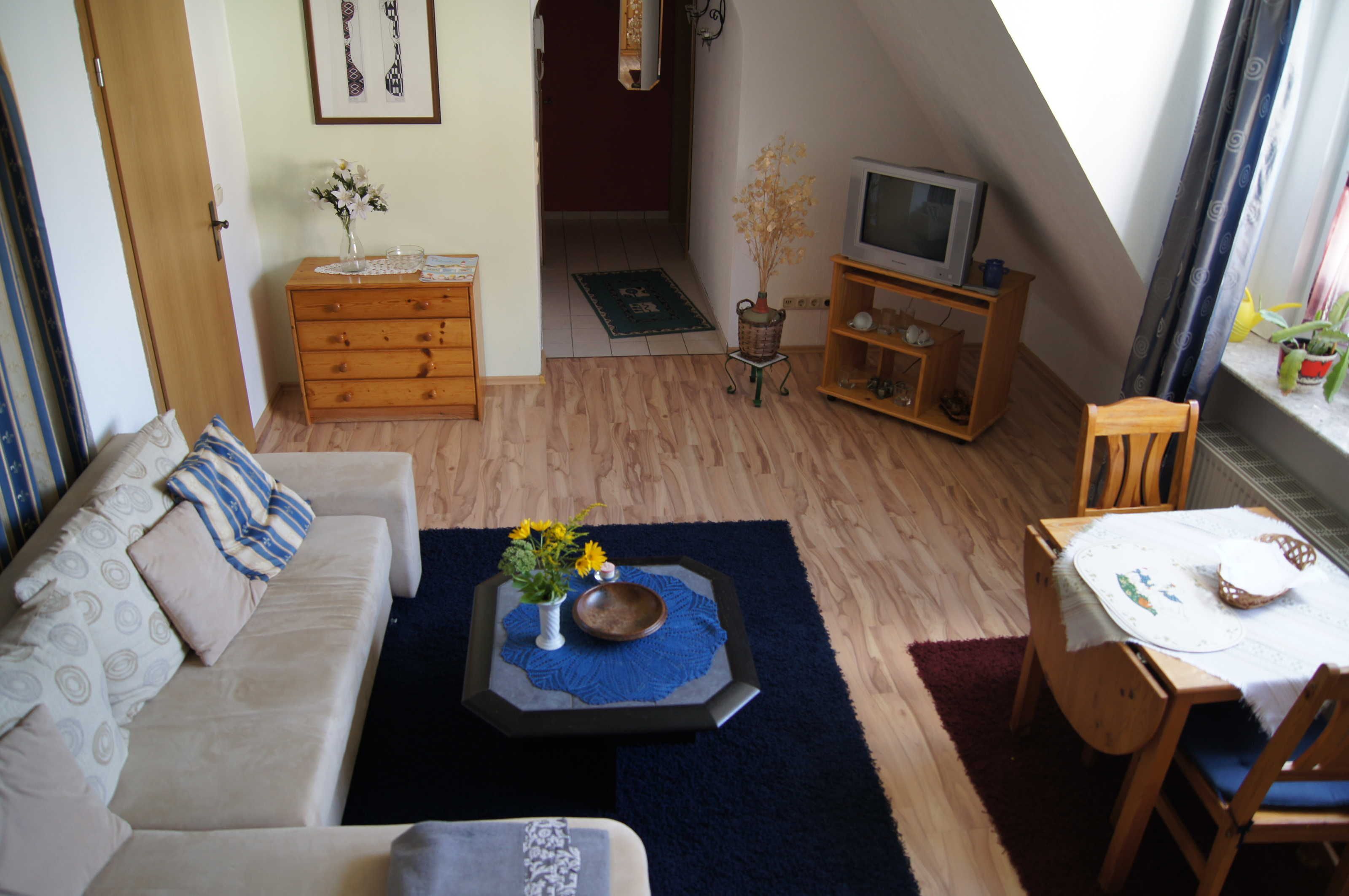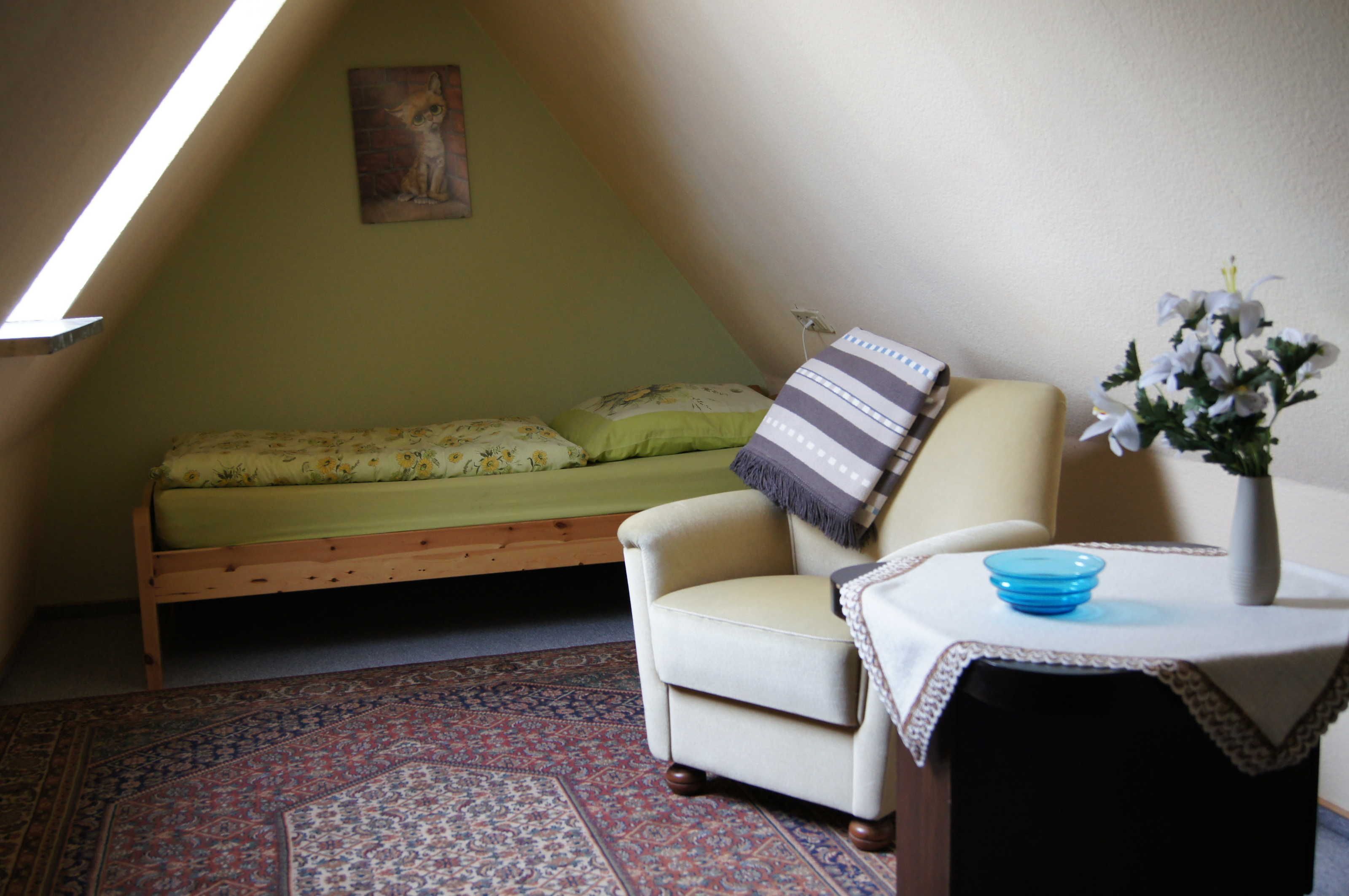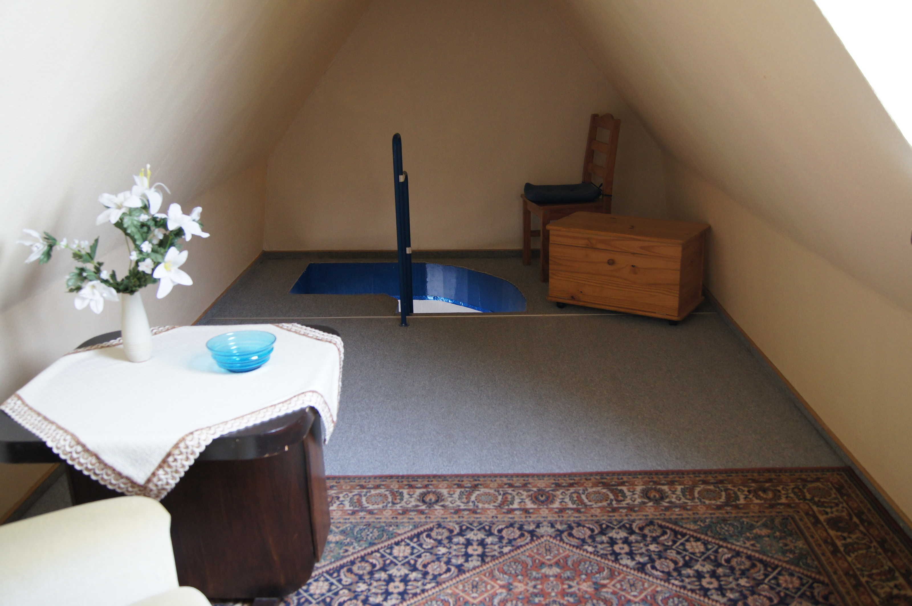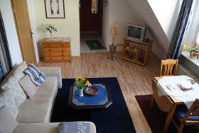 Ein 40 m² Appartement im 1. Obergeschoss / Dachgeschoss für max. 3 Personen. Das Appartment verfügt über einen kombinierten Wohn-Schlafbereich und zusätzlich ein Schlafbereich für eine Person im Dachgeschoss. Dieser Schlafbereich ist über eine Wendeltreppe erreichbar (für Kinder unter 8 Jahre nicht geeignet). Seperate Küche. mit Backofen, Mikrowelle Kühlschrank, 4-Plattenherd und Spülbereich. Im kombinierten Wohn-Schlafbereich befindet sich ein Doppelbett etwas separat, eine gemütliche Sitzecke, auch als Schlafcouch nutzbar, mit Flat-TV und Essbereich.