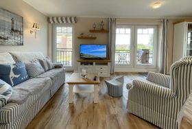 Die barrierefreie 51 m² große Ferienwohnungerwohnung ist bequem per Aufzug erreichbar und bietet Platz für bis zu 3 Personen. Neben einem separaten Schlafzimmer überzeugt der lichtdurchflutete Wohn-Essbereich mit stilvollem Interieur und einem komfortablen Schlafsofa. Die moderne Küche ist voll ausgestattet und lädt zum gemeinsamen Kochen ein.