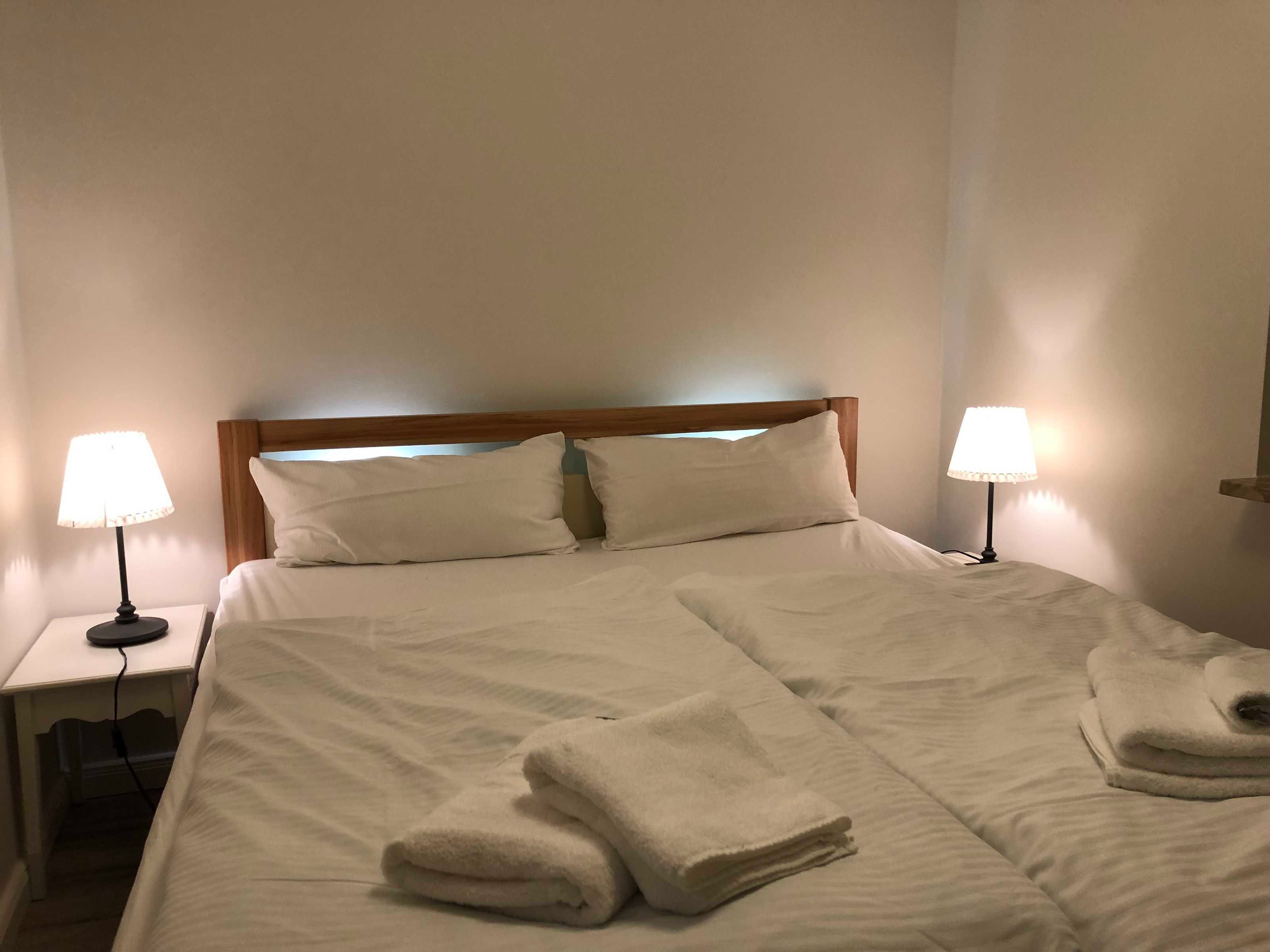 • Im Schlafzimmer befindet sich ein Doppelbett mit Nachttischen