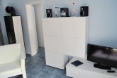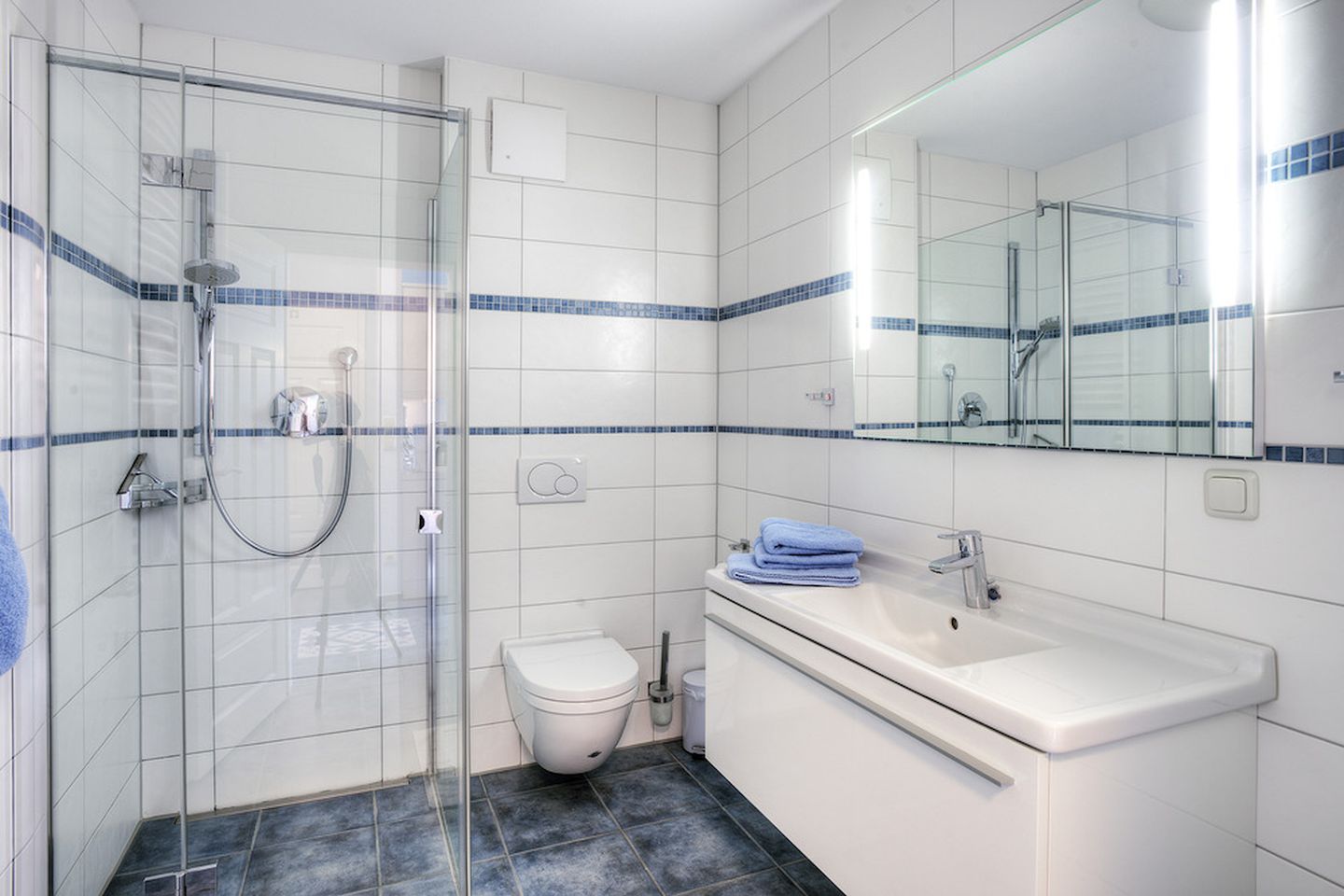 Das separate Schlafzimmer bietet ausreichend Stauraum, eine Kommode und einen Ganzkörperspiegel. Die Schlafmöglichkeiten sind auf maximal drei Gäste ausgelegt, wobei auch Babys herzlich willkommen sind. Das moderne Badezimmer ist mit einer bodengleichen Dusche, WC, Waschbecken, Spiegel, Kosmetikspiegel und Haartrockner ausgestattet.