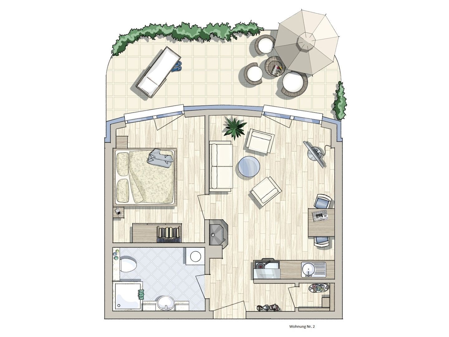 Die Ferienunterkunft de Obendtied - Wohnung 2 befindet sich im Erdgeschoss eines modernen Gebäudes in der Hafenstraße 9 im renommierten Ostseeheilbad Zingst. Diese 44 m² große Nichtraucherwohnung ist geschmackvoll eingerichtet und eignet sich optimal für Familien oder Paare mit bis zu drei Schlafmöglichkeiten. Ein besonderes Augenmerk wurde auf eine allergikerfreundliche Ausstattung gelegt, die unter anderem Fliesenböden in Wohn- und Schlafzimmer sowie Fliegengitter umfasst.