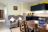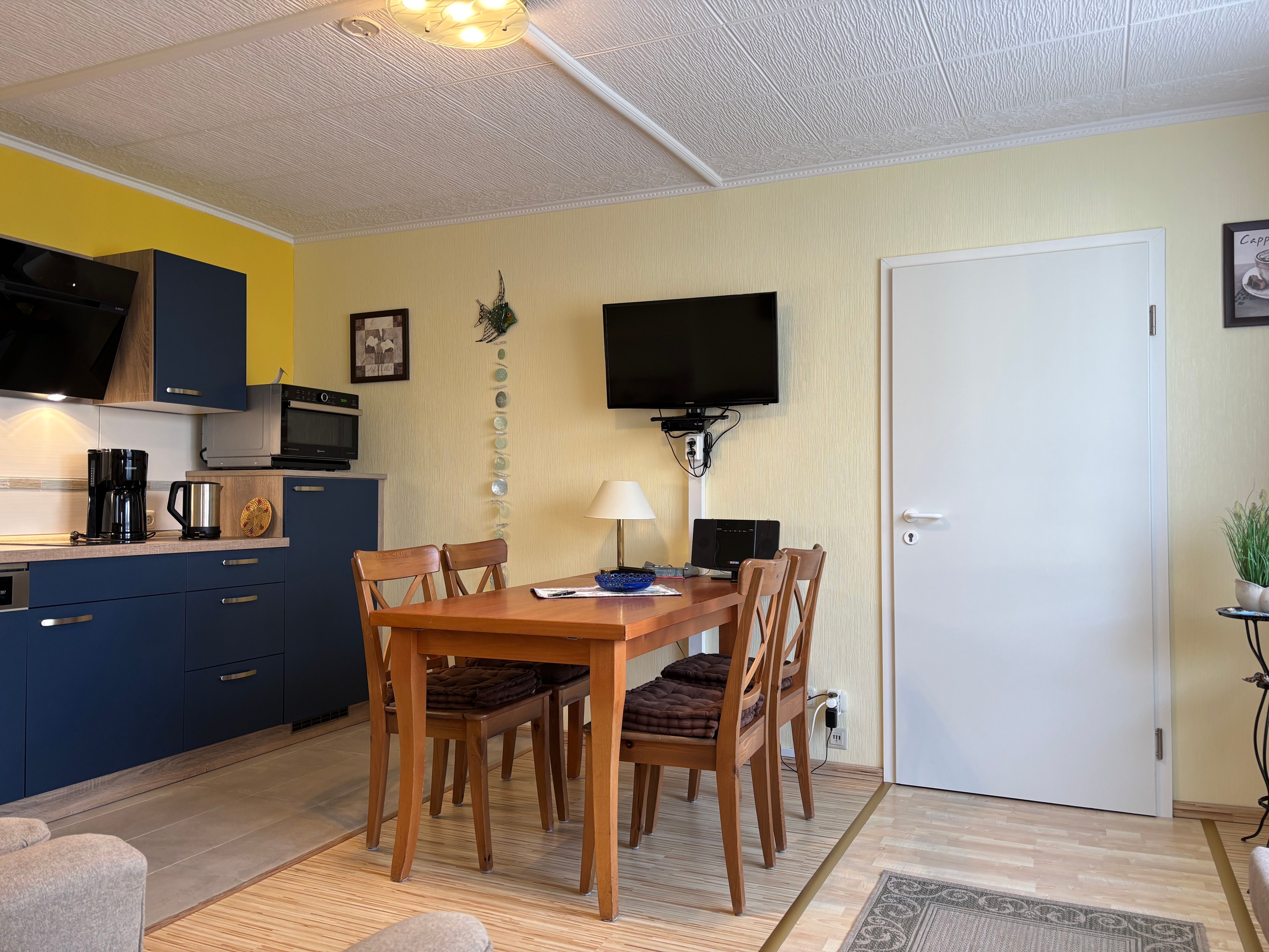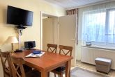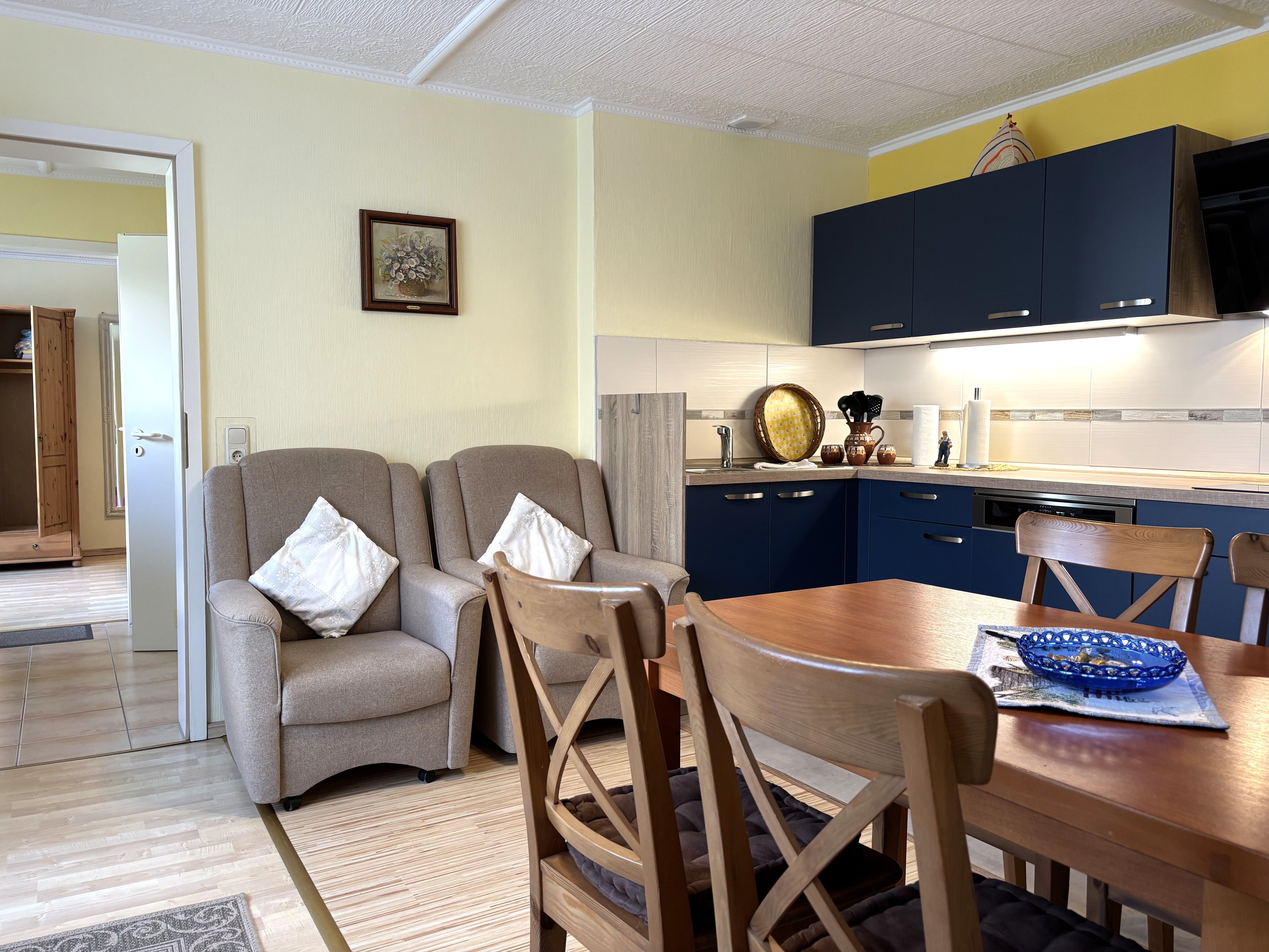 Die offene Küche ist vollständig ausgestattet und lässt keine Wünsche offen: Backofen, Herd, Geschirrspüler, Kühlschrank mit Gefrierfach, Kaffeemaschine, Toaster und Wasserkocher stehen Ihnen zur Verfügung. Neben dem Essplatz befinden sich in der Küche auch zwei bequeme Sessel sowie ein weiterer Fernseher, sodass auch hier ein gemütlicher Aufenthaltsbereich entsteht.