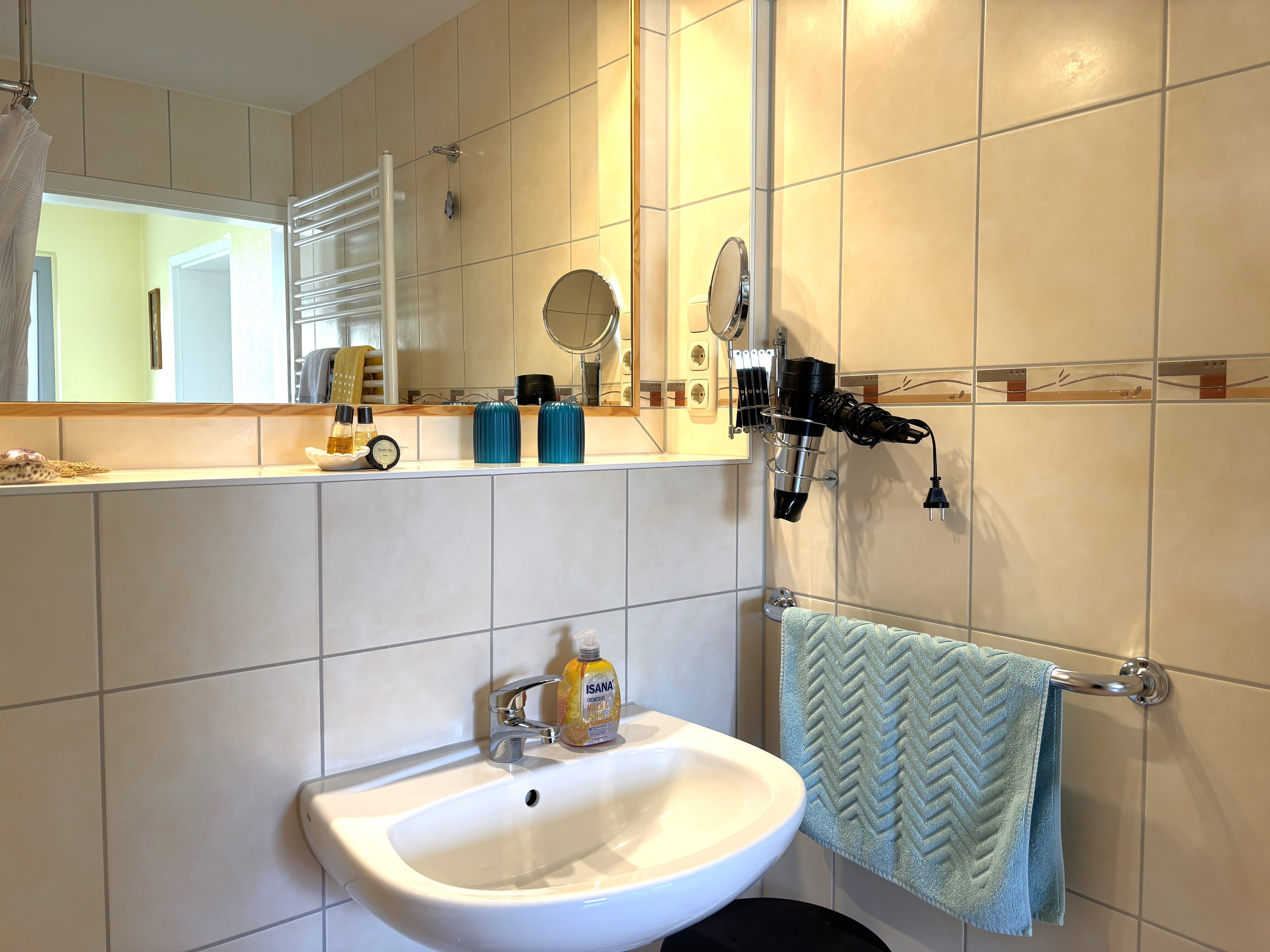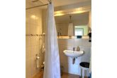 Das Badezimmer ist mit einer ebenerdigen Dusche, einem Waschbecken und einer Toilette ausgestattet. Für zusätzlichen Komfort und Sicherheit sorgen Haltegriffe in der Dusche und neben der Toilette.
