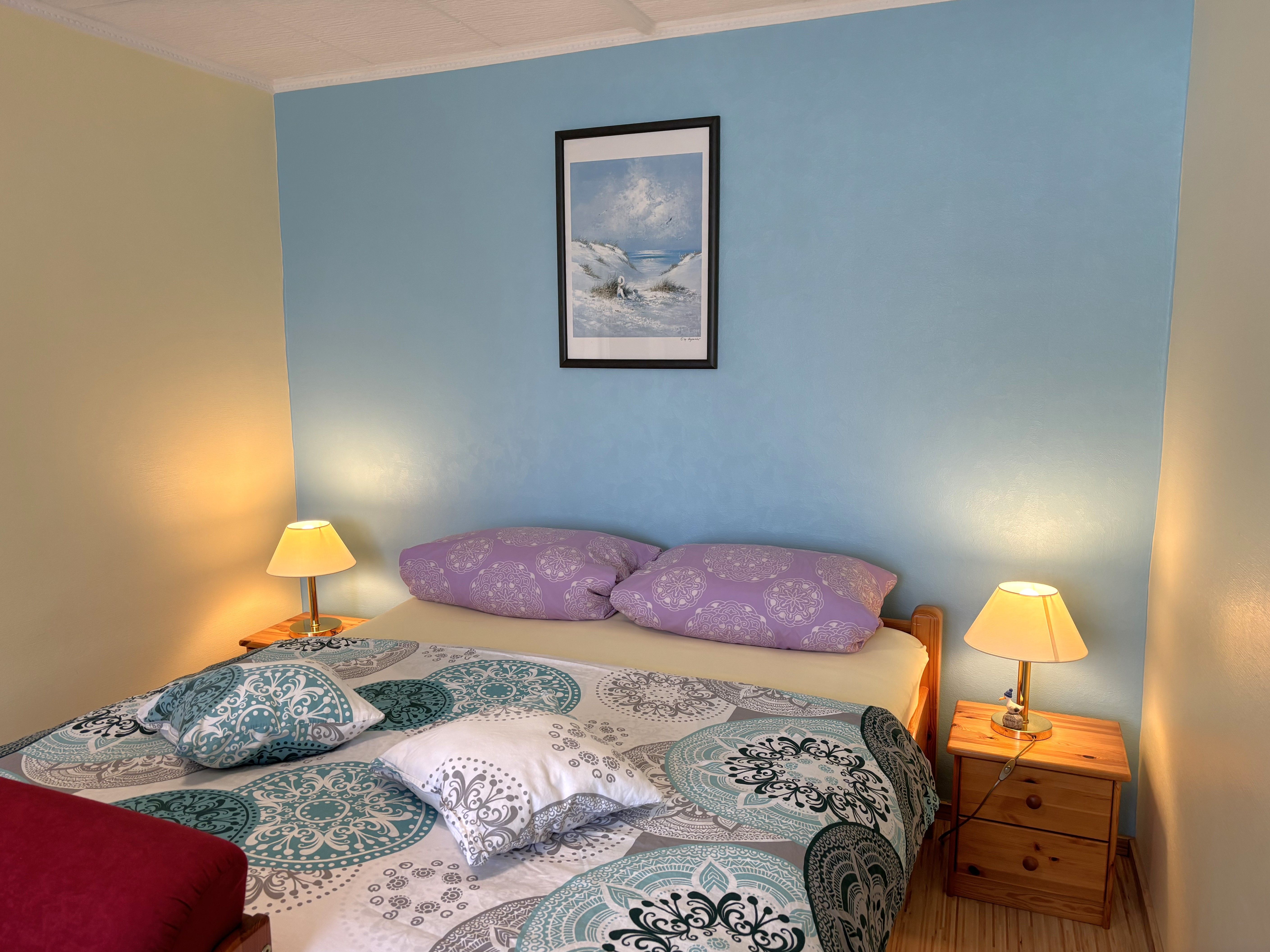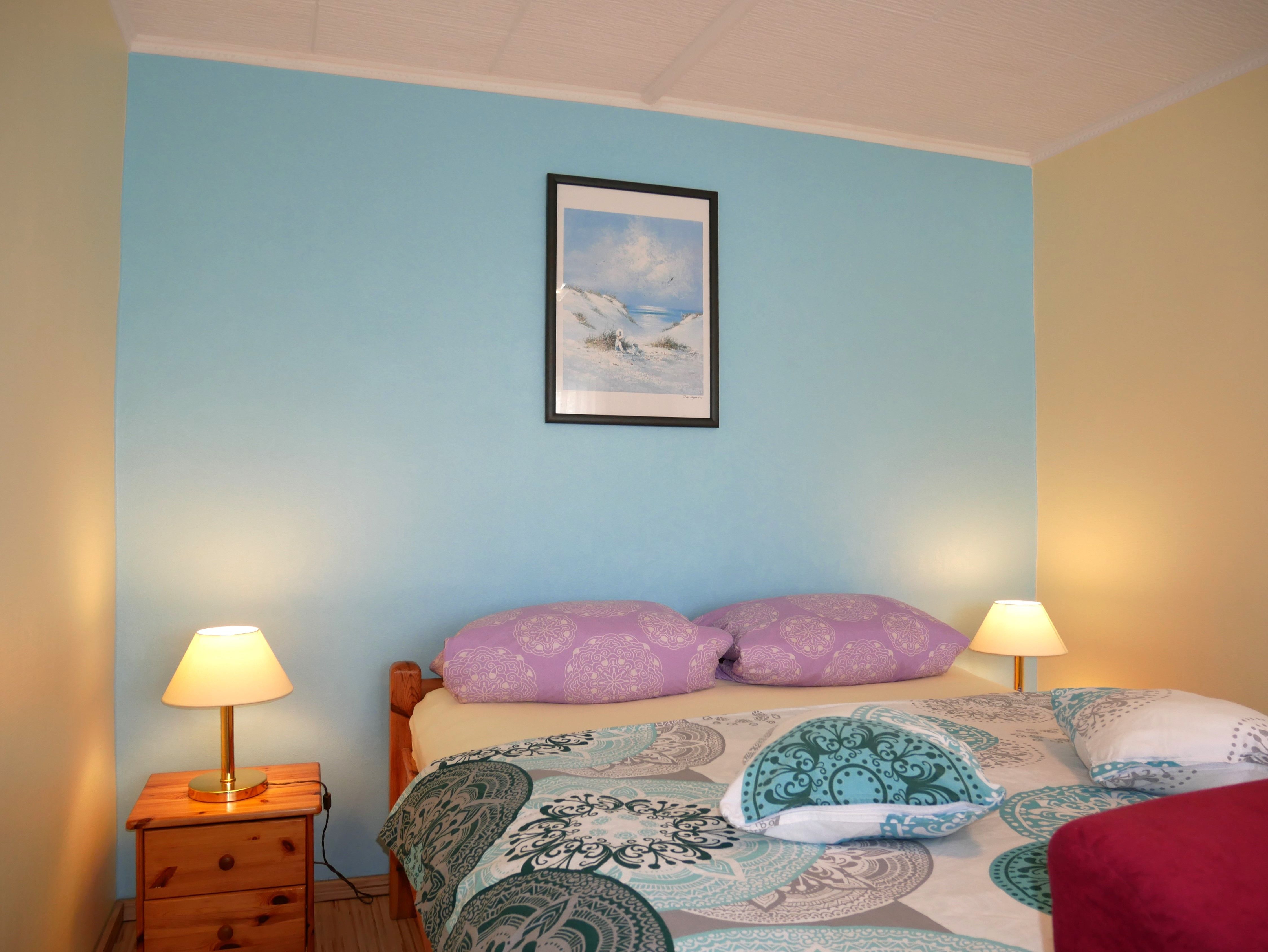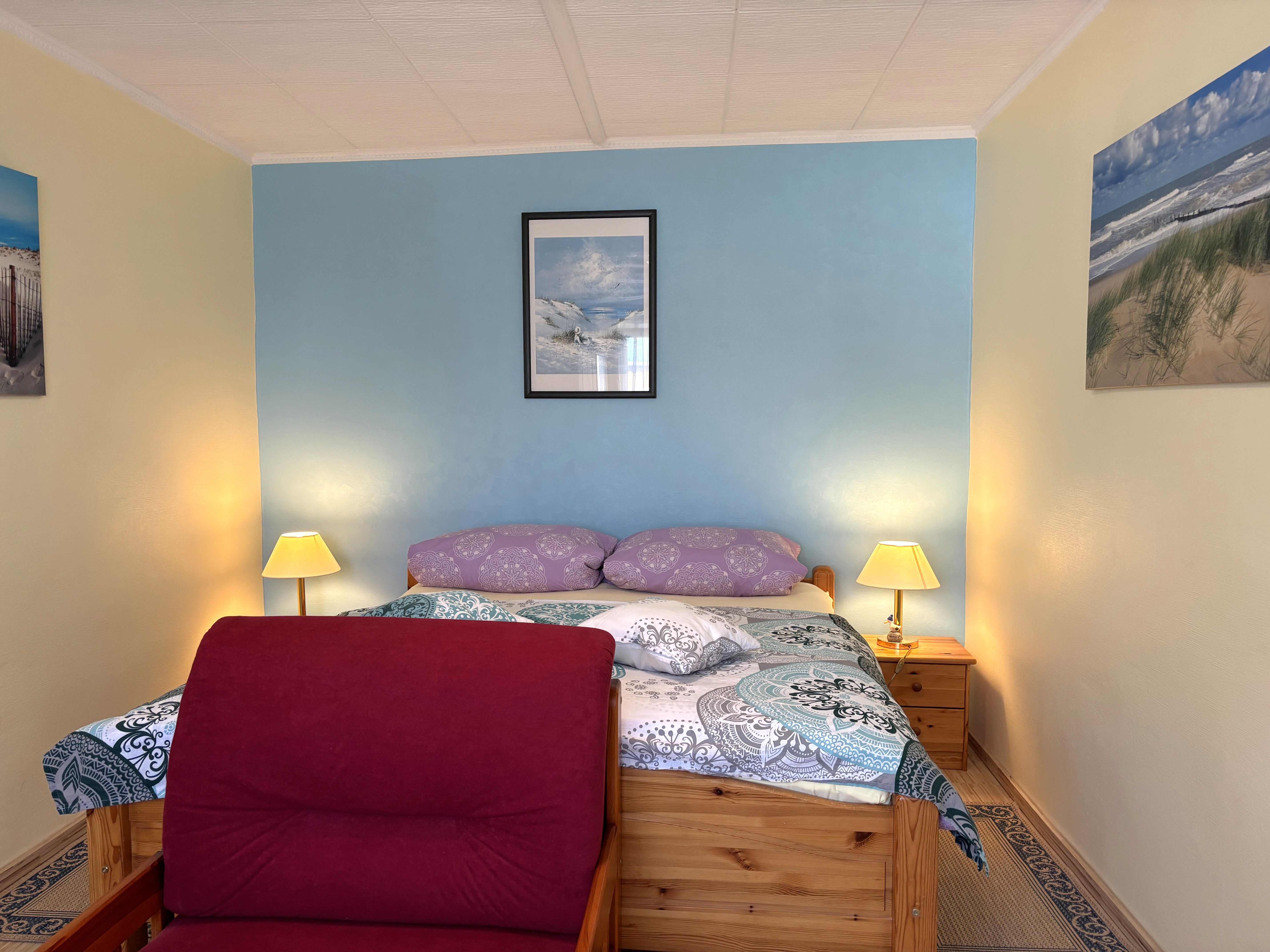Das zweite Schlafzimmer bietet ein französisches Bett (1,60x2,00m) mit durchgehender Matratze und verstellbarem Kopfteil ideal für erholsamen Schlafkomfort.