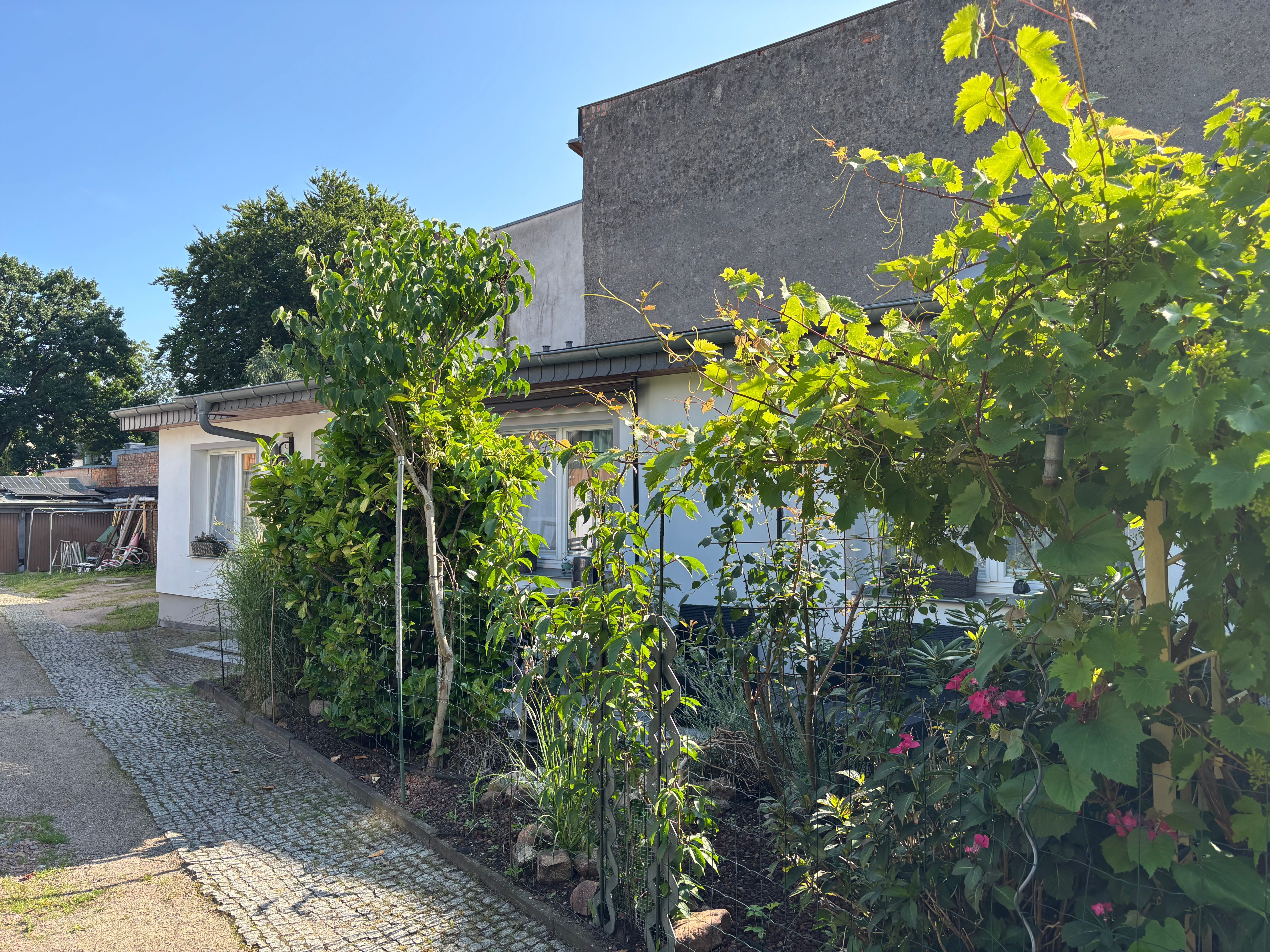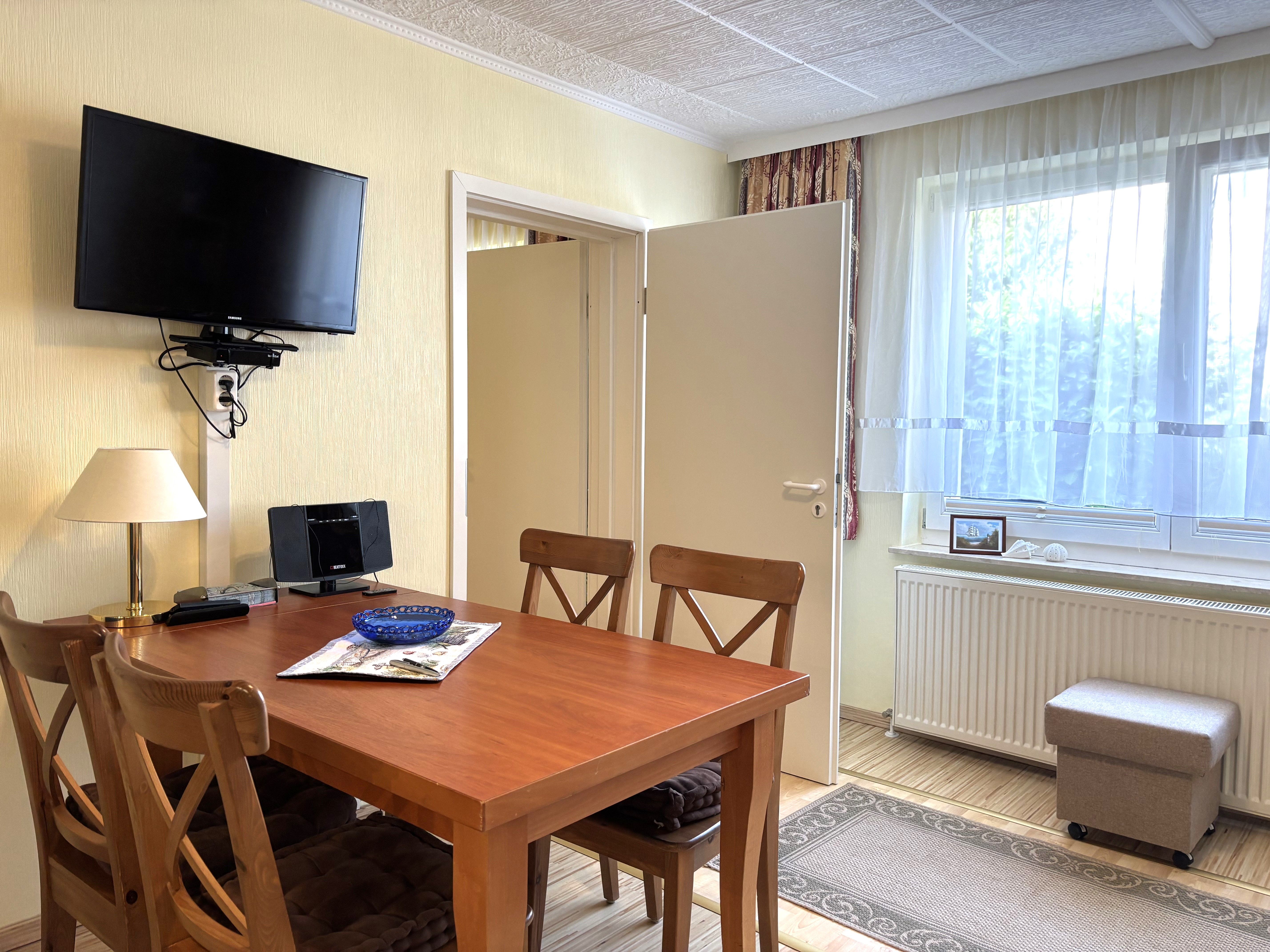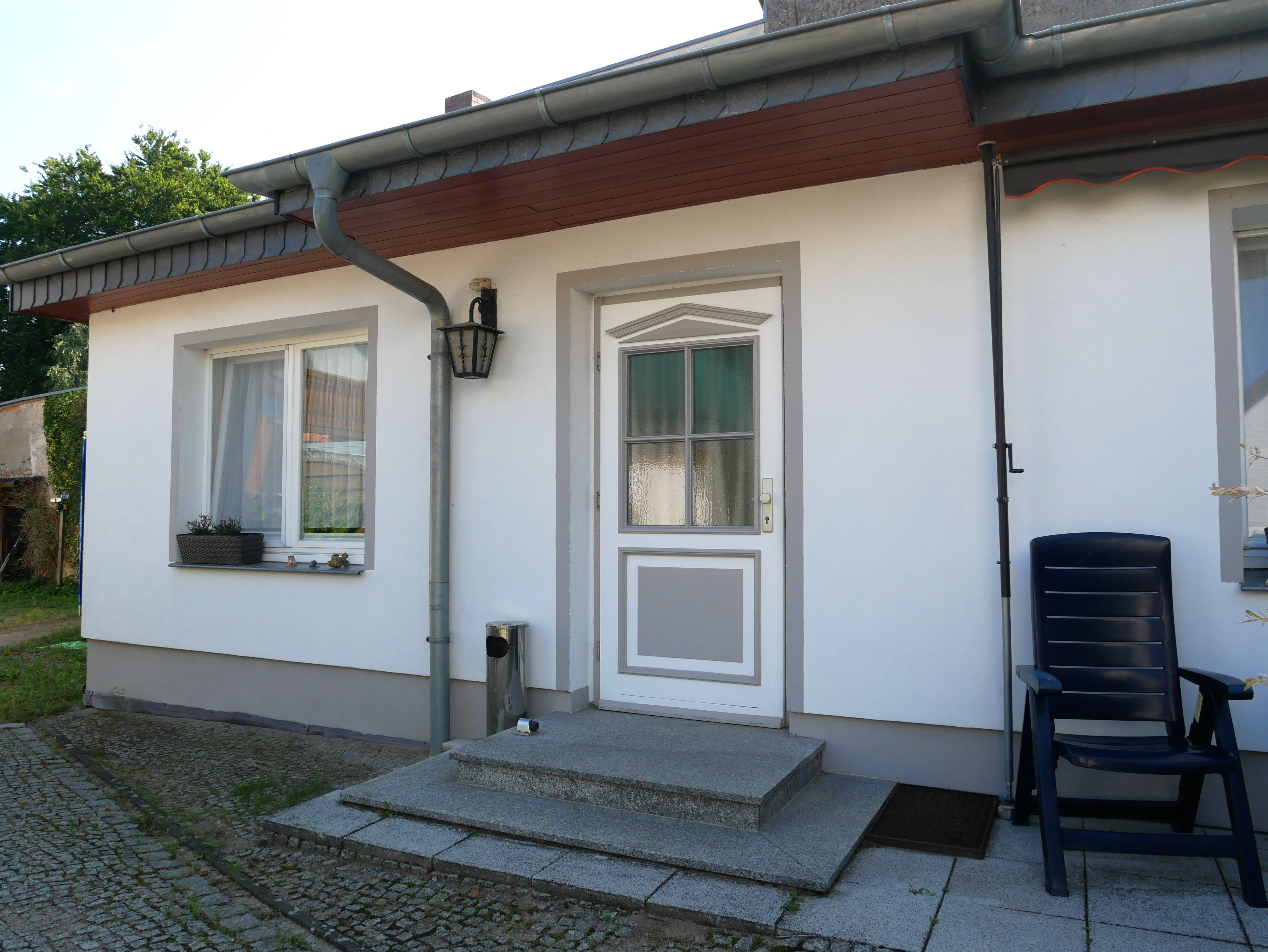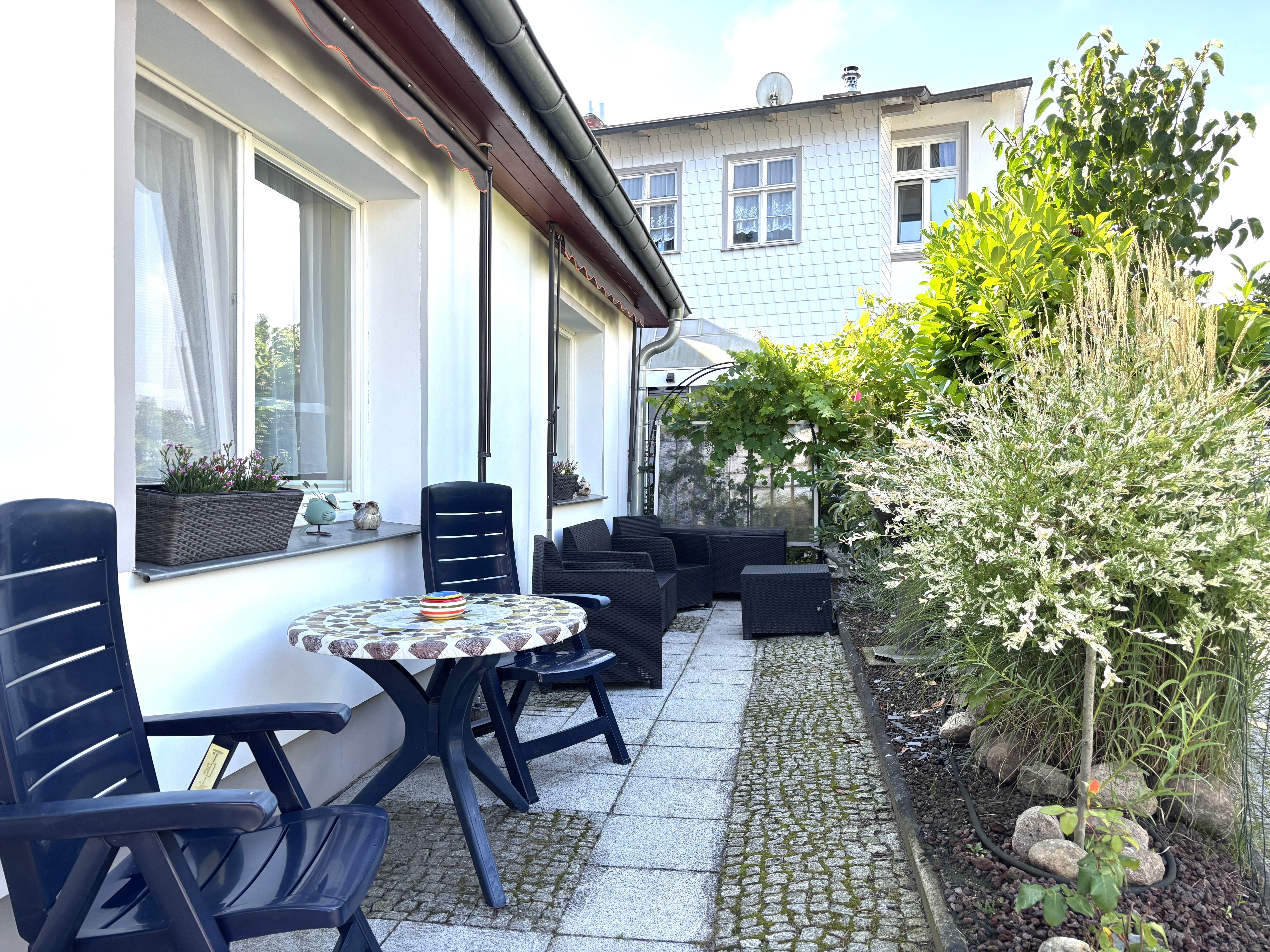 Die Wohnung hat einen eigenen Eingang, der über zwei Stufen erreichbar ist. Direkt vor der Wohnung lädt eine möblierte Terrasse mit Gartenmöbeln und Grill zum Verweilen im Freien ein perfekt für entspannte Stunden an der frischen Ostseeluft.