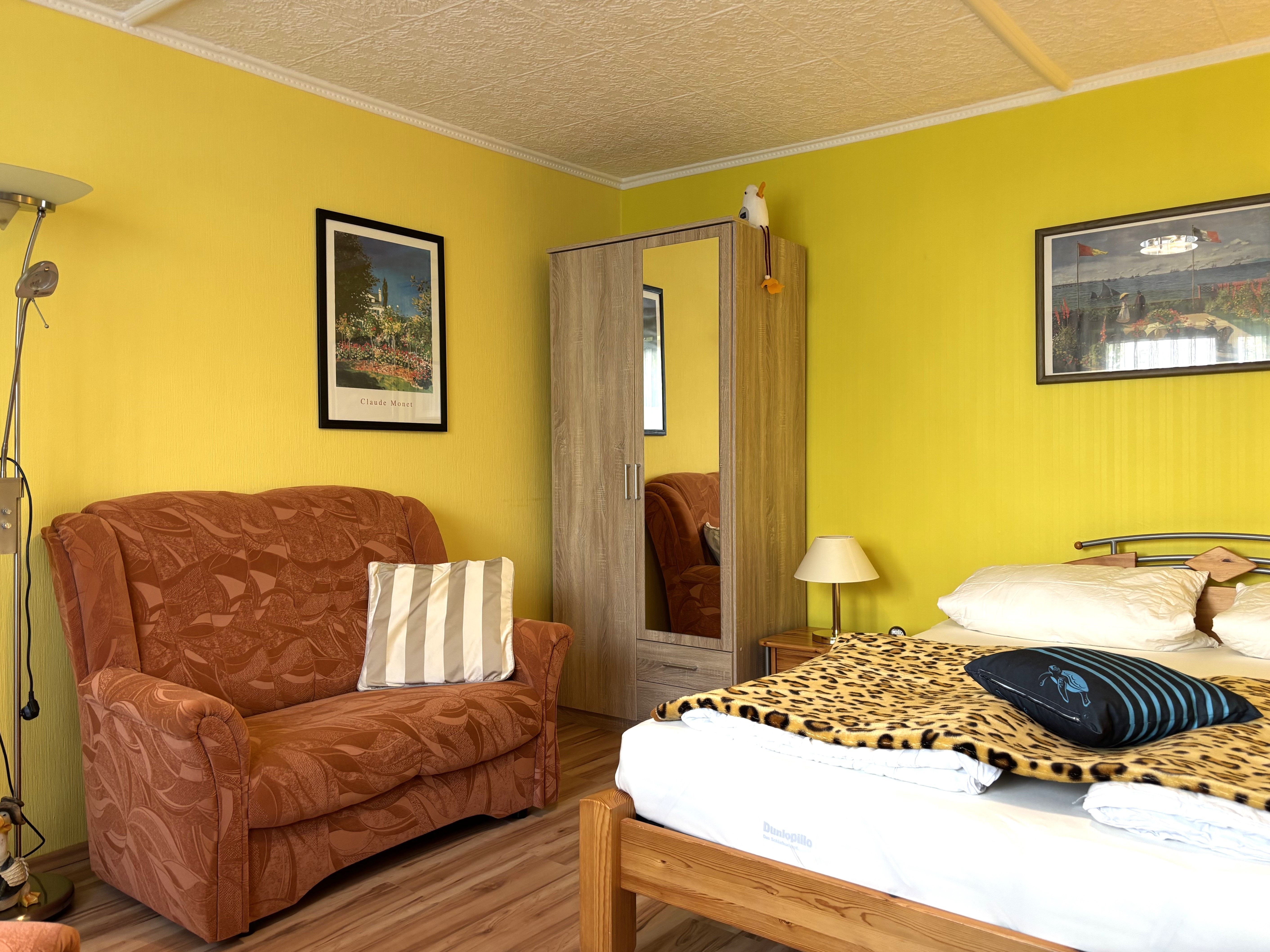 Ein Schlafzimmer ist mit einem Doppelbett ausgestattet und dient gleichzeitig als kombiniertes Wohn- und Schlafzimmer. Hier finden Sie zusätzlich eine gemütliche Couch sowie einen Fernseher für entspannte Abende.