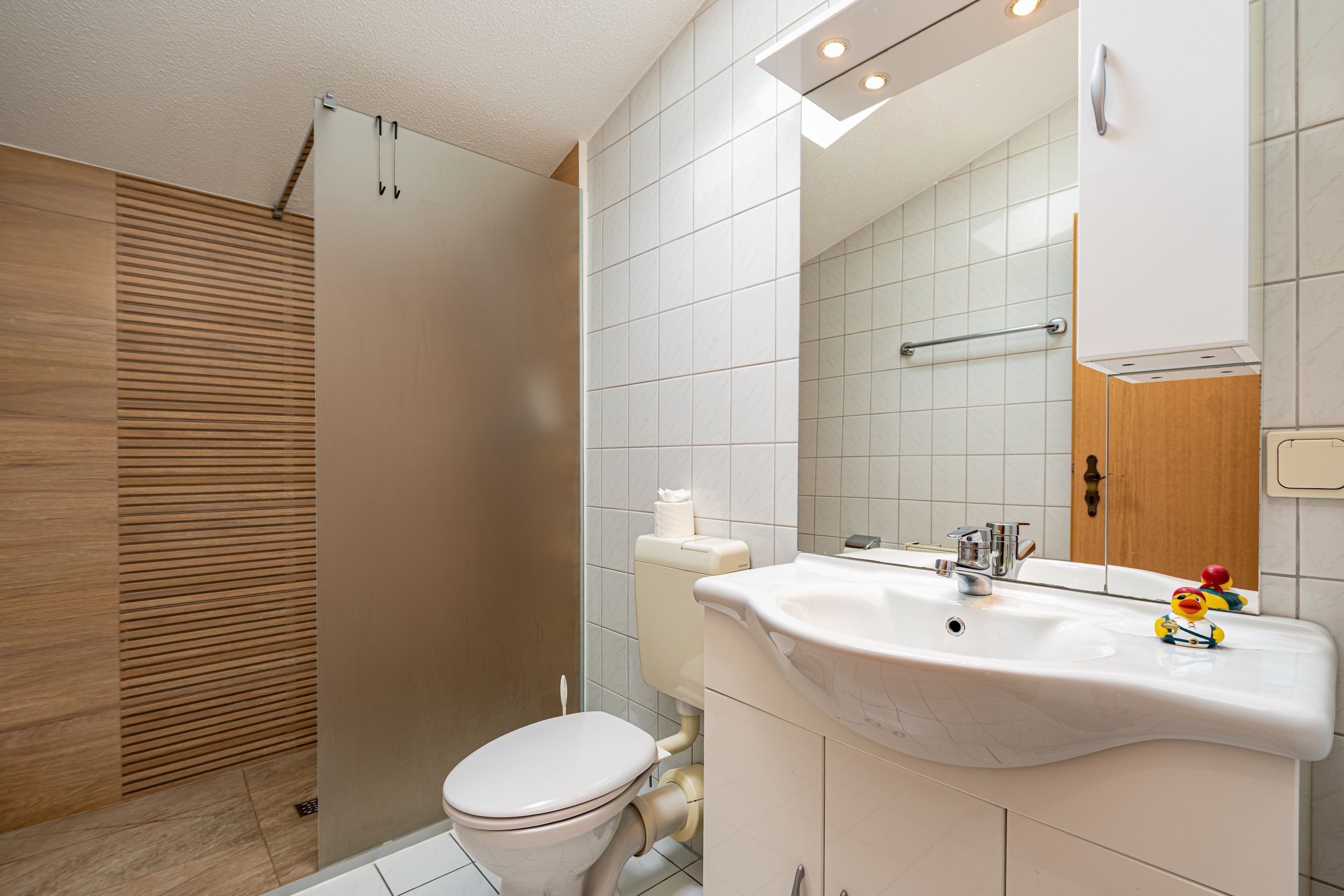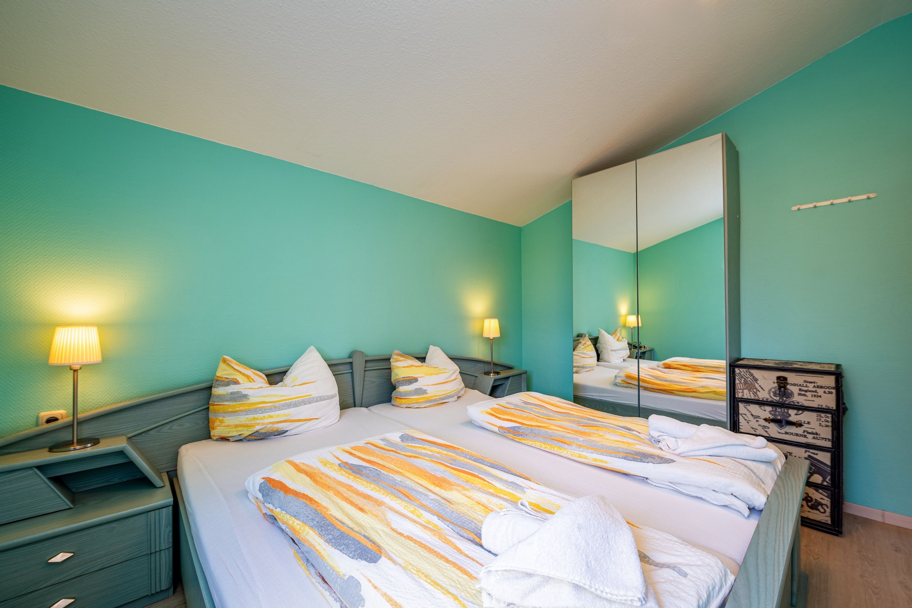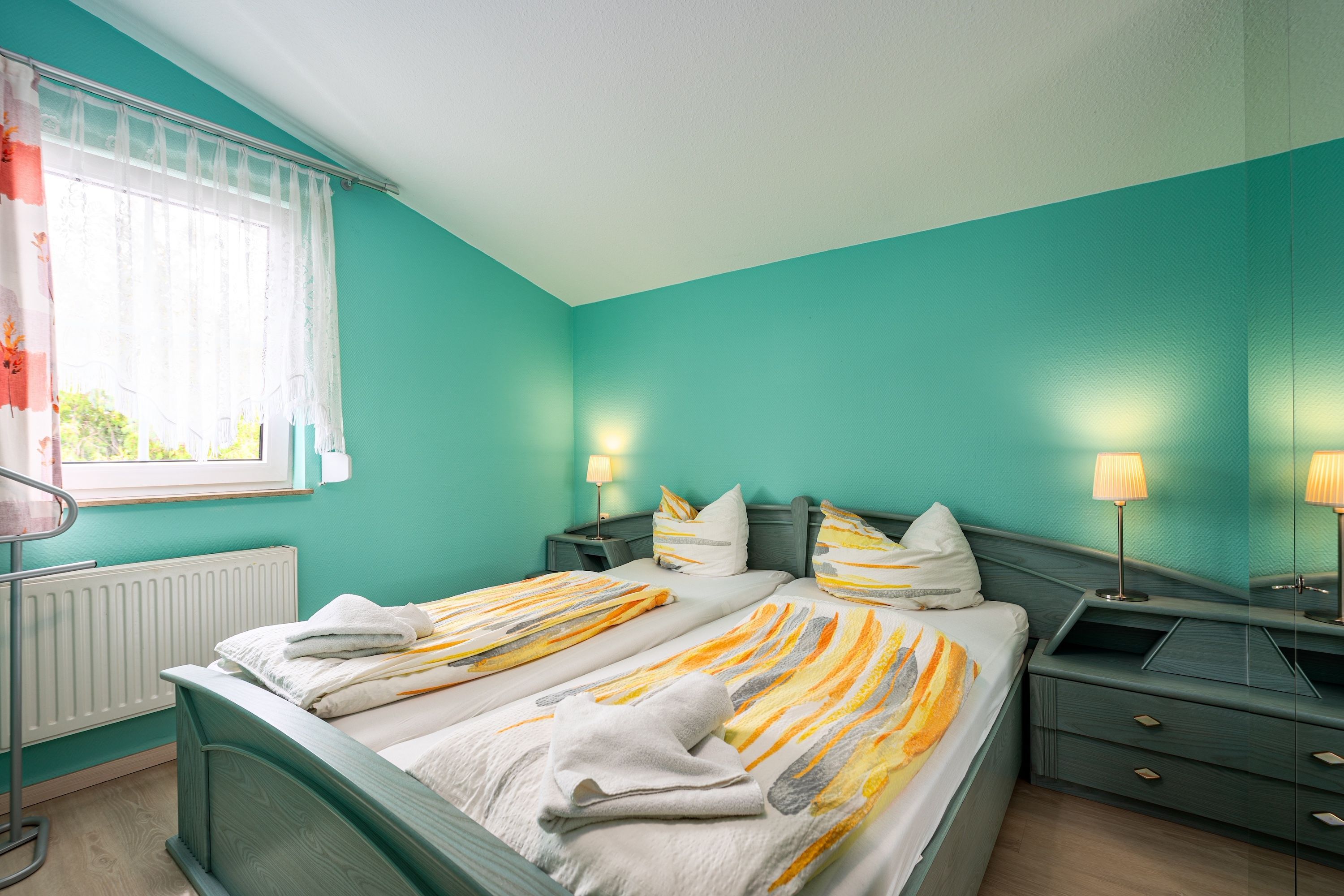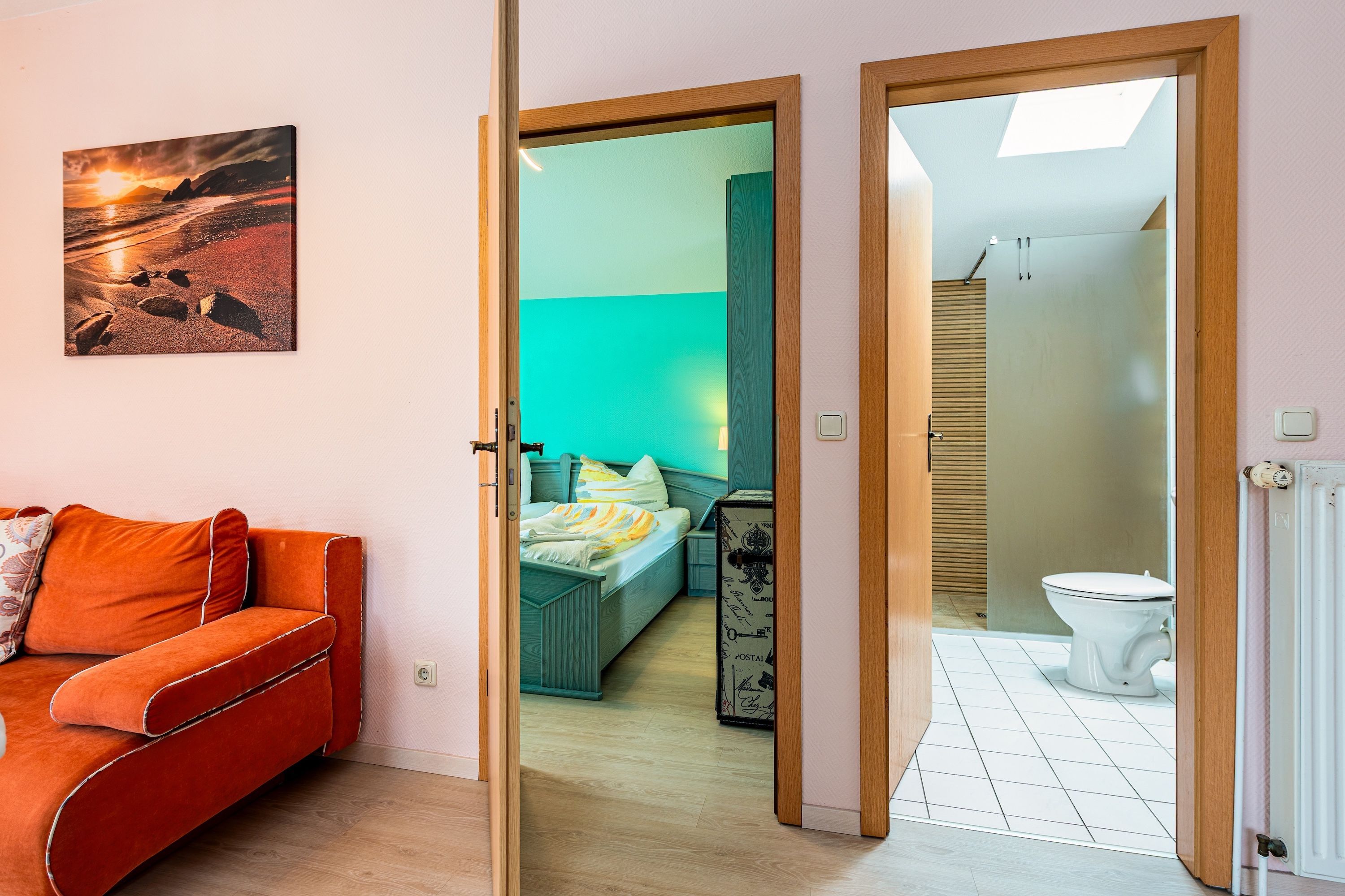 Das Schlafzimmer lädt mit seiner ruhigen Atmosphäre zum Träumen ein nach einem Tag am Meer, nach einem Waldspaziergang oder einem Cafébesuch im Ort. Im modernen Badezimmer finden Sie alles, was Sie für Ihre tägliche Wohlfühlroutine brauchen funktional, gepflegt und mit Liebe zum Detail.