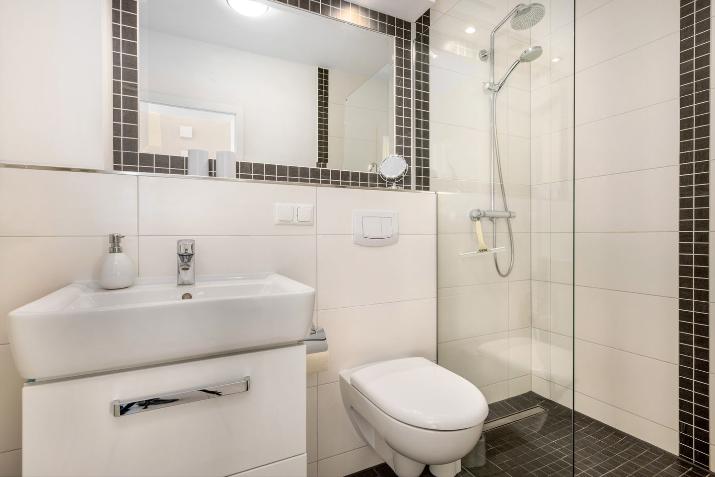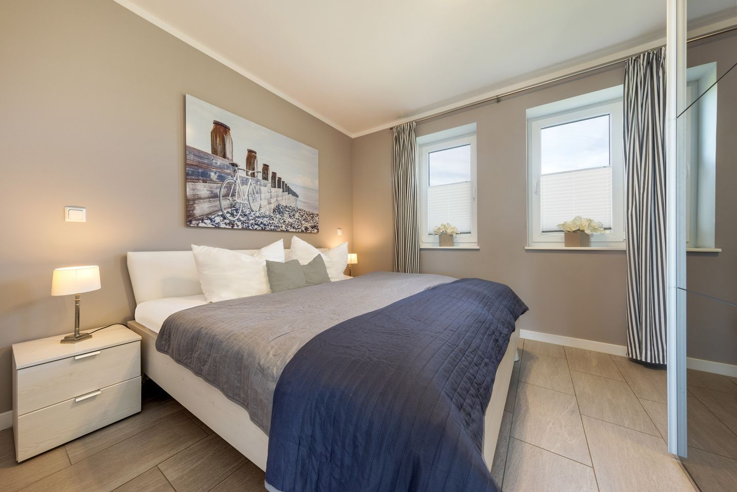 Auf 68 qm haben bis zu vier Gäste ausreichend Platz, die in den zwei stilvoll eingerichteten und mit je einem Doppelbett ausgestatteten Schlafzimmern, eines davon mit en suite-Bad, ihre Nachtruhe finden. Insgesamt verfügt die Ferienwohnung über zwei Bäder mit jeweils einer bodengleichen Dusche.