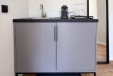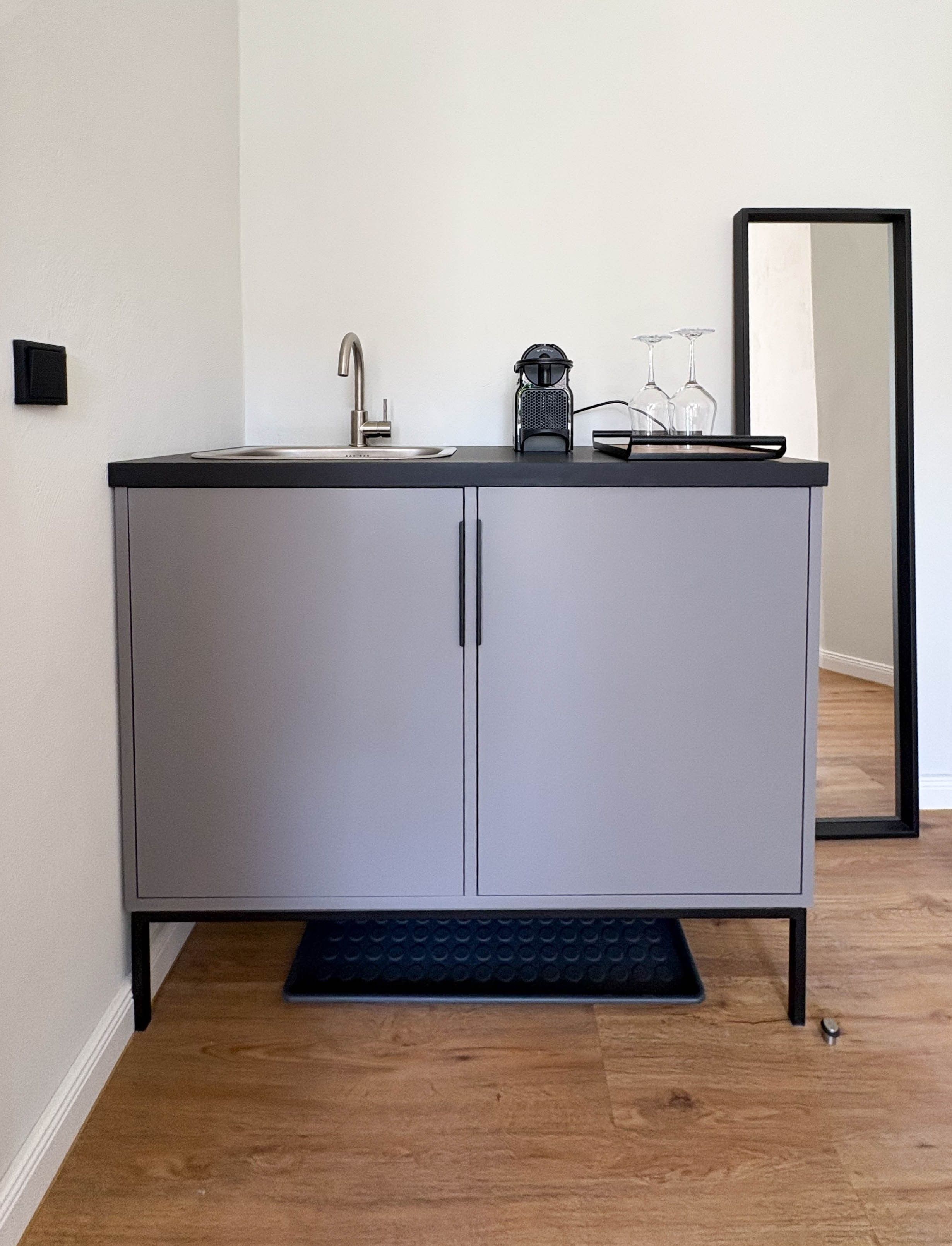 Das Apartment teilt sich mit den anderen Apartments eine Gemeinschaftsküche, welche sich auf dem Flur und abgeschlossen von Bereichen außerhalb der Apartments befindet.