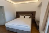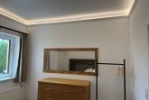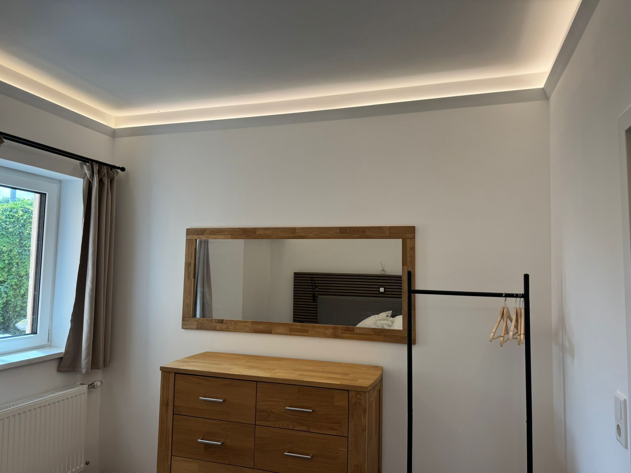 Schlafzimmer - Ruhe & Erholung: bequemes Boxspringbett mit Ambiente-Licht & Hintergrundbeleuchtung, Leselampen, Kommode & Kleiderständer, Verdunkelungsvorhänge & Thermo-Plissees für erholsamen Schlaf, Schallschutzfenster für angenehme Ruhe. Kinderbett auf Anfrage.