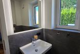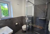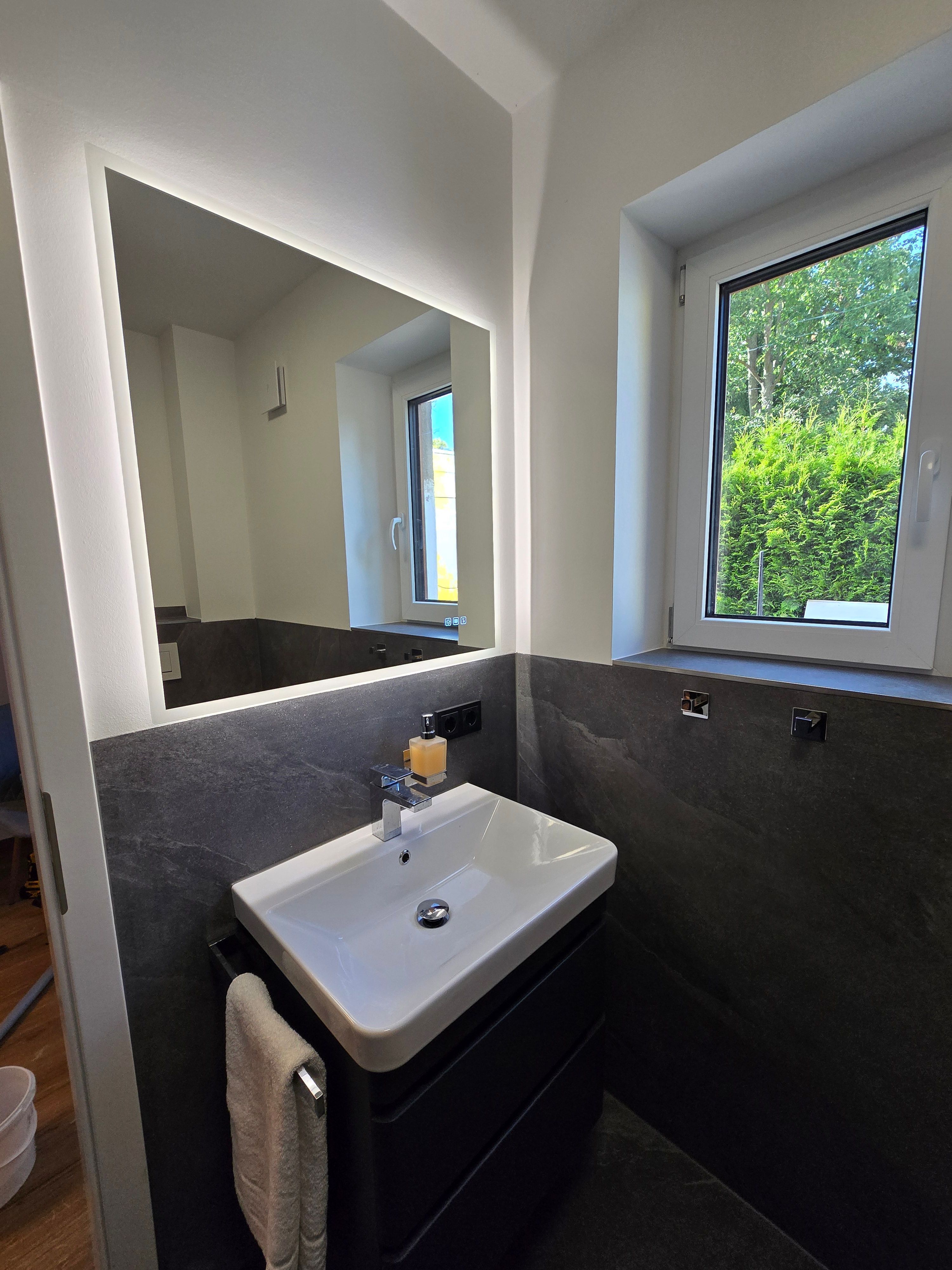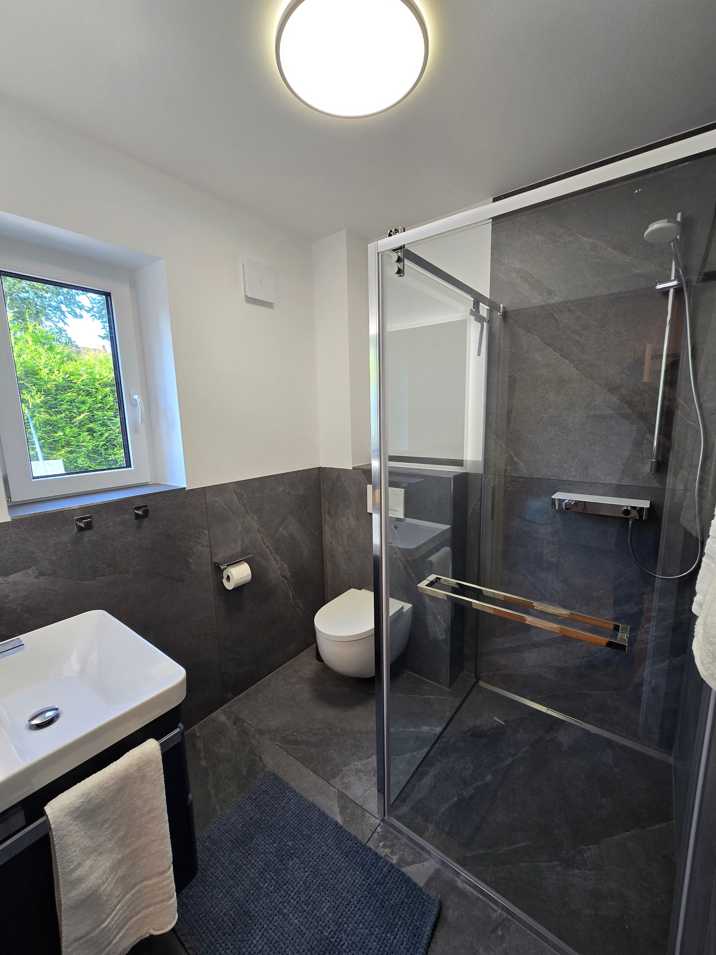 Badezimmer - Wellness für jeden Tag: ebenerdige Dusche mit großformatigen Fliesen und Massageduschkopf, Multifunktionsspiegel mit Bluetooth-Lautsprecher, Spiegelheizung & Beleuchtung, moderne Fußbodenheizung, automatische Abluftanlage, stilvoller Handtuchhalter & Seifenspender